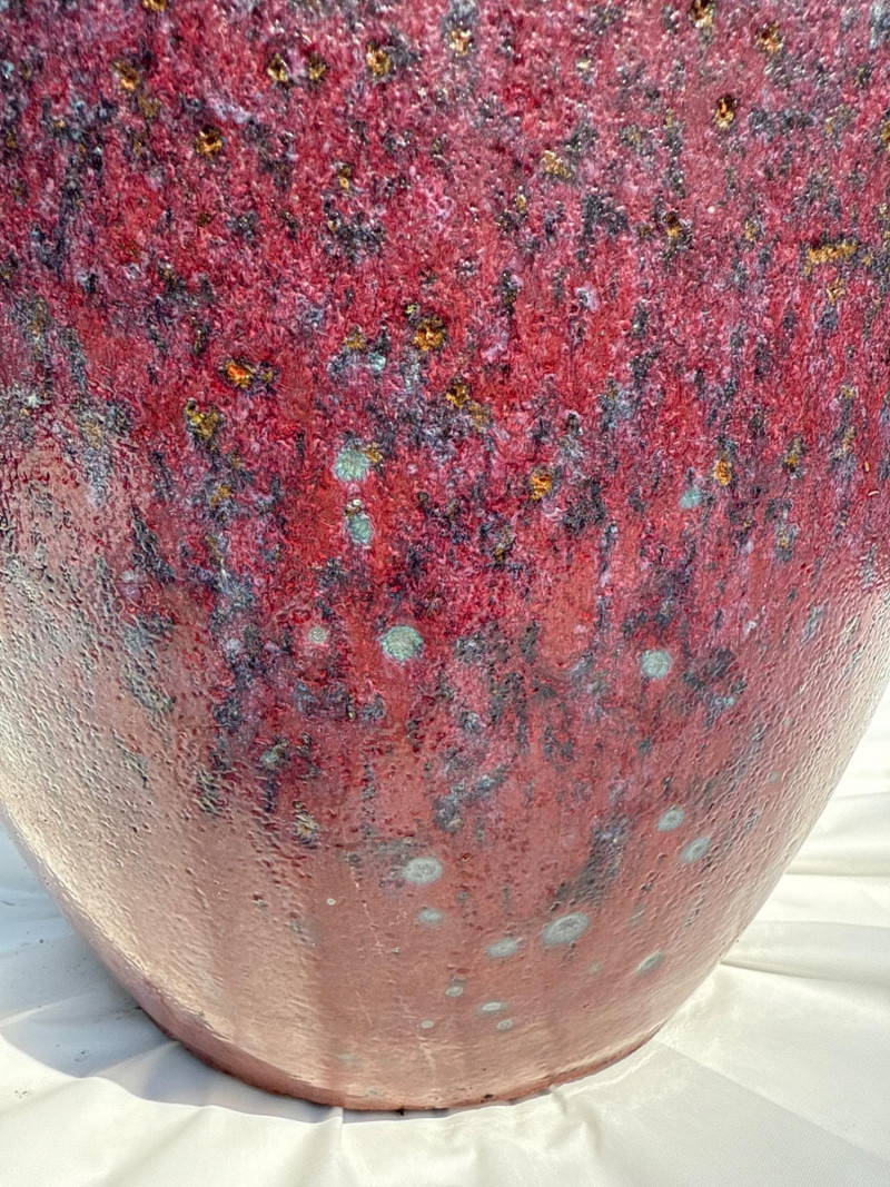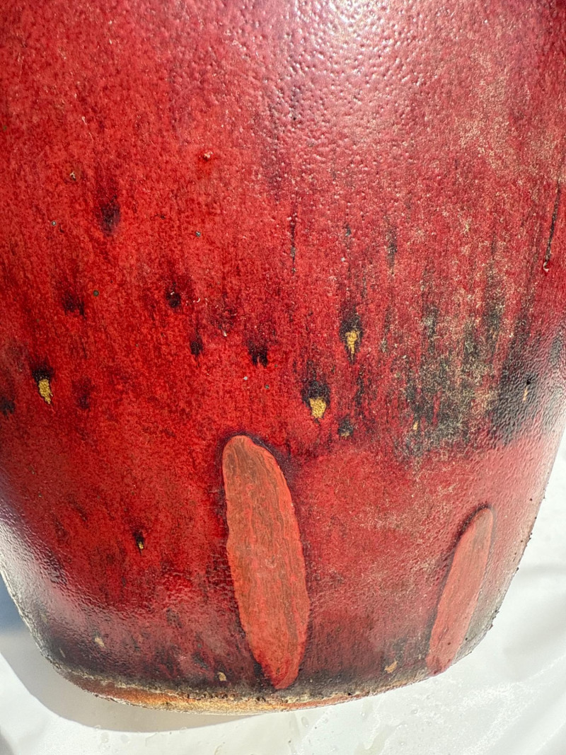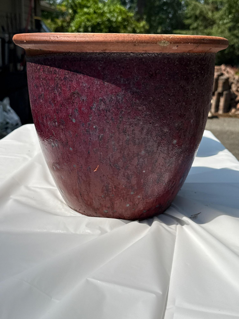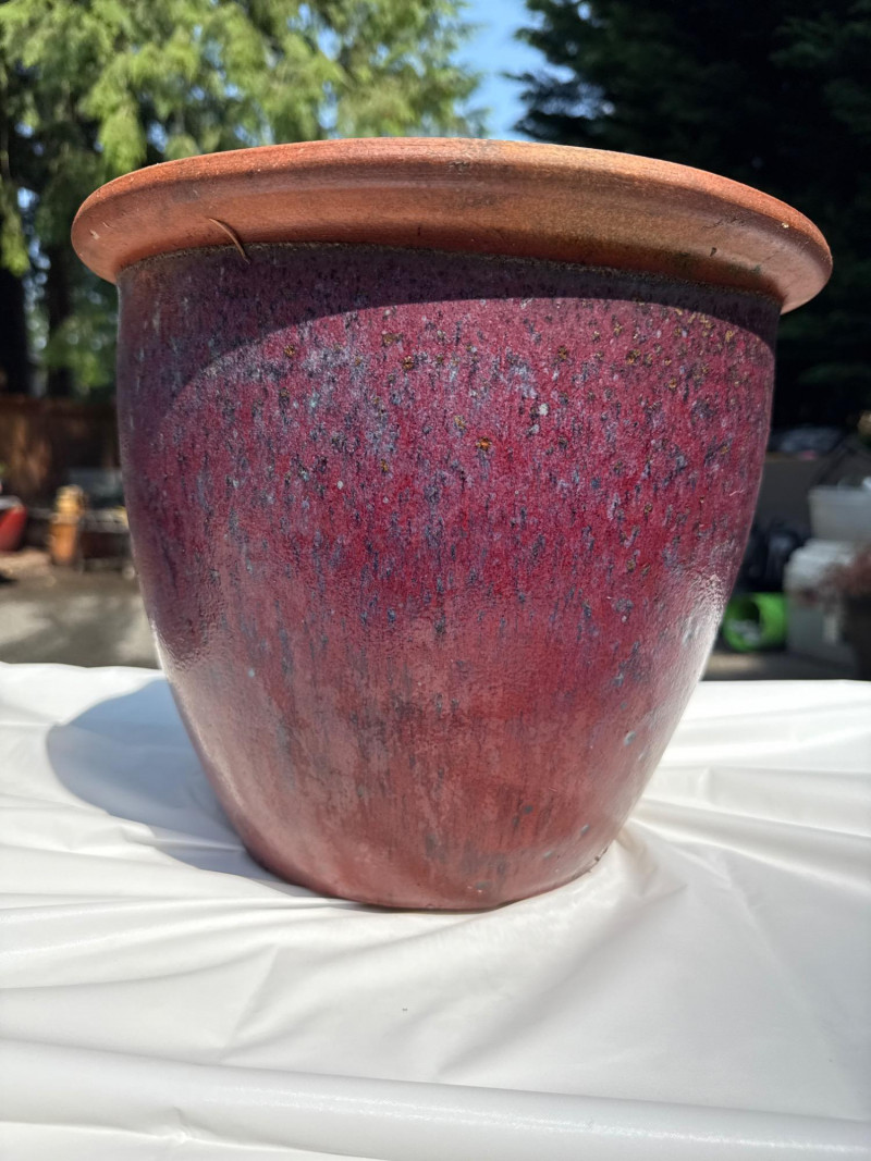 Red glazed ceramic plant pots. Three pots in good condition. Variety of color variations. Rims are not glazed Largest is 10.5in Tall and 12in wide