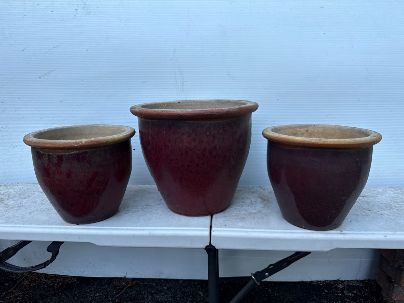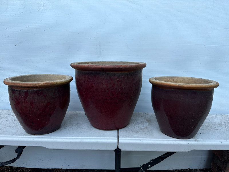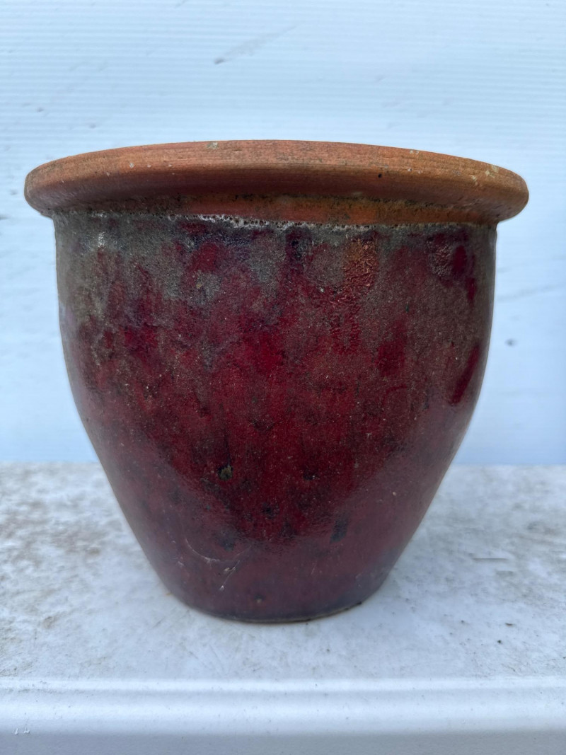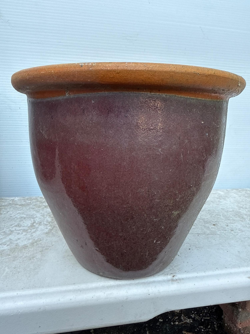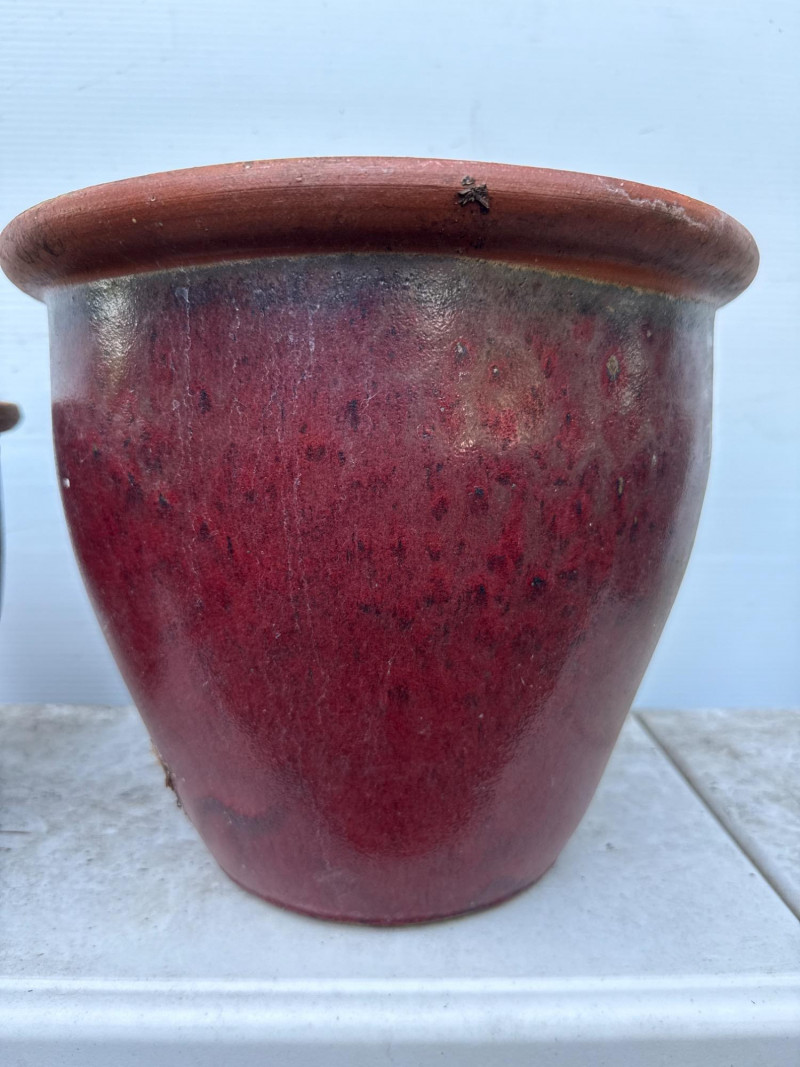 Quality ceramic glazed clay pots. Rims are brown and unglazed. Color variations In good condition. Two sizes. Small are 8in tall, 9.5in wide.