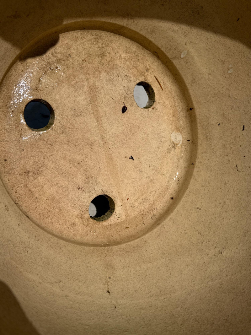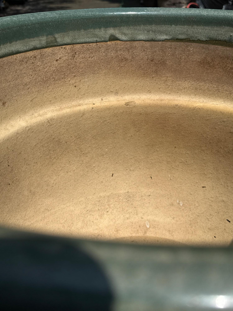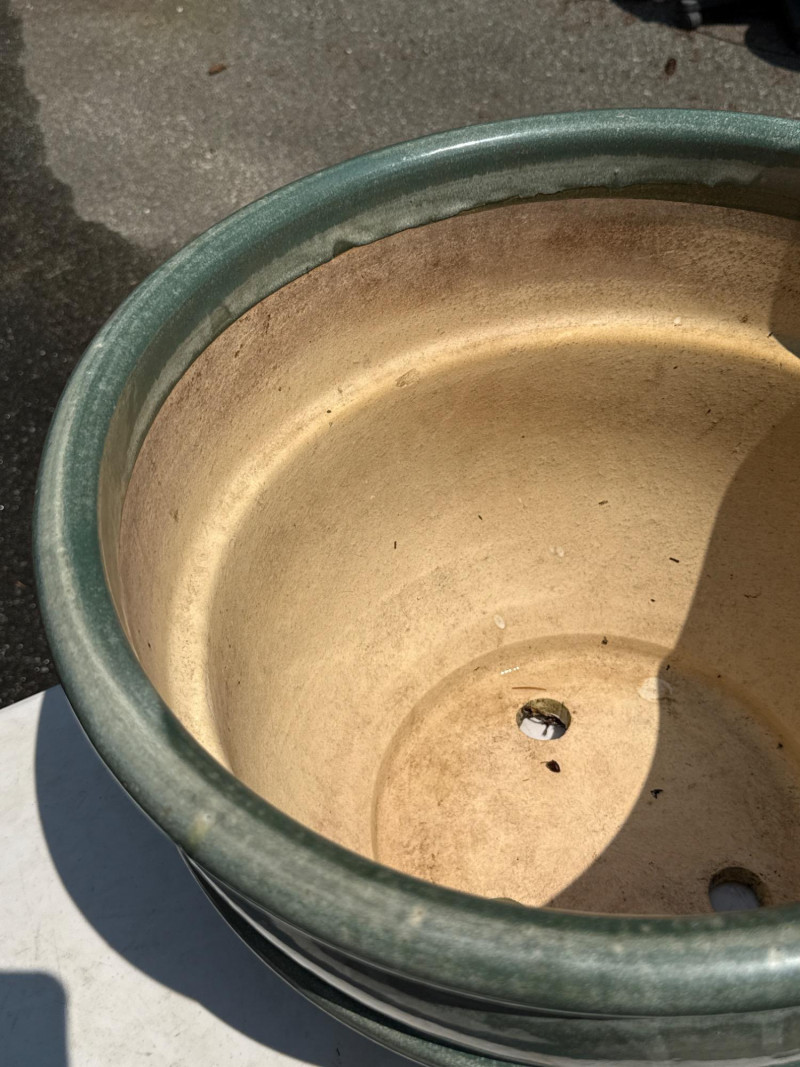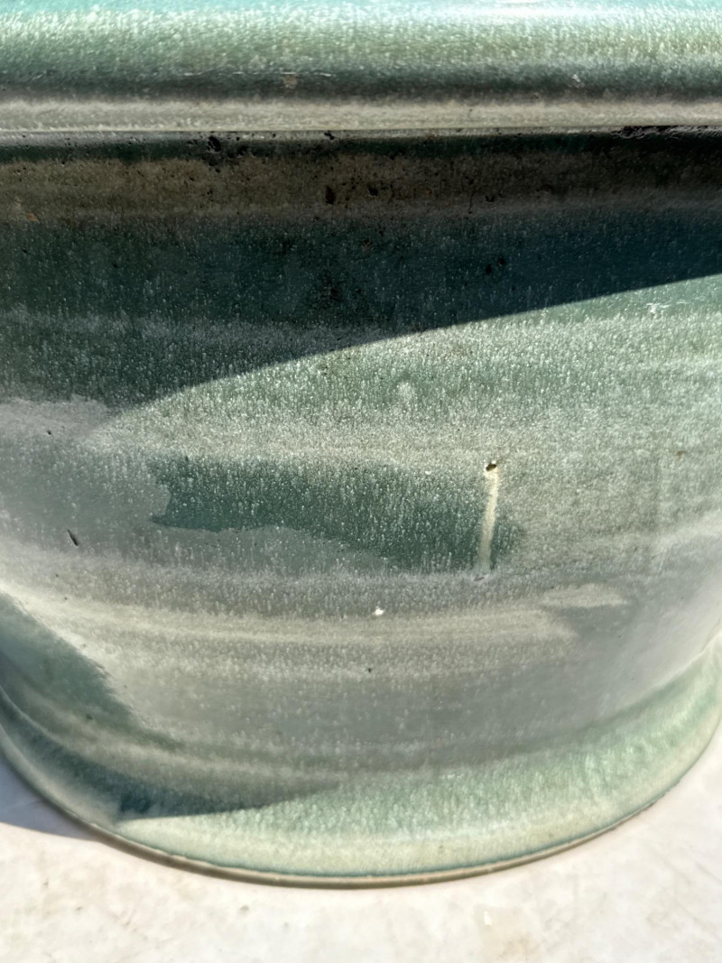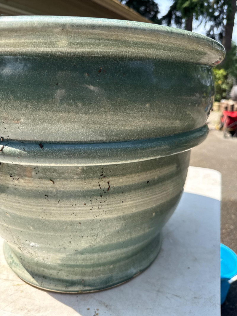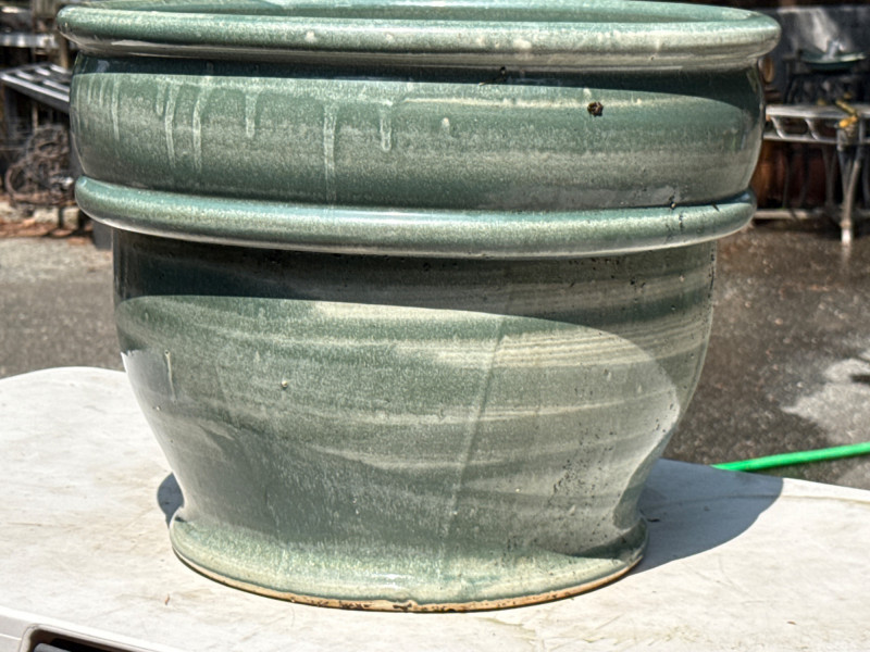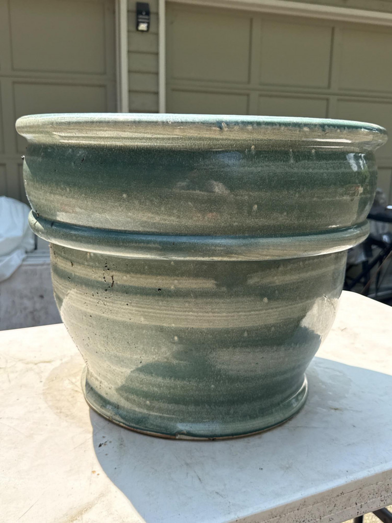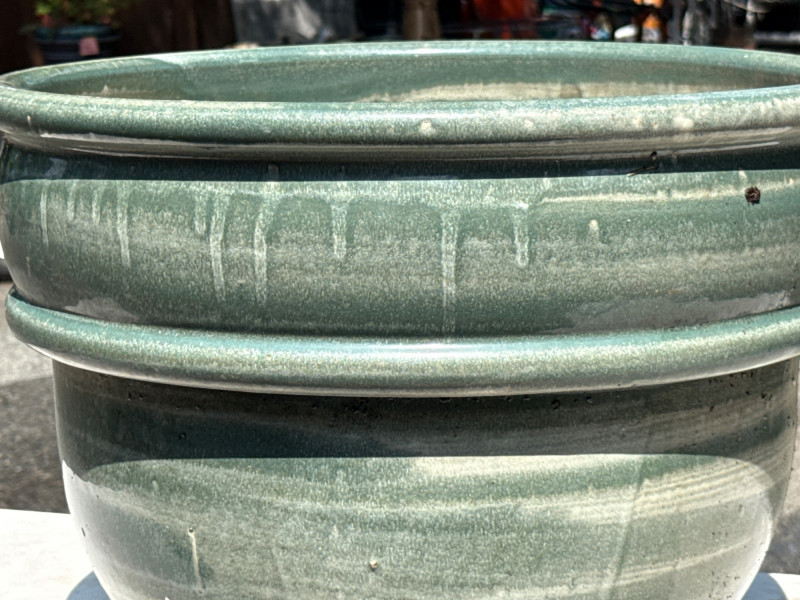 Beautiful, heavy glazed plant pot. Great color variations and quality. Some stripe/wave effect No drip pan.