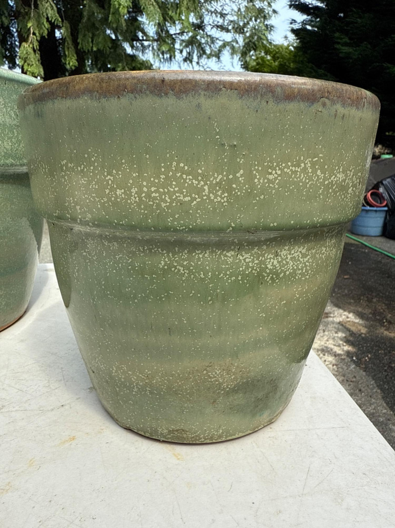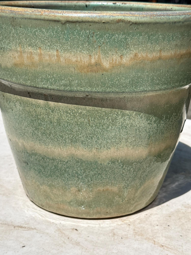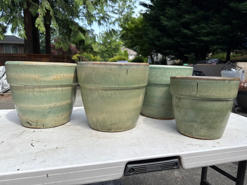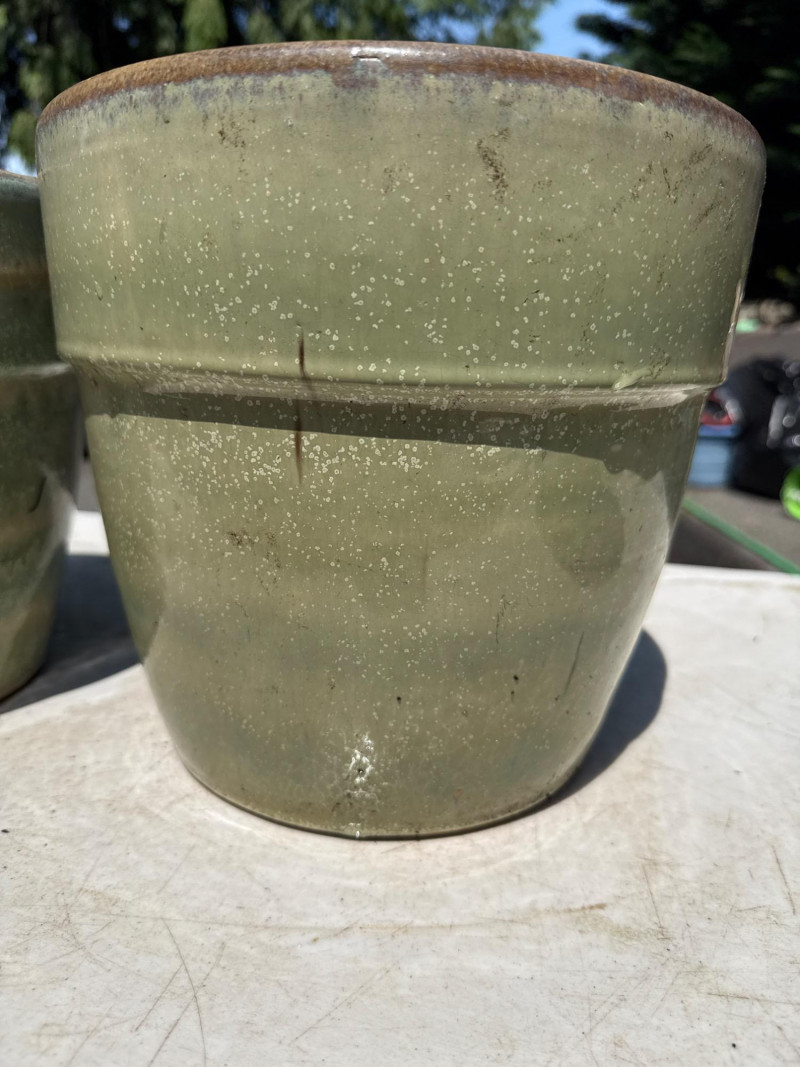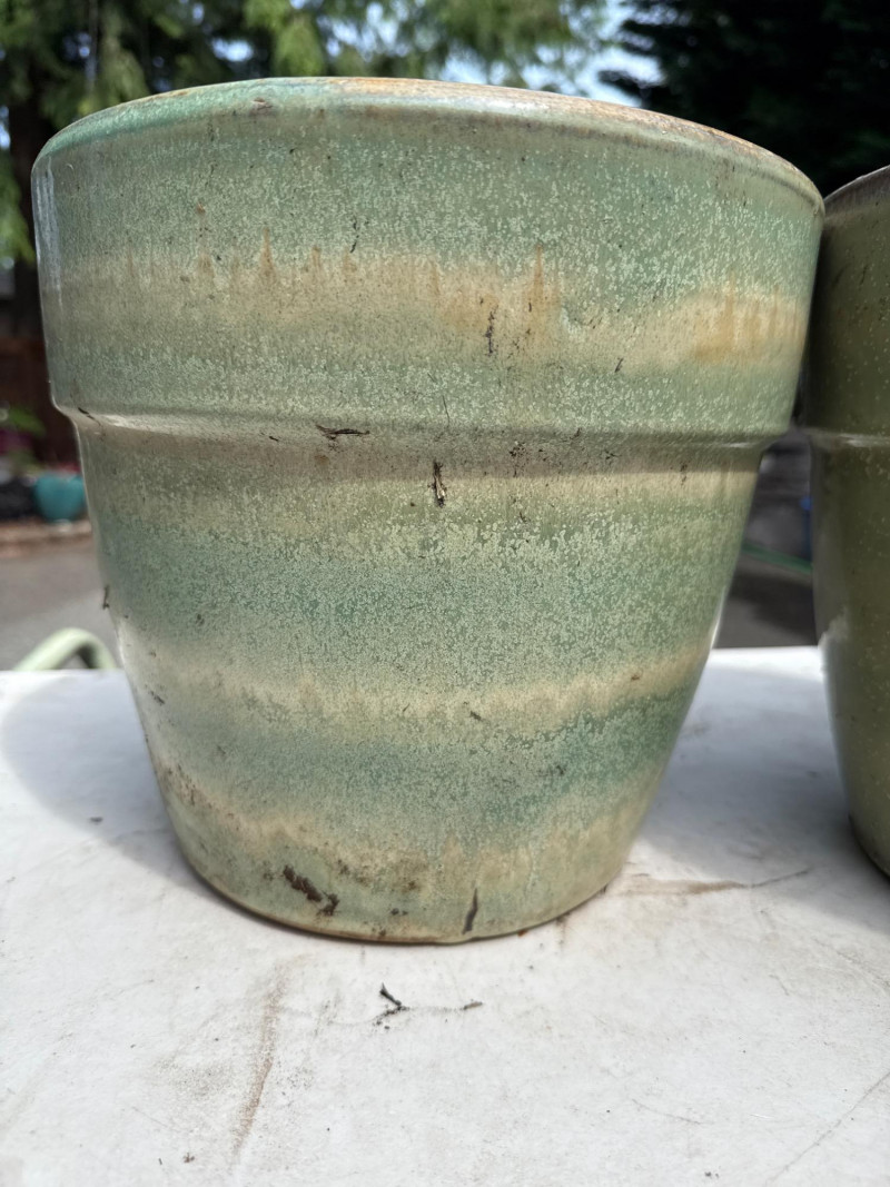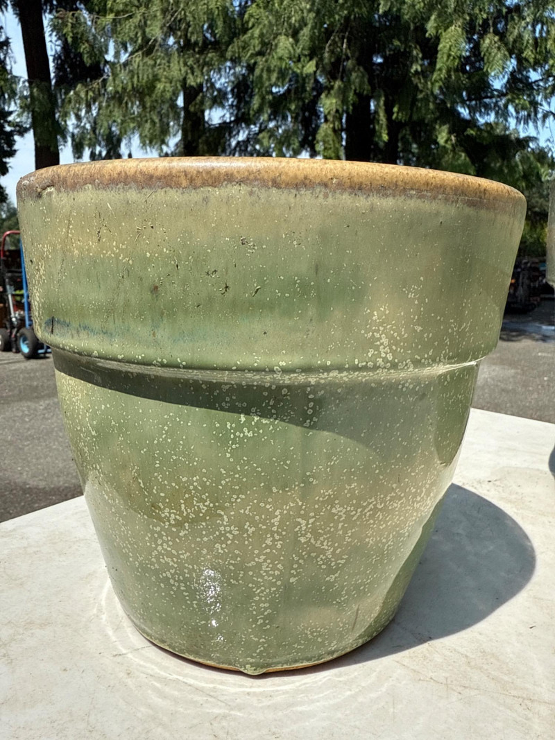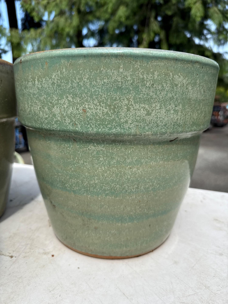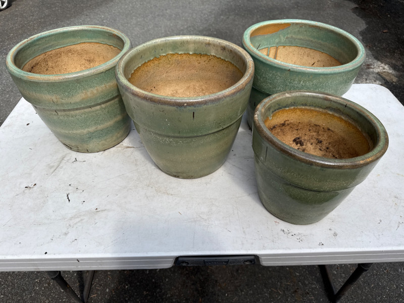 Four ceramic pots with green and brown colors. No plant drip trays. Heavy clay with glaze coating. Largest is 10in tall, 10.5in wide.