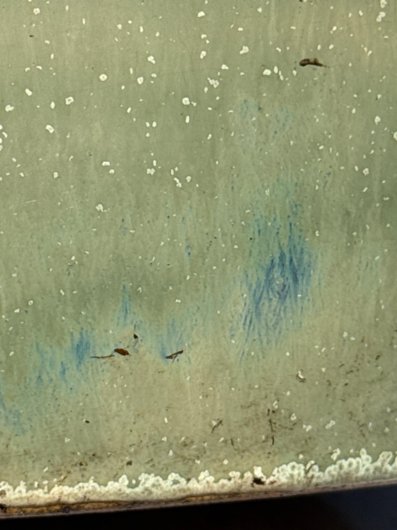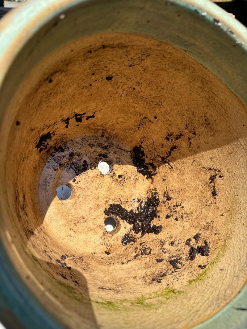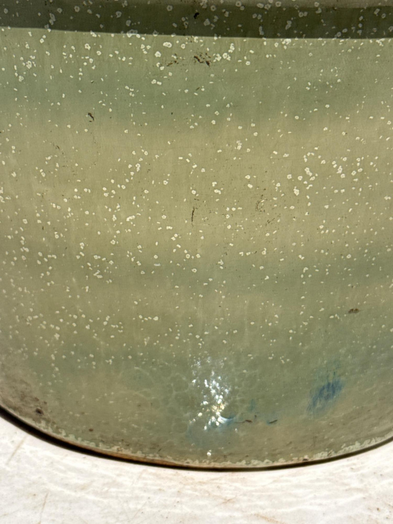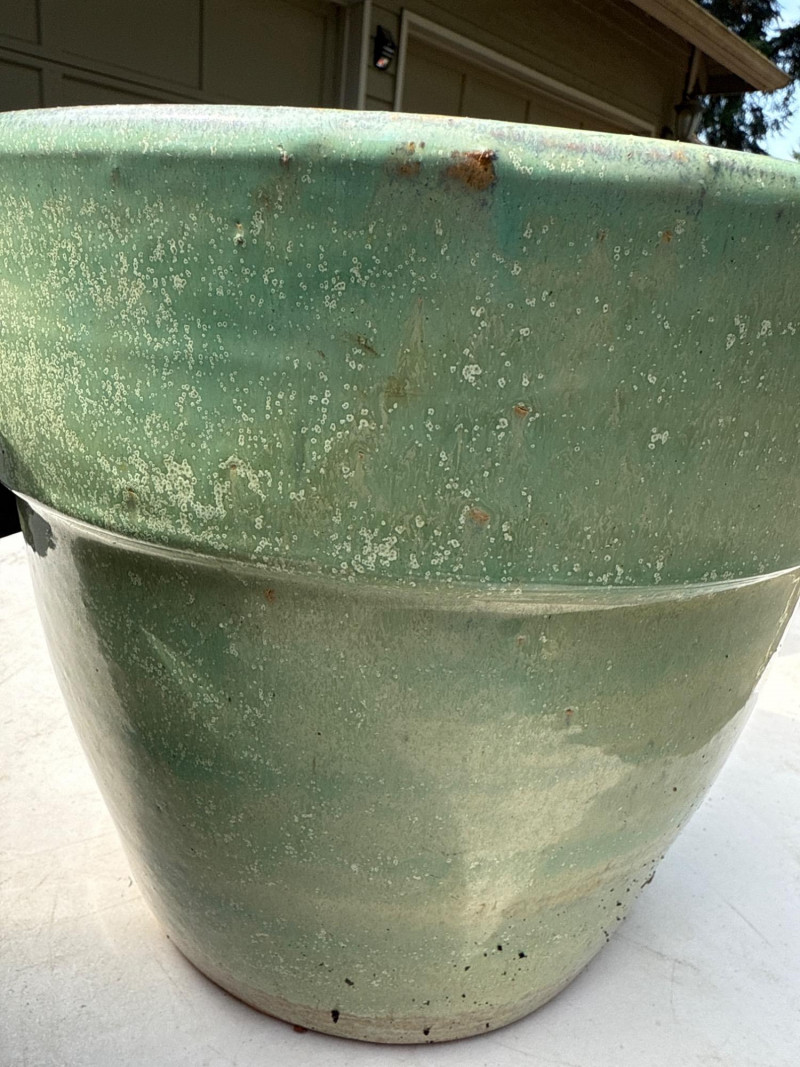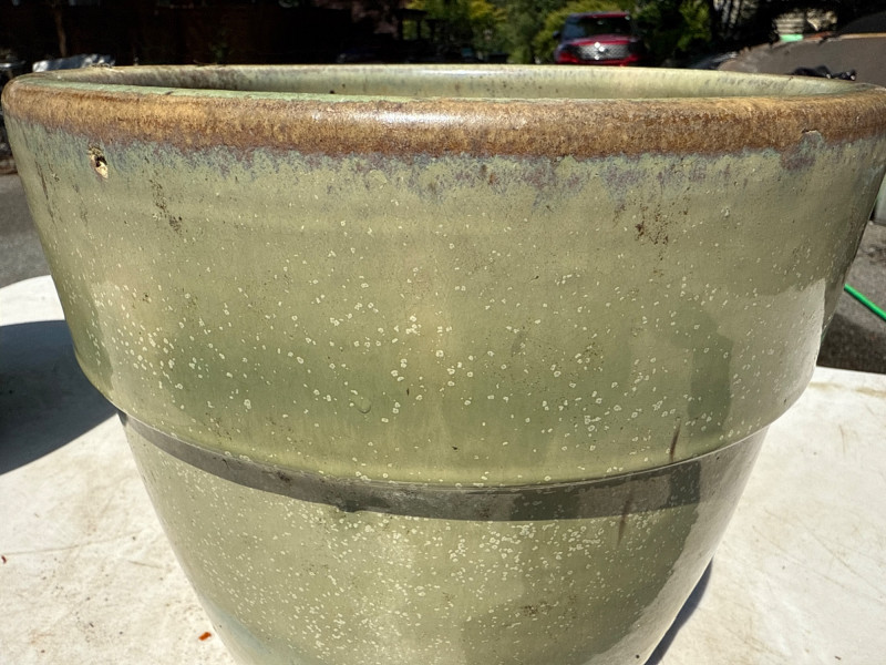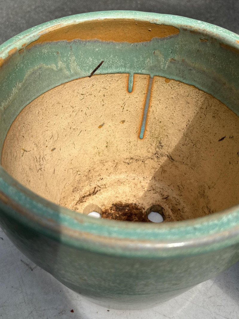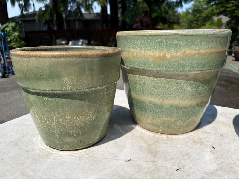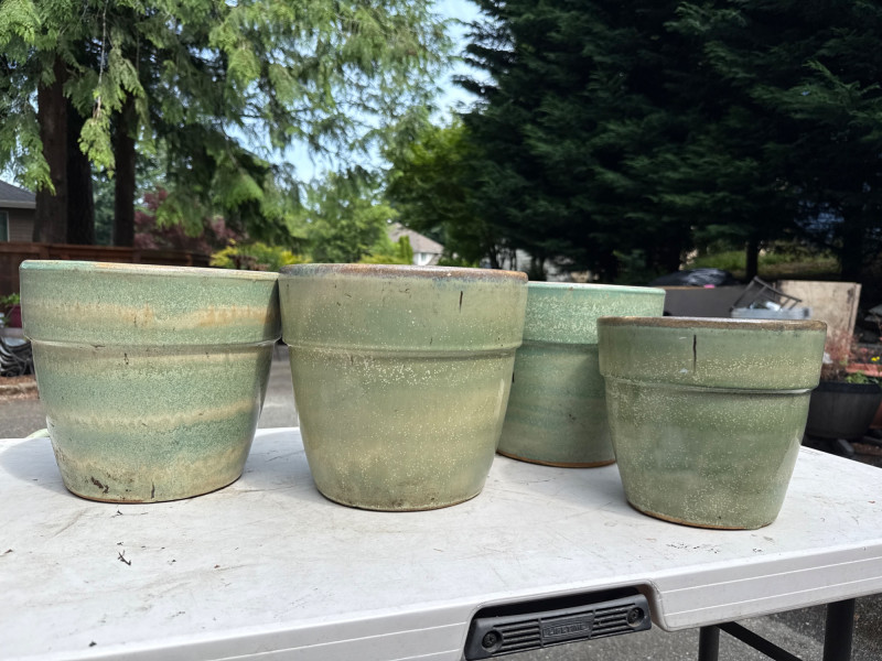 Four ceramic pots with green and brown colors. No plant drip trays. Heavy clay with glaze coating. Largest is 10in tall, 10.5in wide.