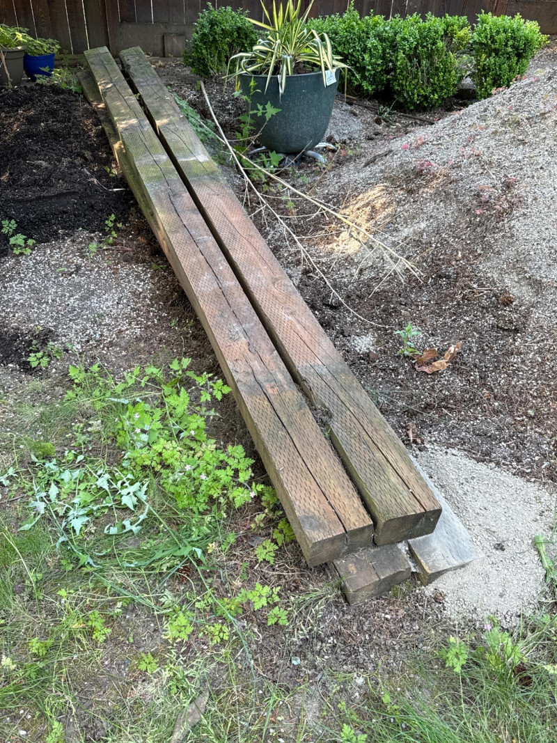 Four long beams of pressure treated lumber. There is a split in a couple. Doesn't go entire length. Heavy, bring help to load. Easy load location