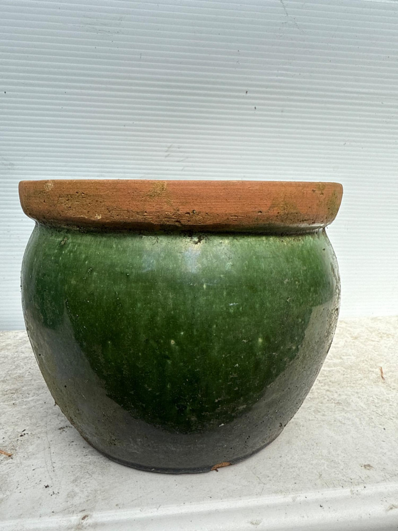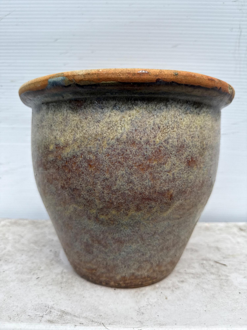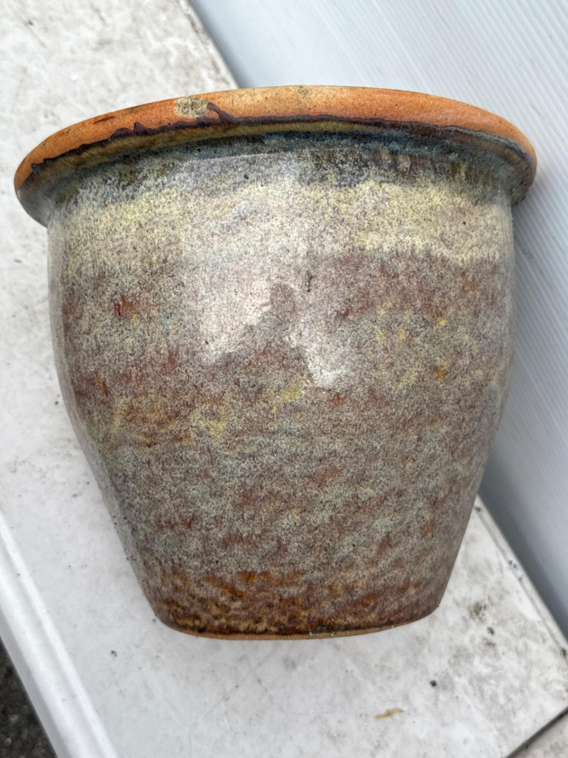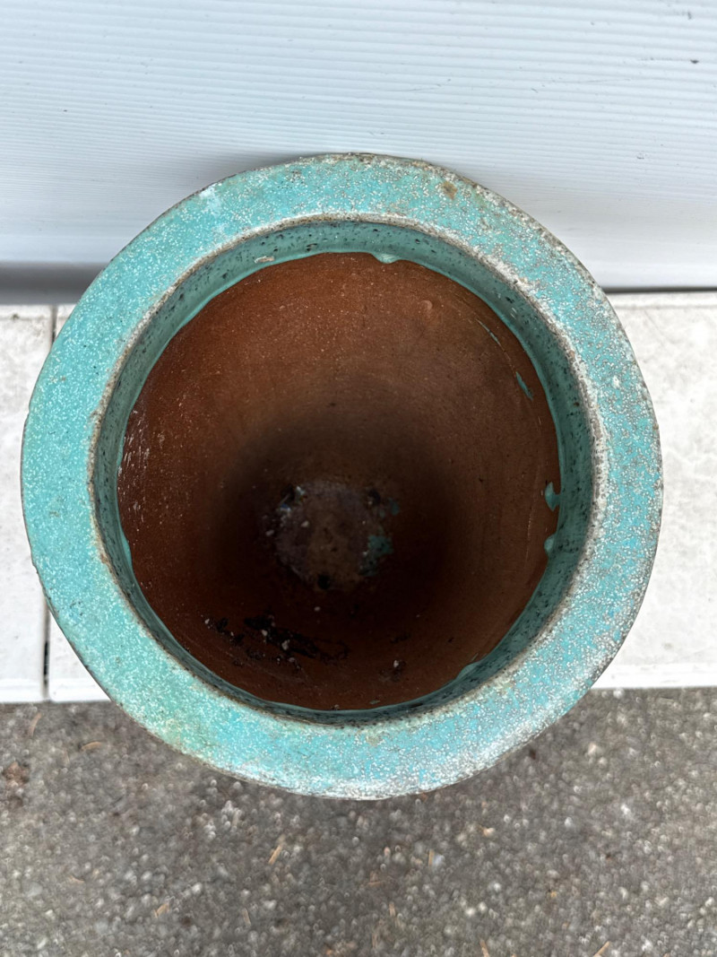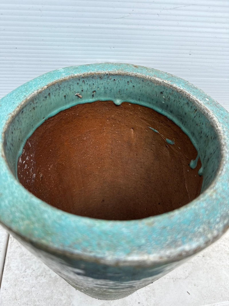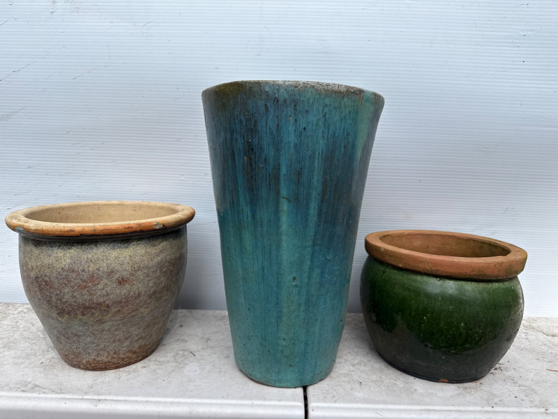 Variety of glazed ceramic plant pots. Green, Teal and brown color. Tapered pot is 14in tall, 9in wide Brown pot is 8in tall, 9.5in wide Green pot is 6.5in tall, 8.5in wide. Has 2 small chips