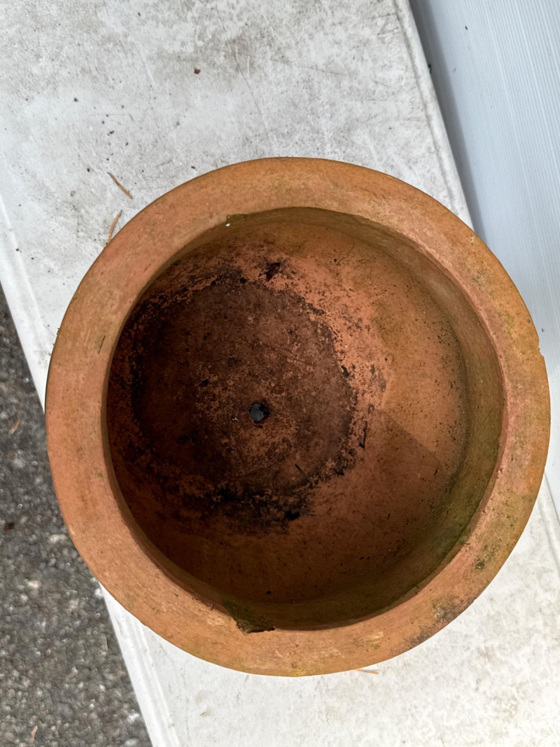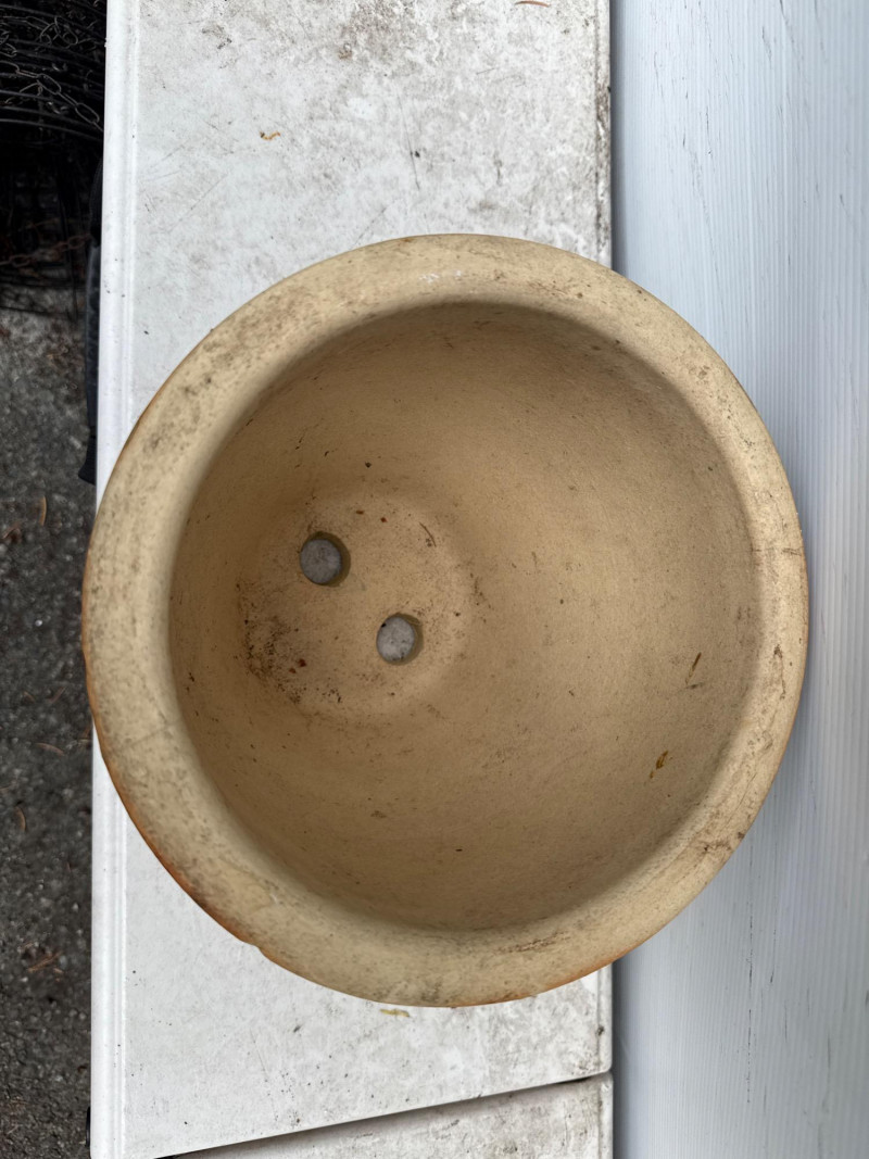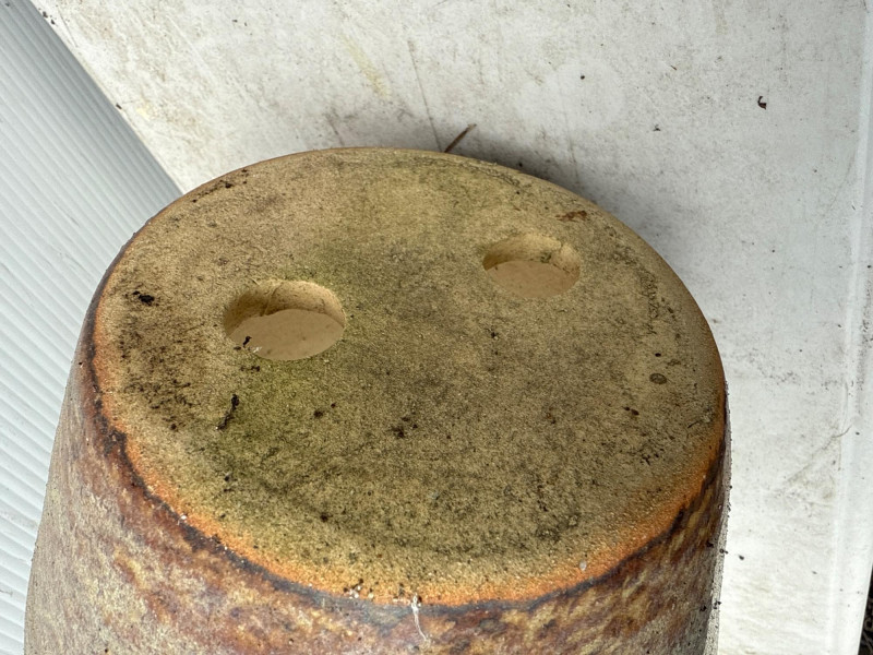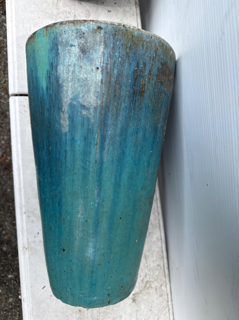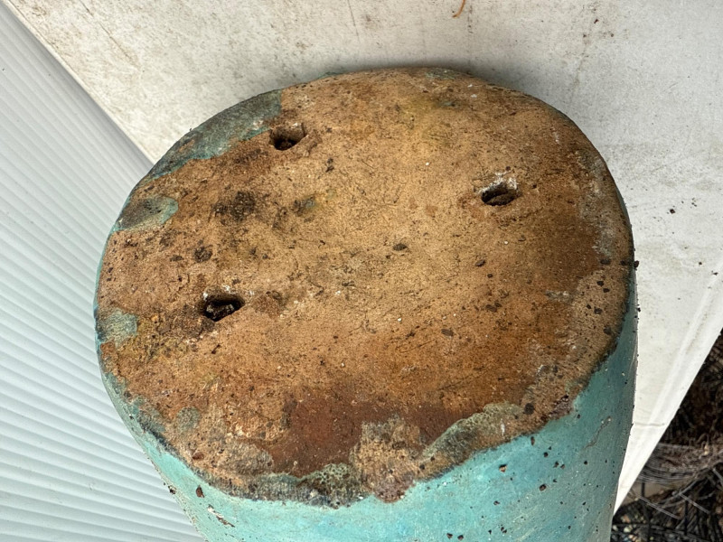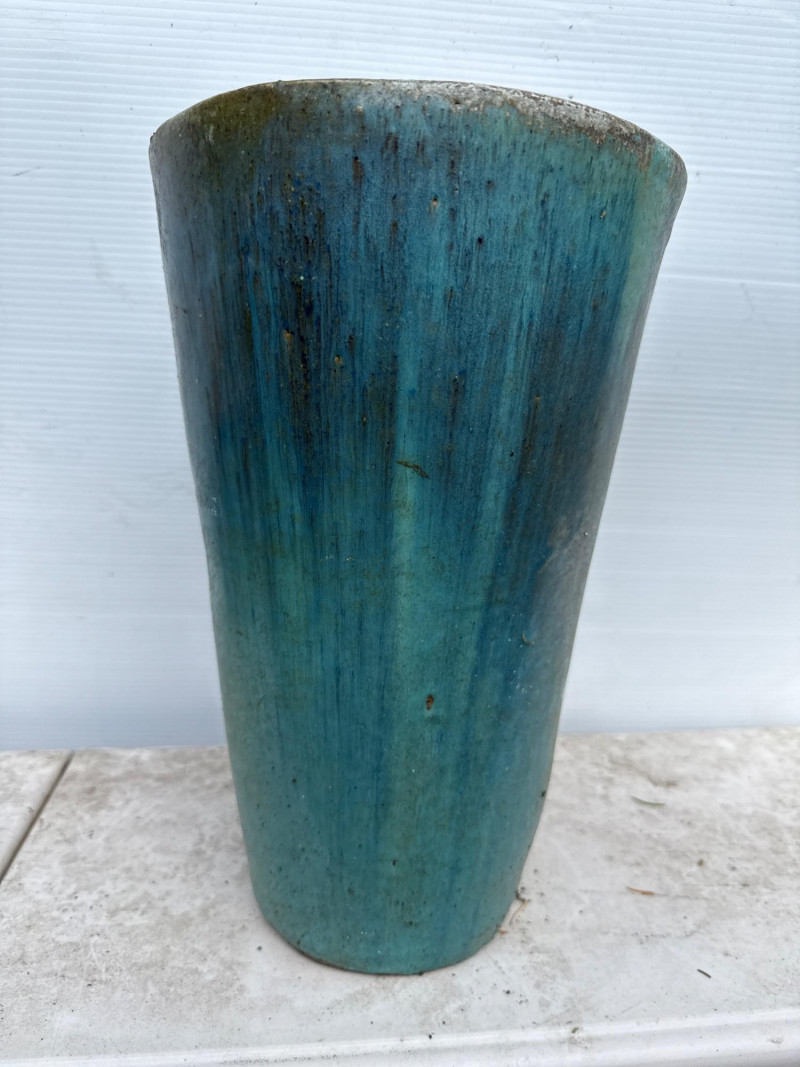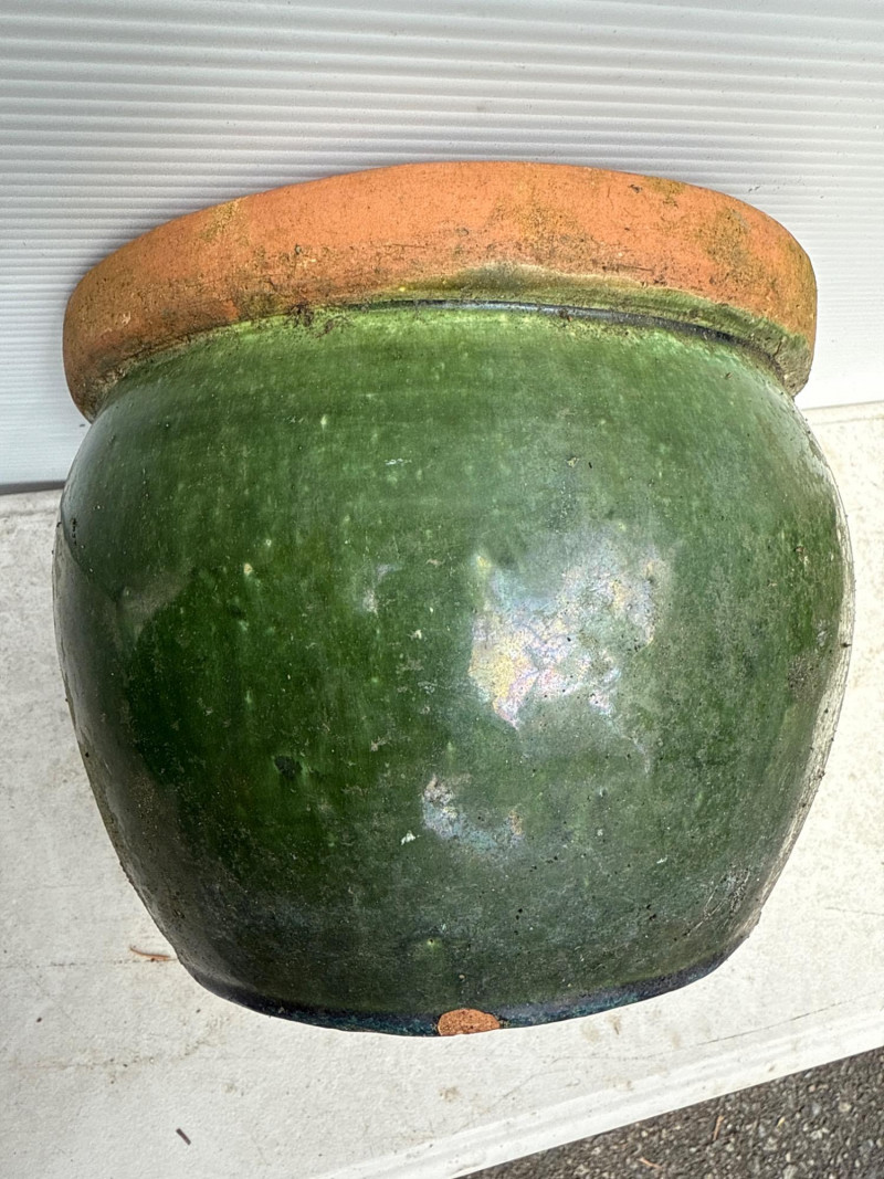 Variety of glazed ceramic plant pots. Green, Teal and brown color. Tapered pot is 14in tall, 9in wide Brown pot is 8in tall, 9.5in wide Green pot is 6.5in tall, 8.5in wide. Has 2 small chips