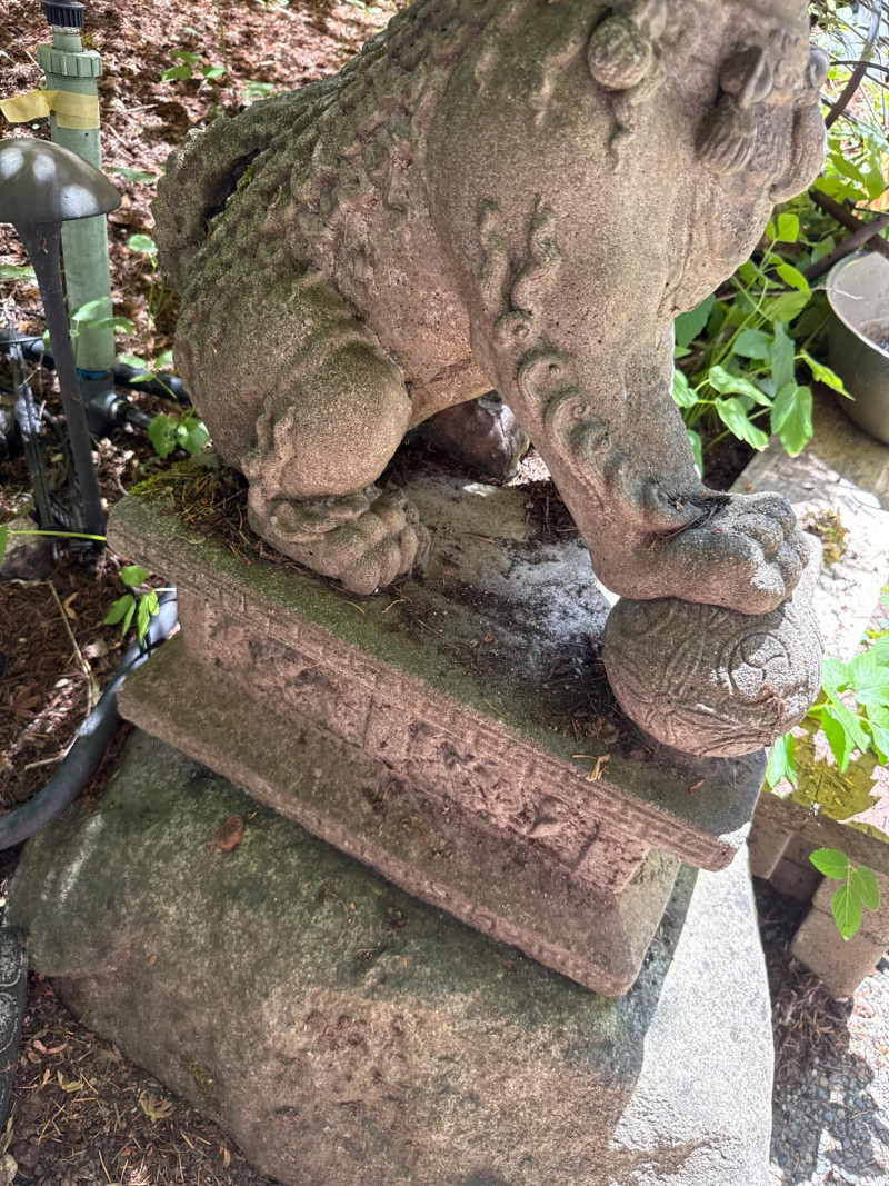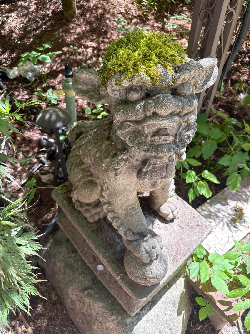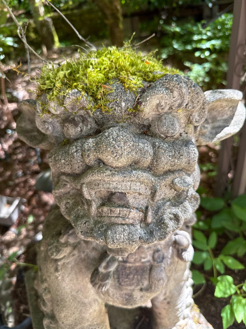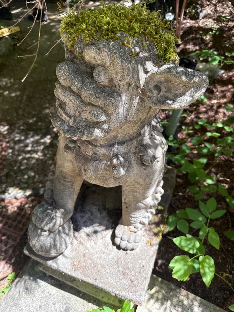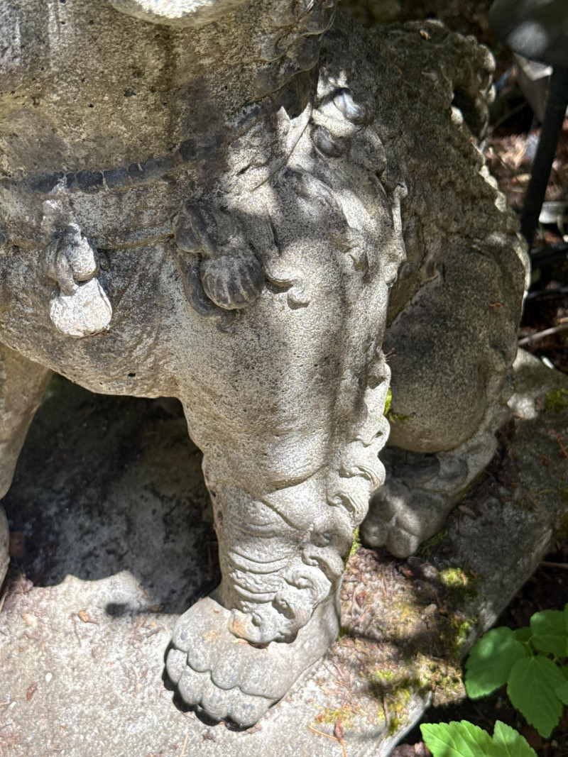 Heavy cement Foo dog statue. **Bring help to load. This is solid cement. Some moss growth. Loads of character and detail. Square base