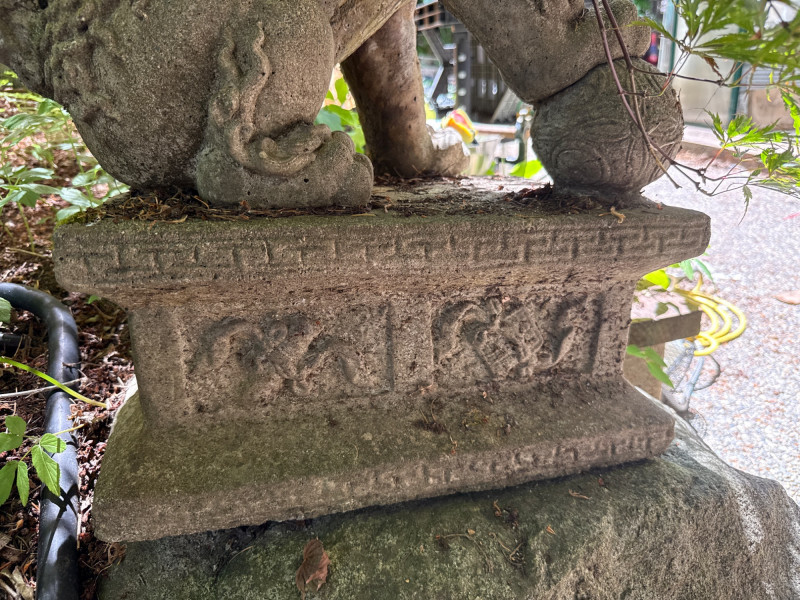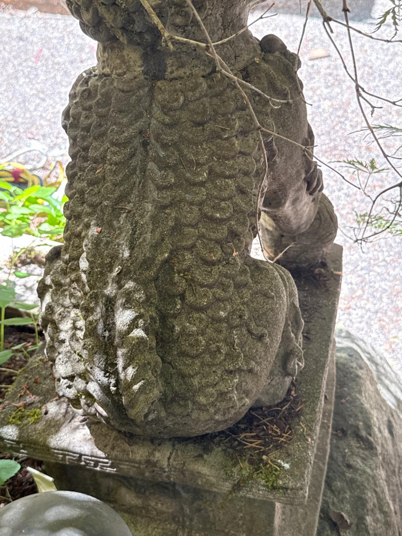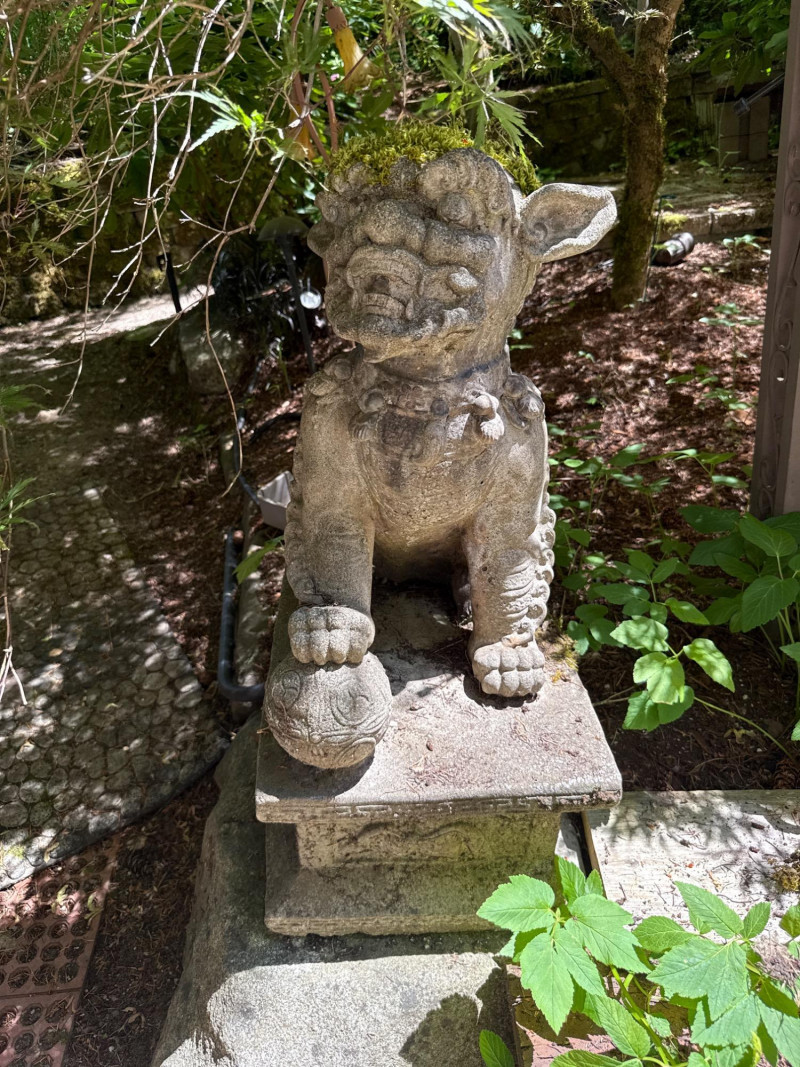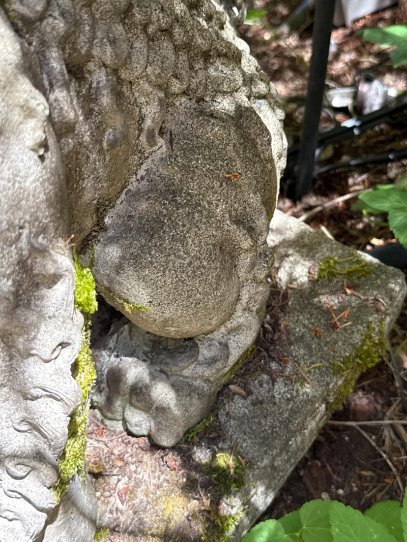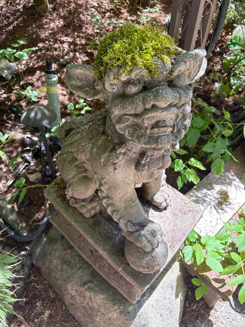 Heavy cement Foo dog statue. **Bring help to load. This is solid cement. Some moss growth. Loads of character and detail. Square base