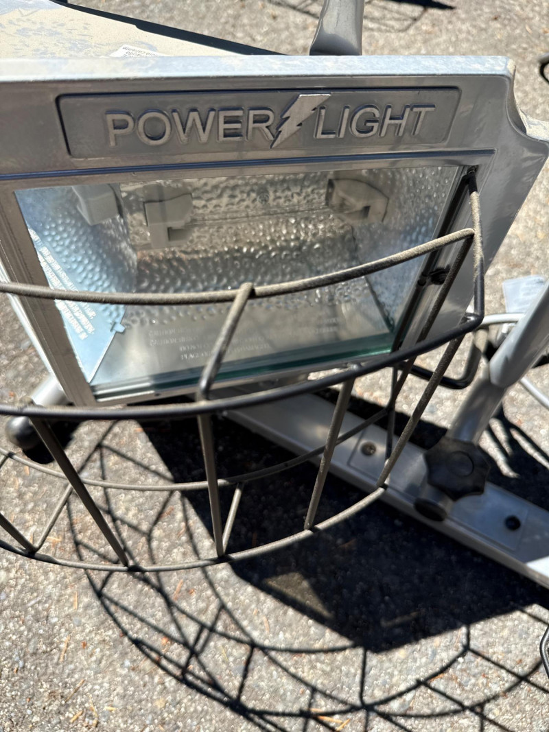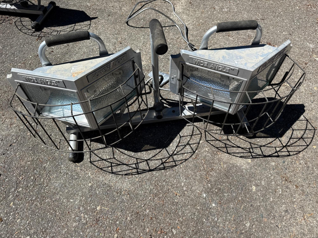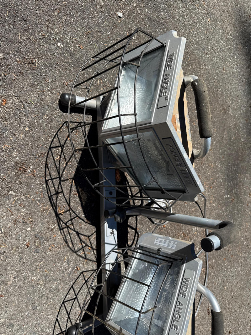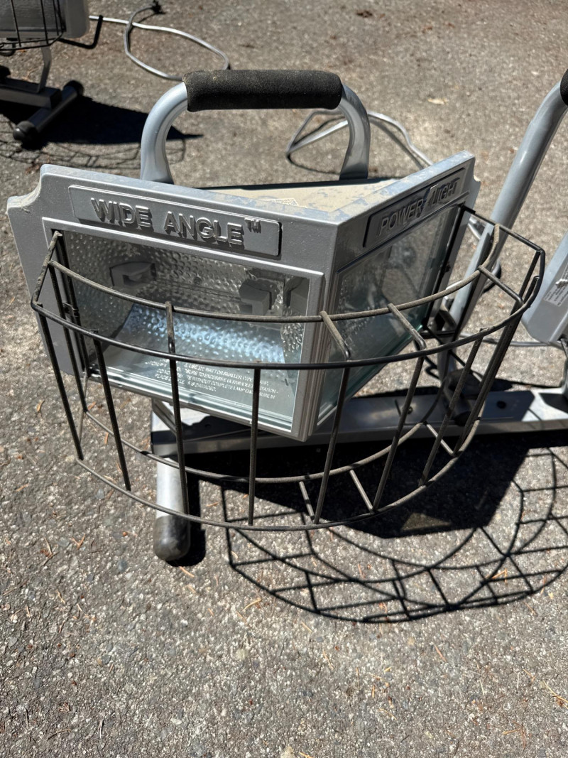 Wide angle power light. Lights rotate up and down Needs new bulbs. Two light boxes mounted on one stand. Equals 4 lights per stand. Metal cage cover.