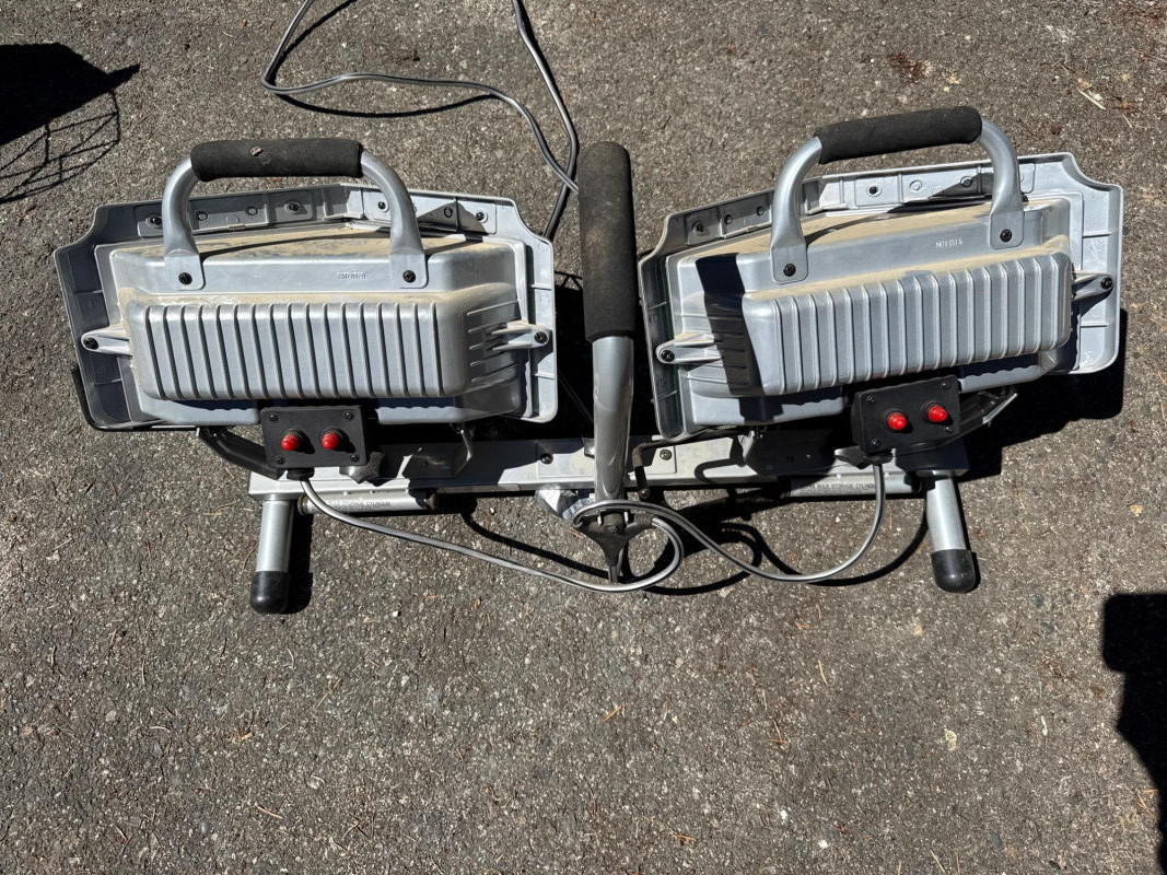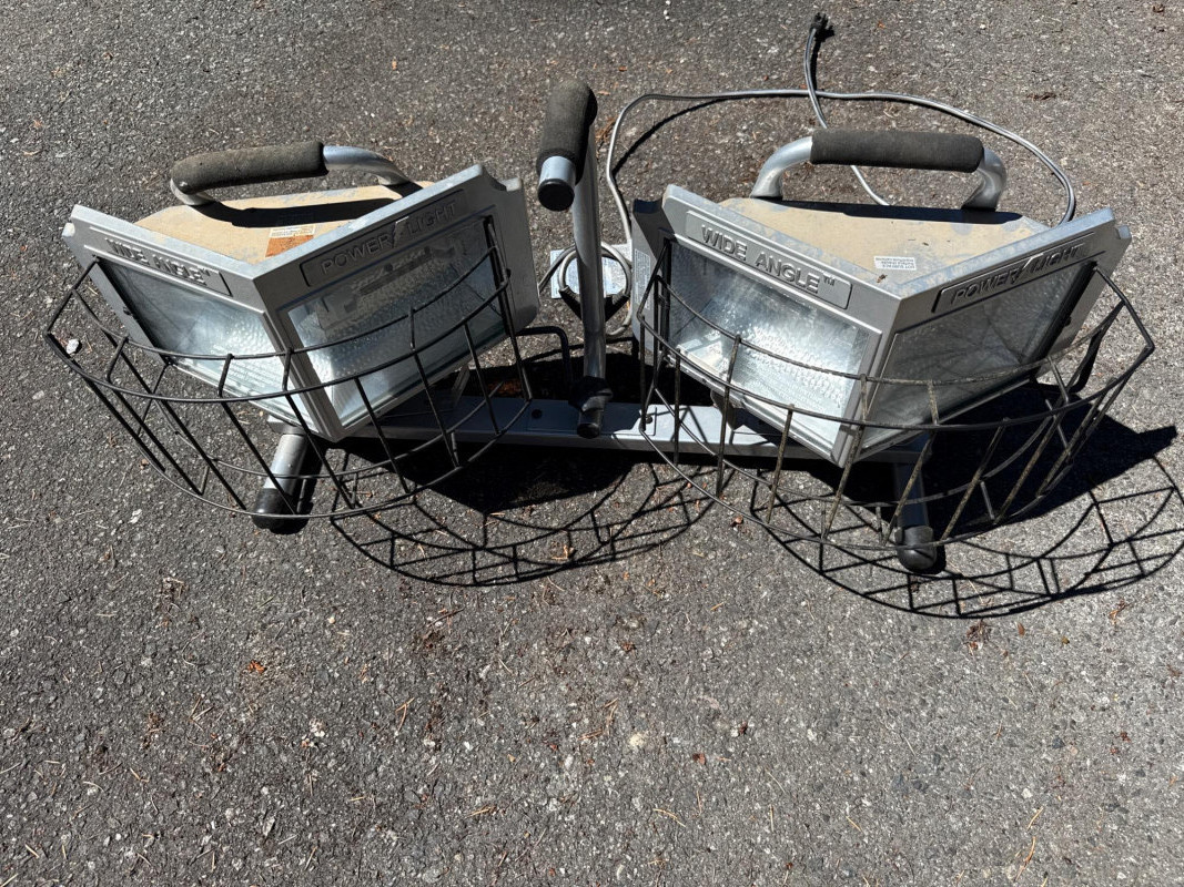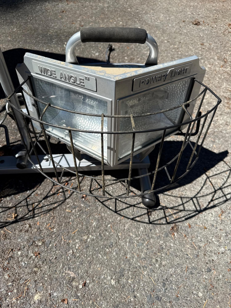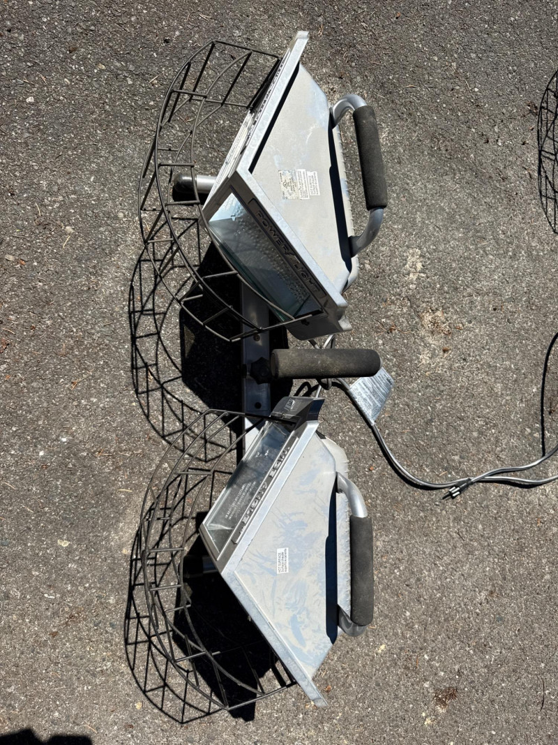 Wide angle power light. Lights rotate up and down Needs new bulbs. Two light boxes mounted on one stand. Equals 4 lights per stand. Metal cage cover.