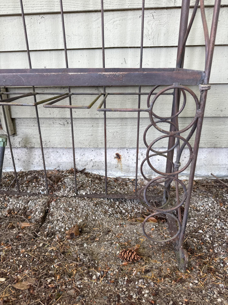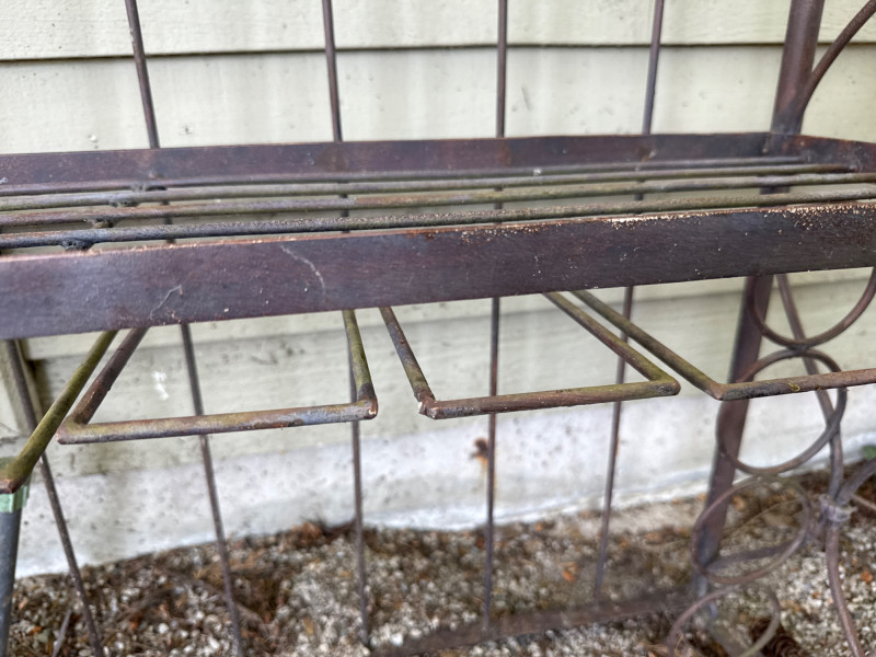 Vintage wrought iron shelf. Some minor rust. Rack for wine glasses and slots for bottles. Solid and sturdy. Great multi-purpose shelf