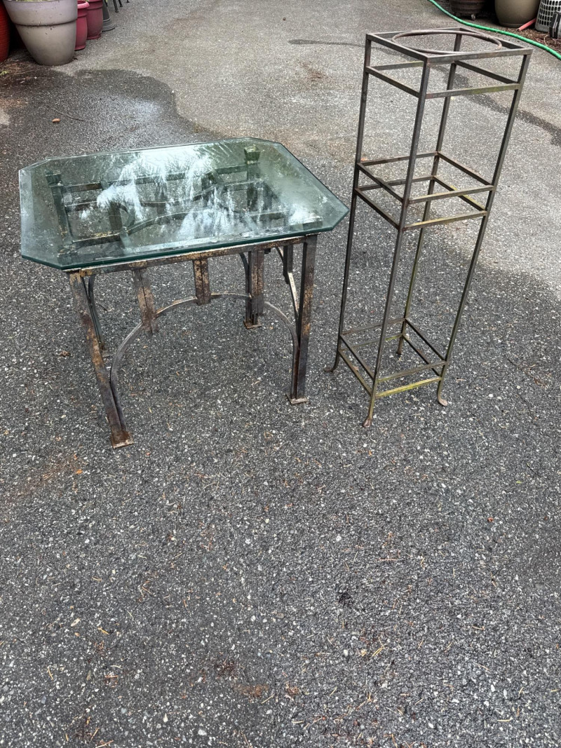 Heavy wrought iron plant stand is 33in tall, 9.5in wide. Heavy wrought iron square table with glass top. 24in tall, 24in wide, 28in long Glass has beveled edges. Heavy and in good condition. All items could use a cleaning.