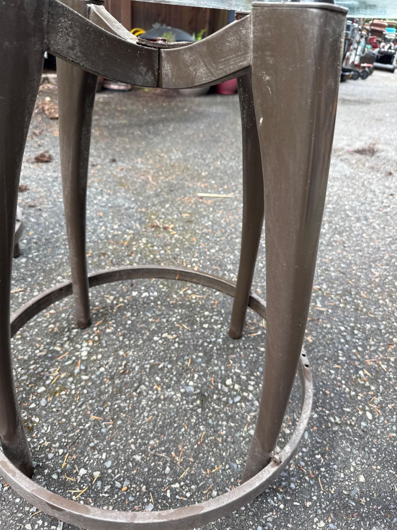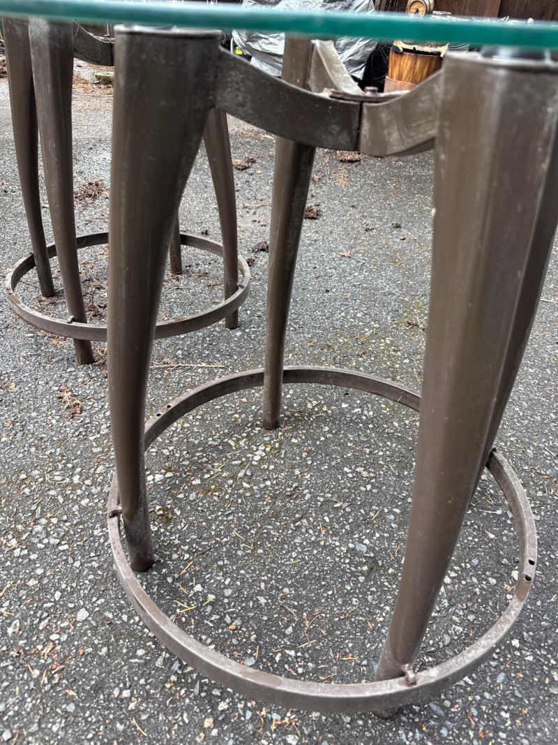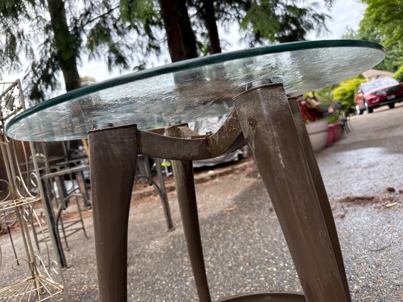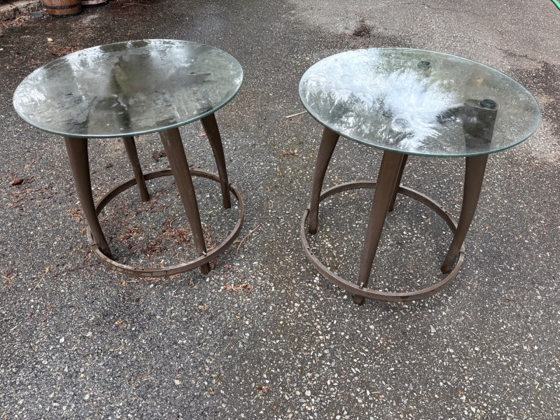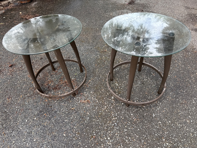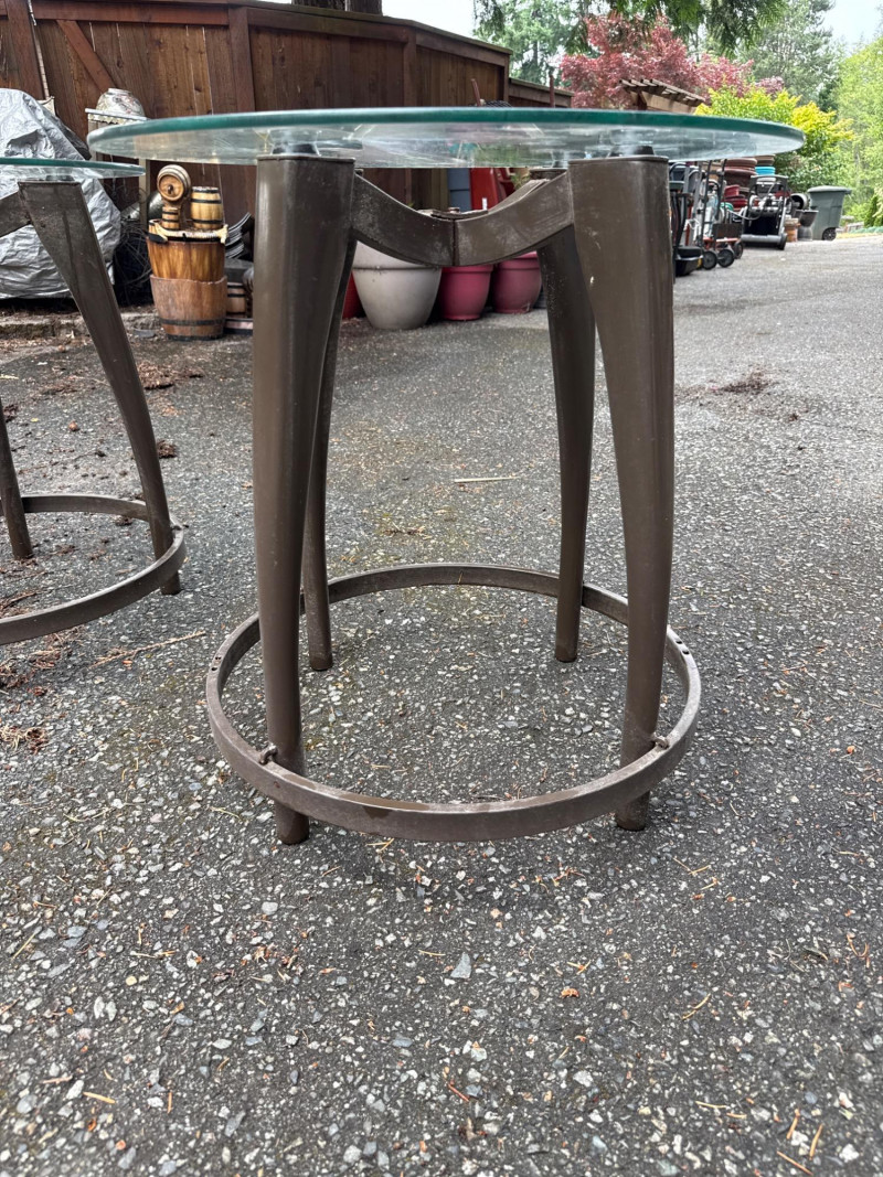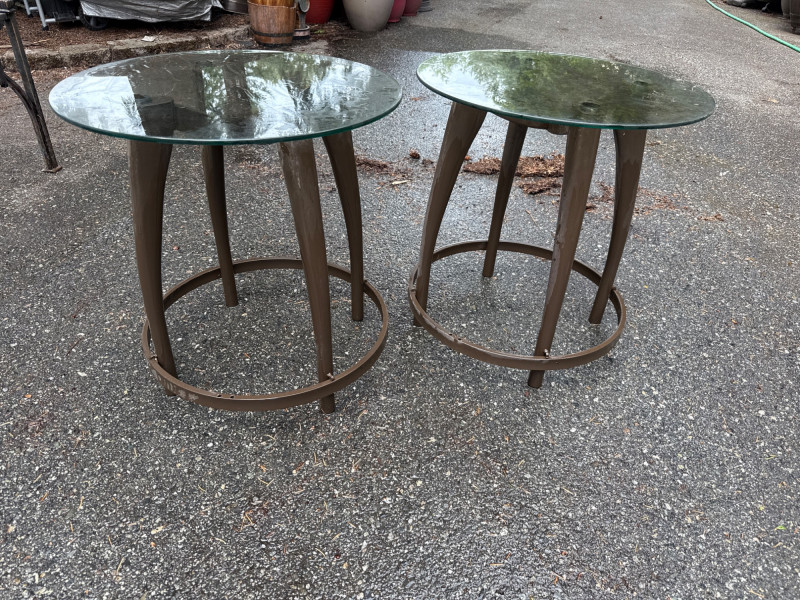 Two contemporary end tables. Curved legs Heavy, glass top. Metal base. Quality glass pads on top. All need cleaned and have been outside