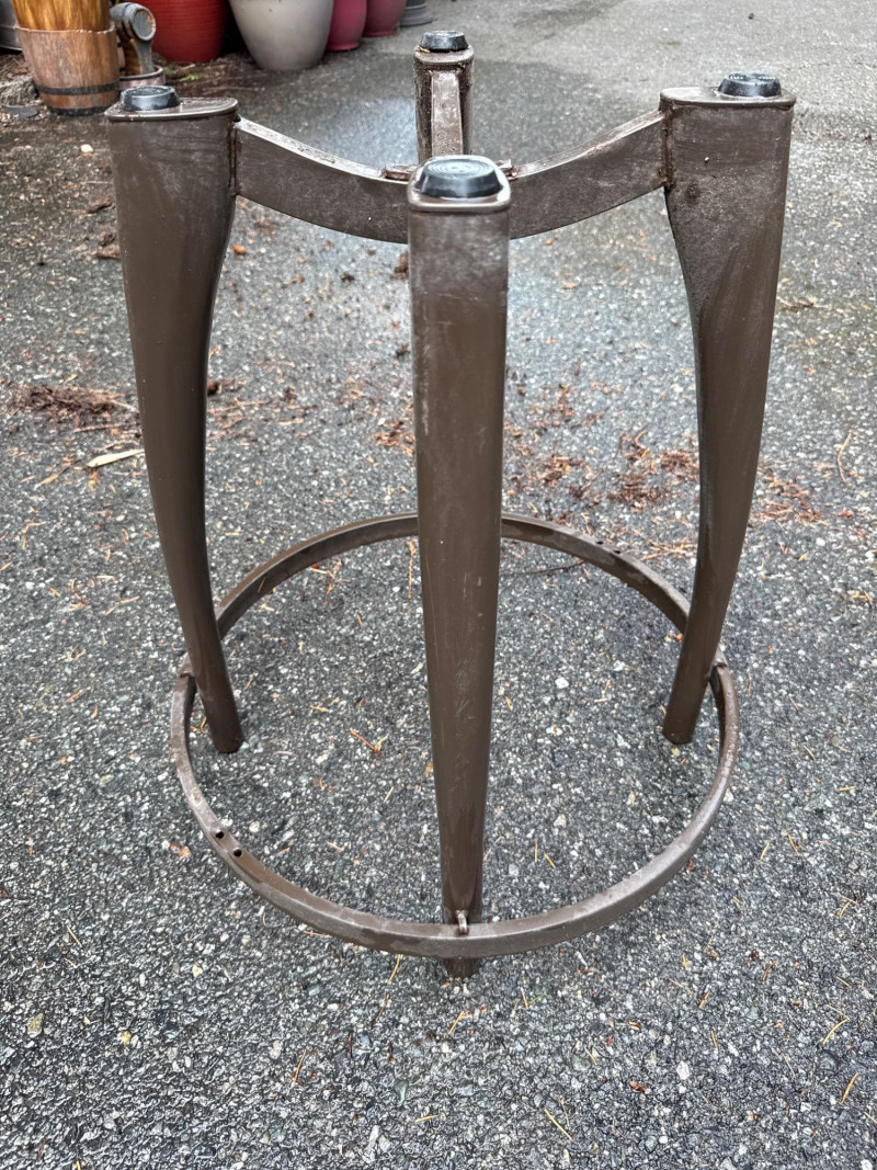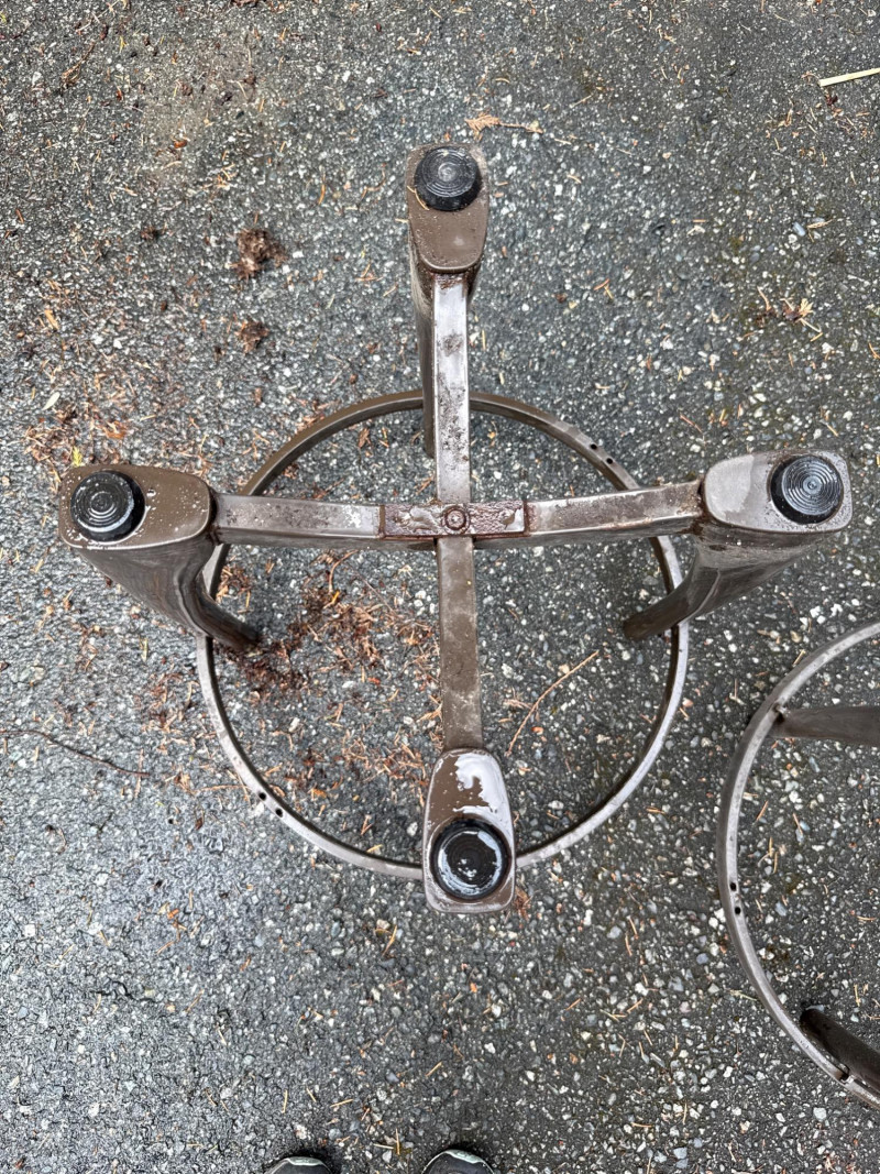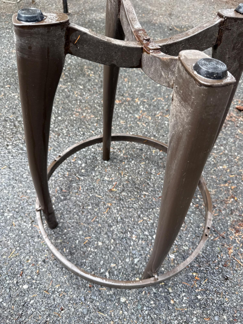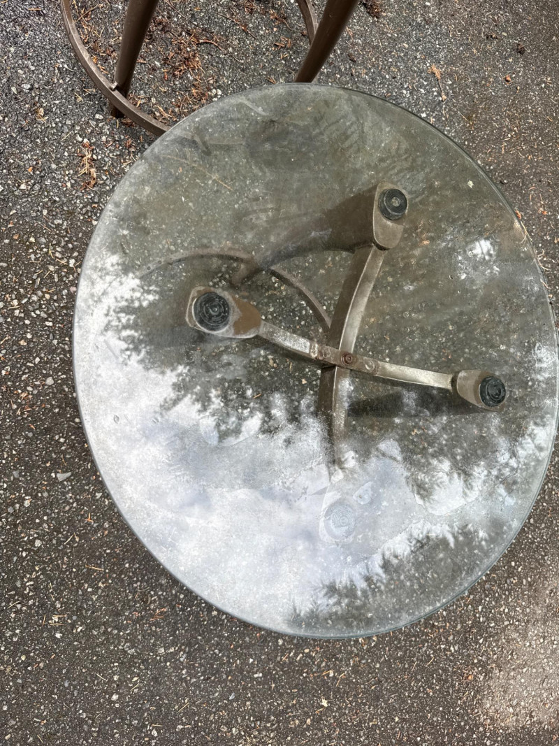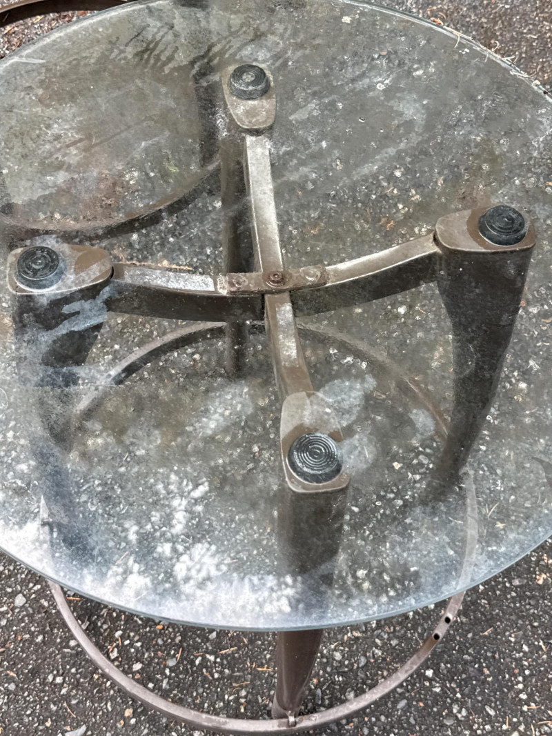 Two contemporary end tables. Curved legs Heavy, glass top. Metal base. Quality glass pads on top. All need cleaned and have been outside