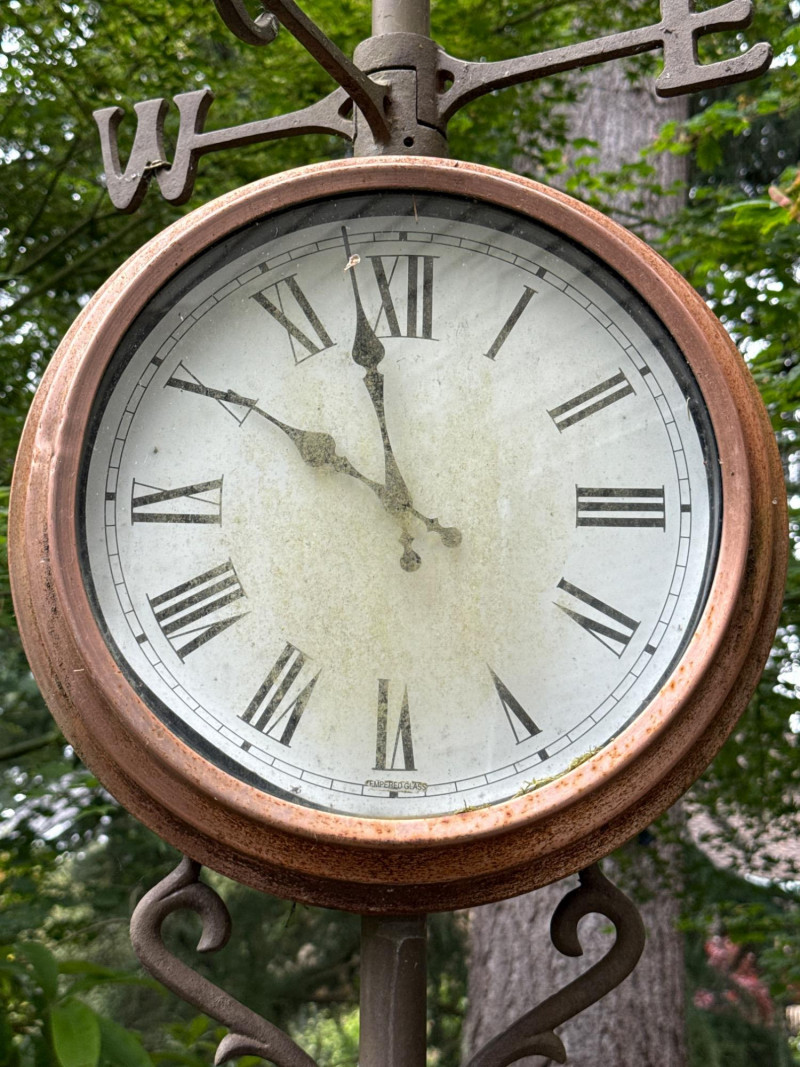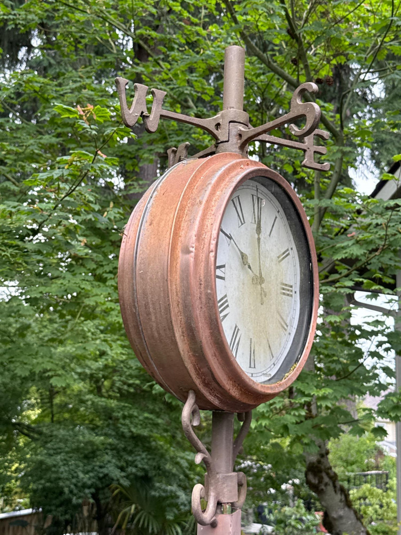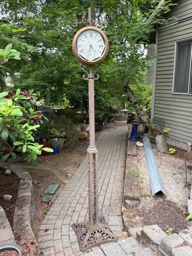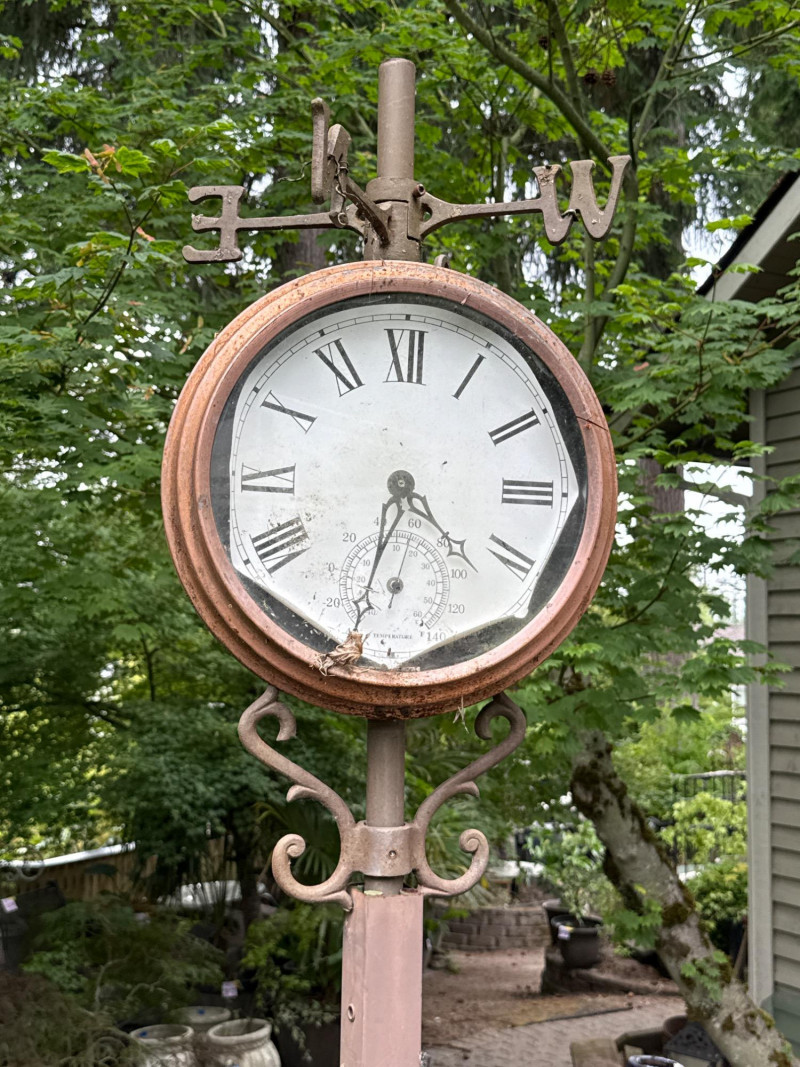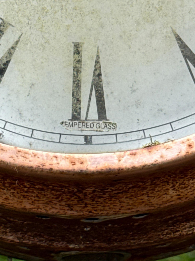 Heavy metal vintage clock and weathervane. Some rust and age shown Cast iron base, metal and copper components. Needs cleaned and serviced.