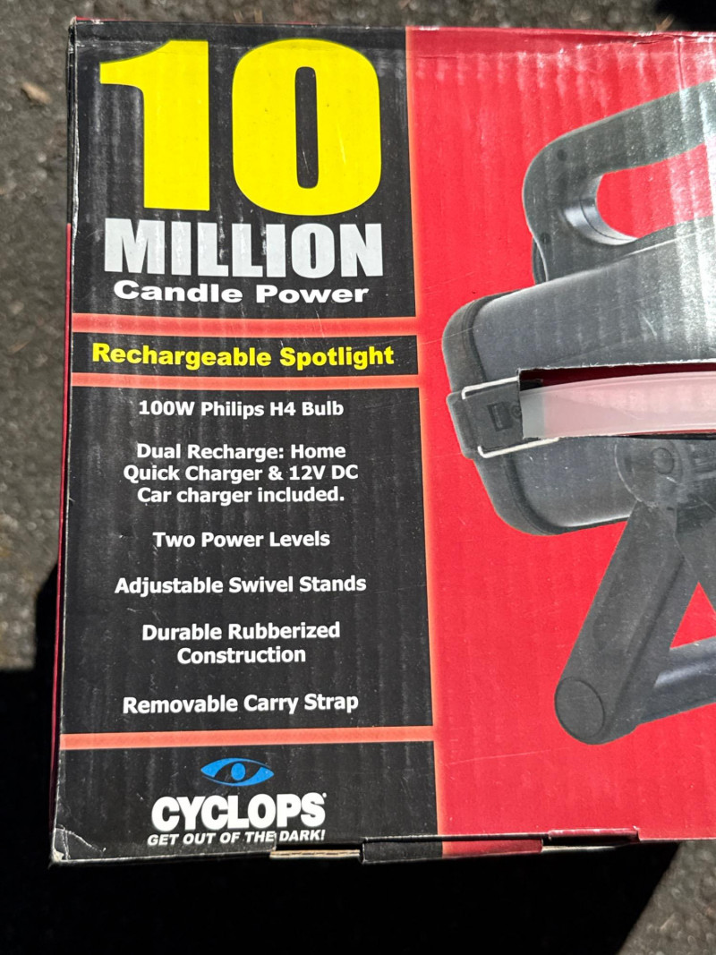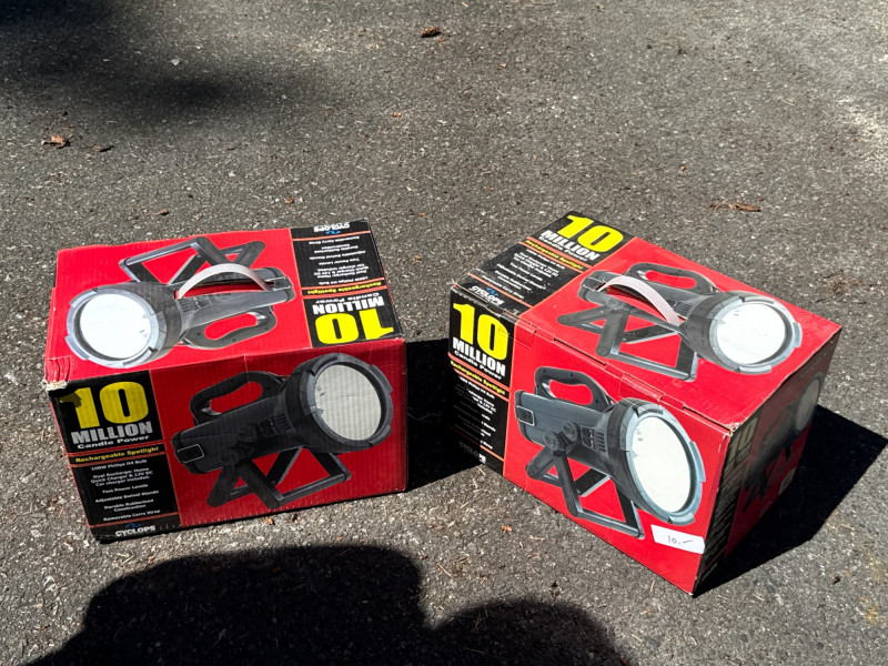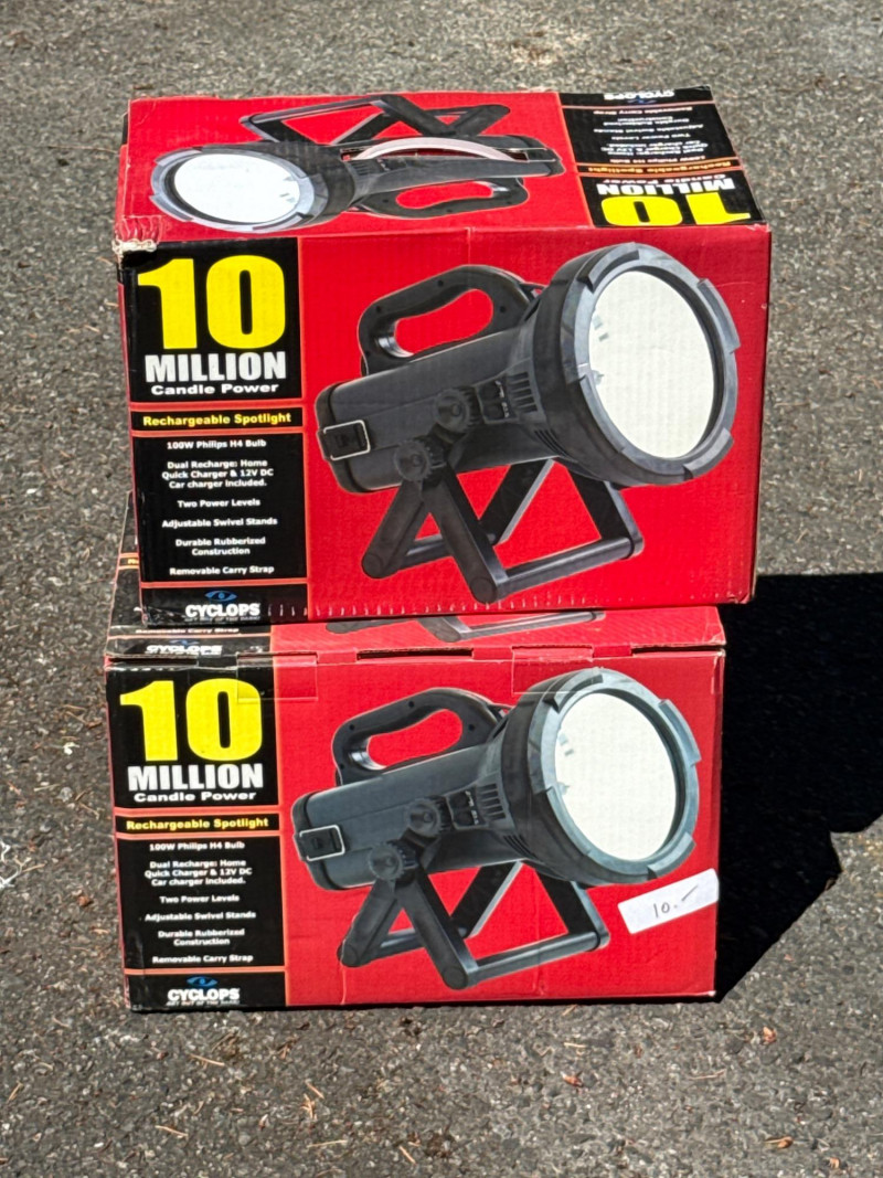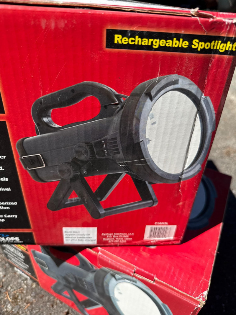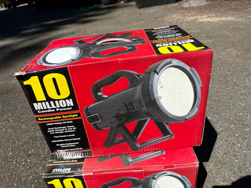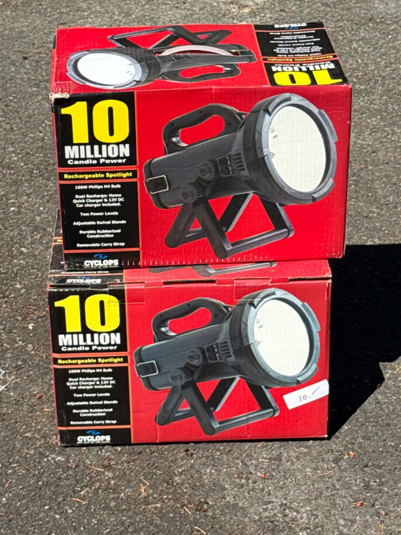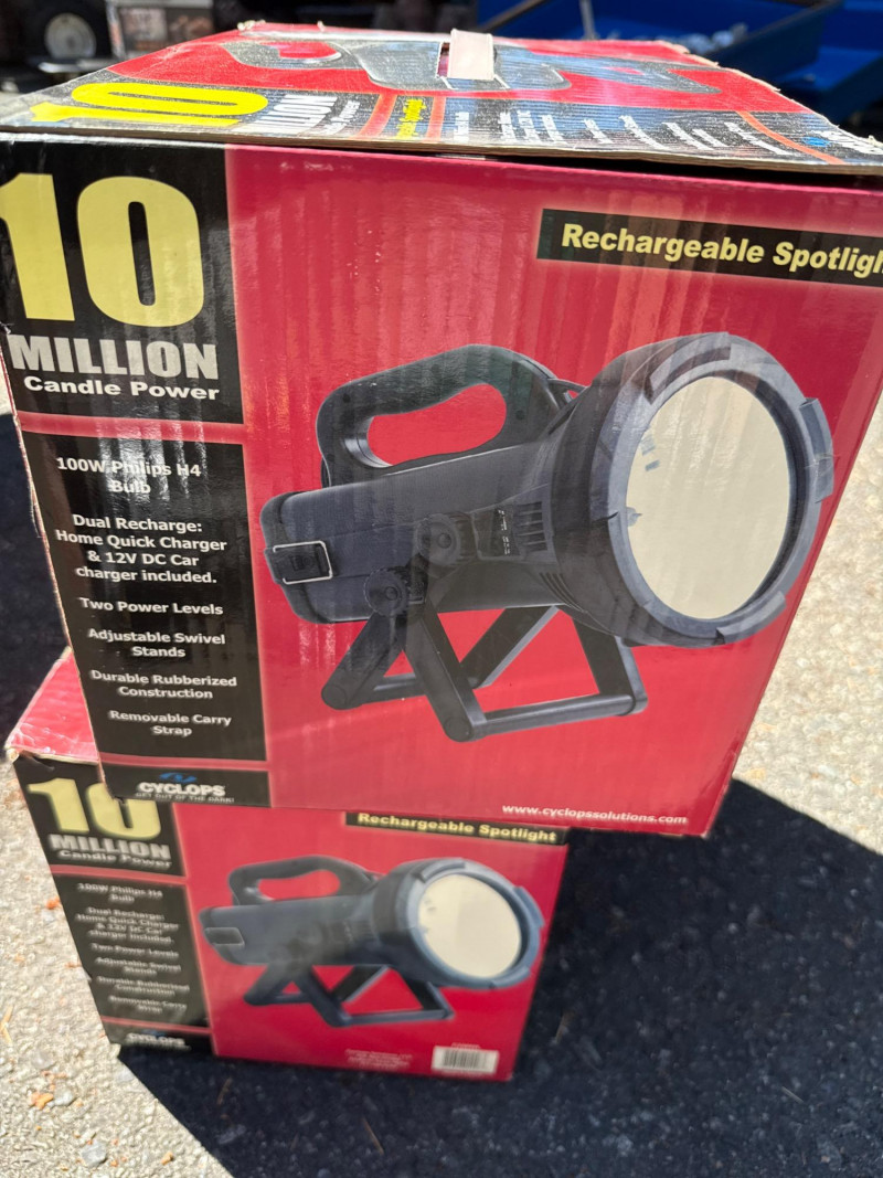 Cyclops spotlights are NIB. Rechargeable with 10 million candle power Several options