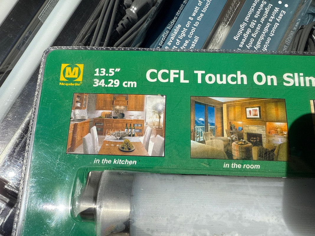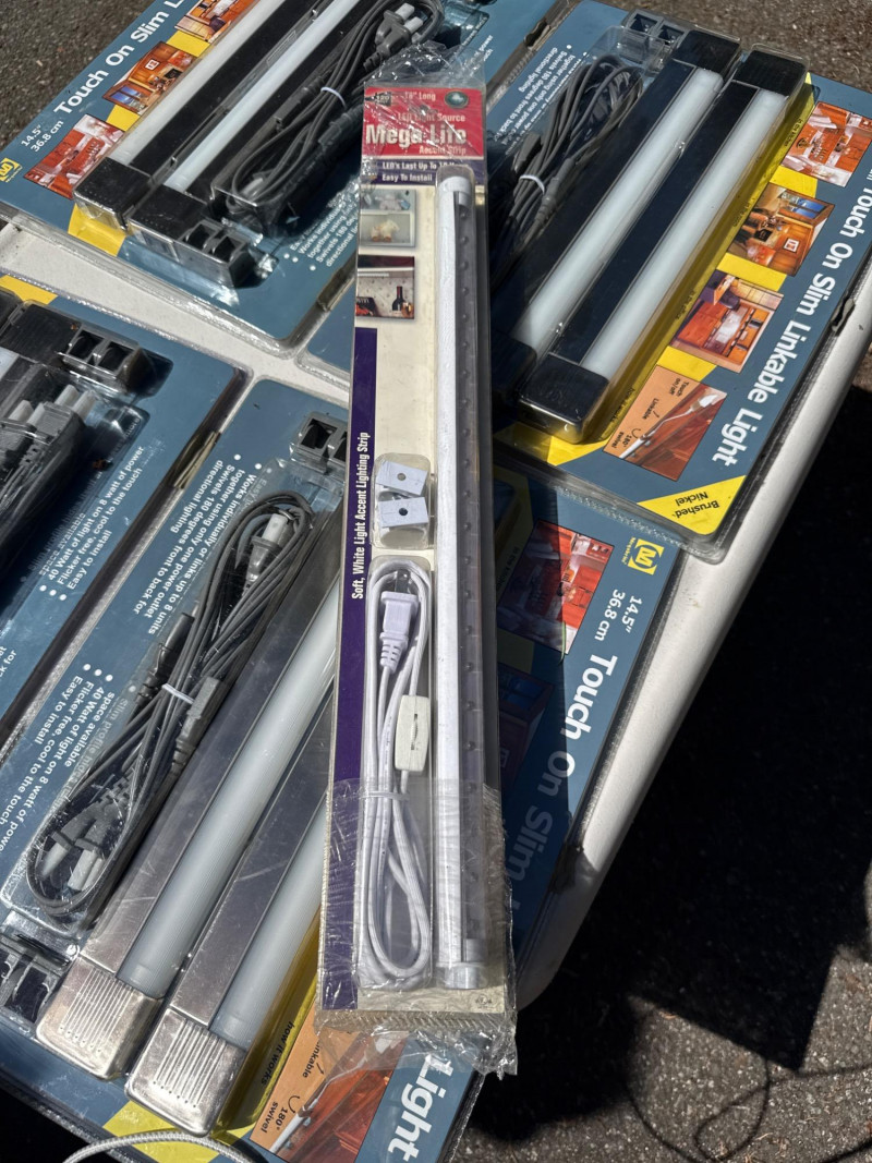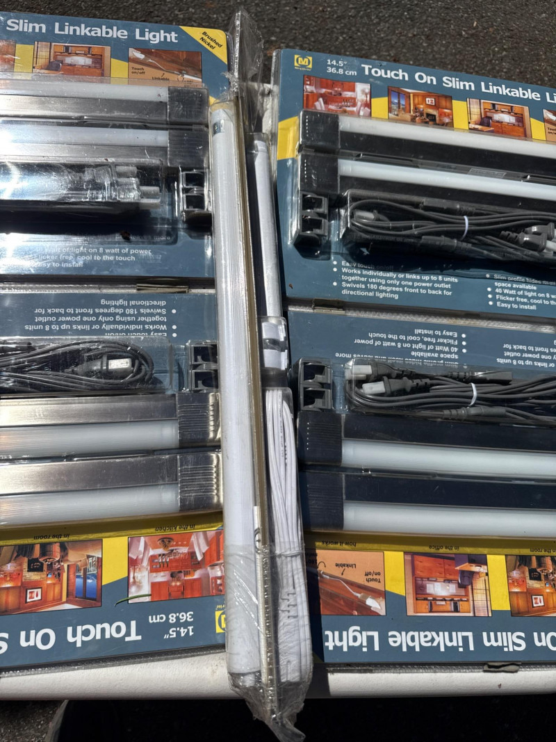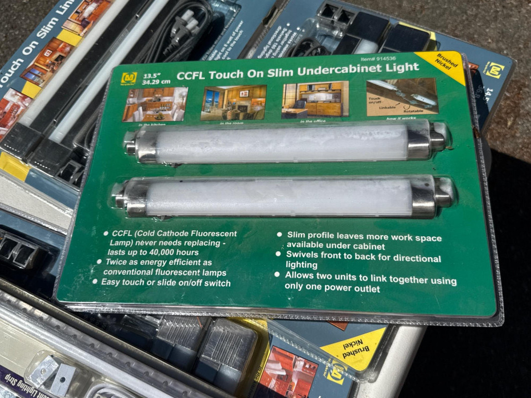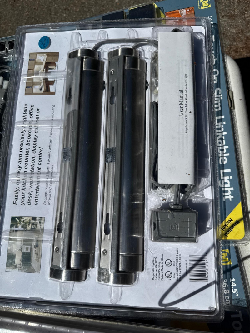 NIB cabinet lights. 4 sets of 14.5in long lights 1 set of 13.5in long lights 2 sets of Mega Life 16in Long lights.
