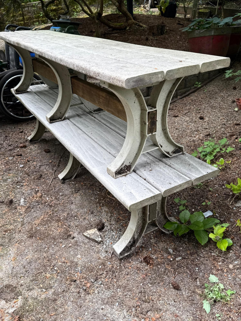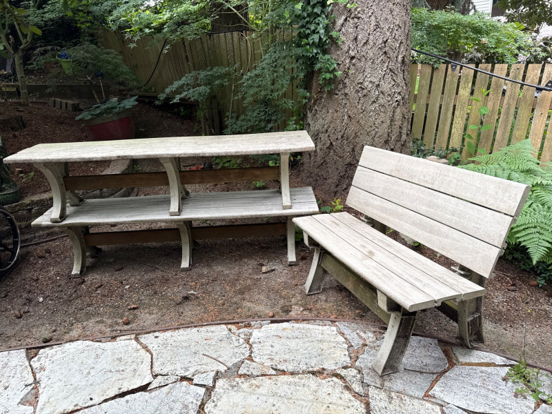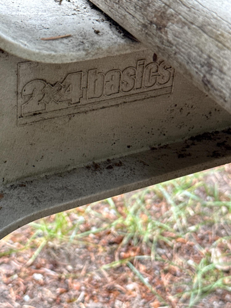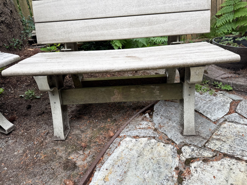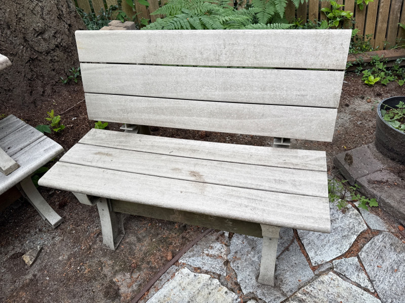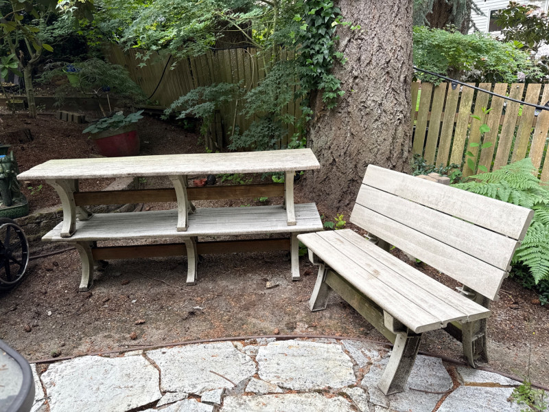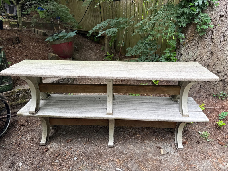 2x4 Basics poly resin bench and table set. Bench is 43in long, 30in wide, 35in tall. Table conversion is 29in wide extended Bench dimensions are 72in long, 17in wide, 16.5in tall Needs a good cleaning. Heavy and bring help to load.