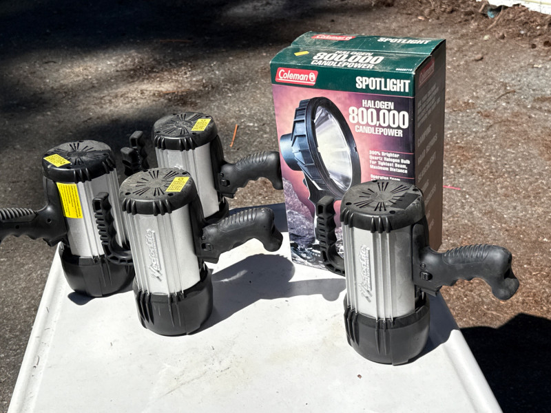 Heavy duty handheld spotlights. Batteries need charged. Have not located power cords at this time. Coleman spotlight is NIB 4 matching spotlights have two lights in one.