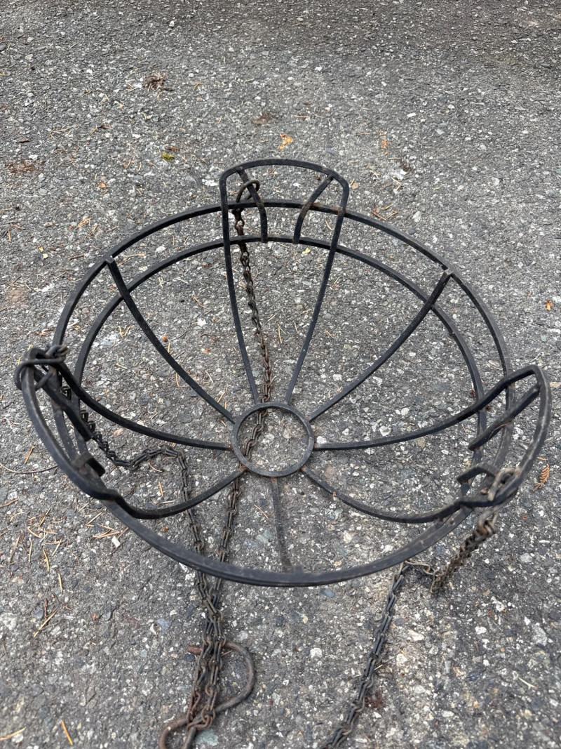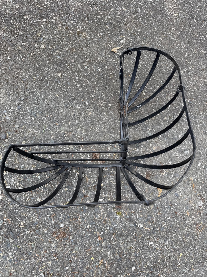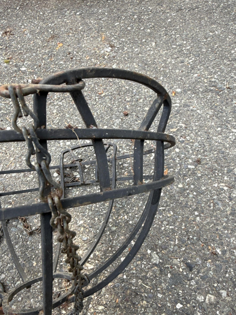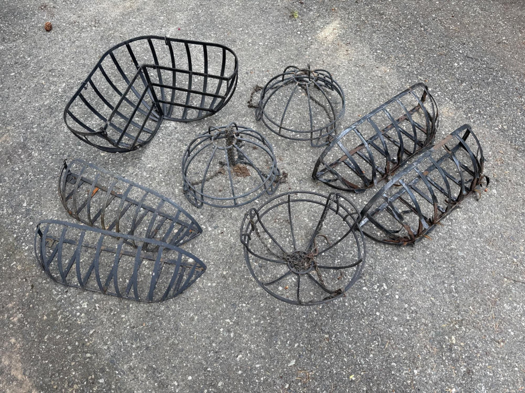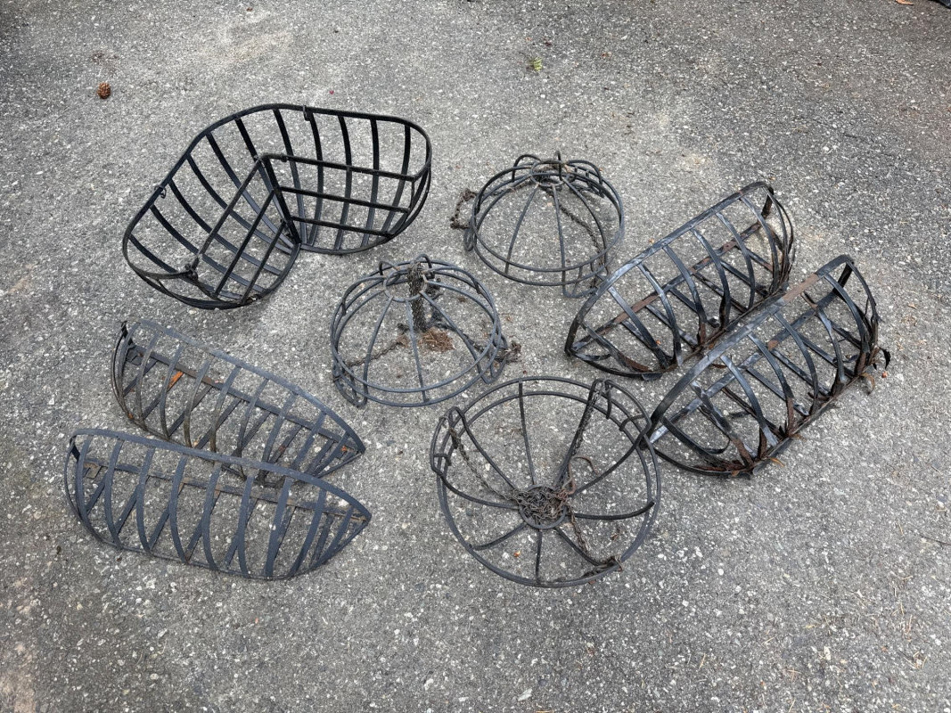 Large collection of metal baskets in various sizes and shapes. More may be added if found Some are heavier metal with some weight. Two window baskets have peeled paint and some rust. Dimensions are 22in long, 7in tall Corner backet is 10.5in tall, 25in wide. Largest round is 15in wide, 8in tall.