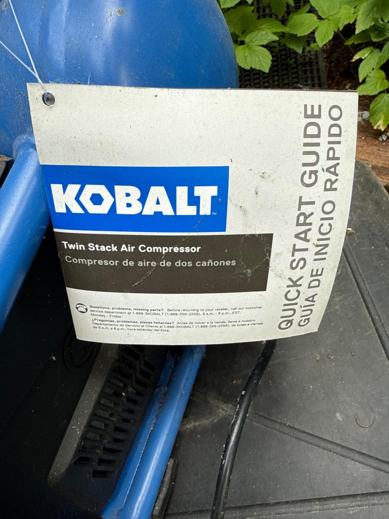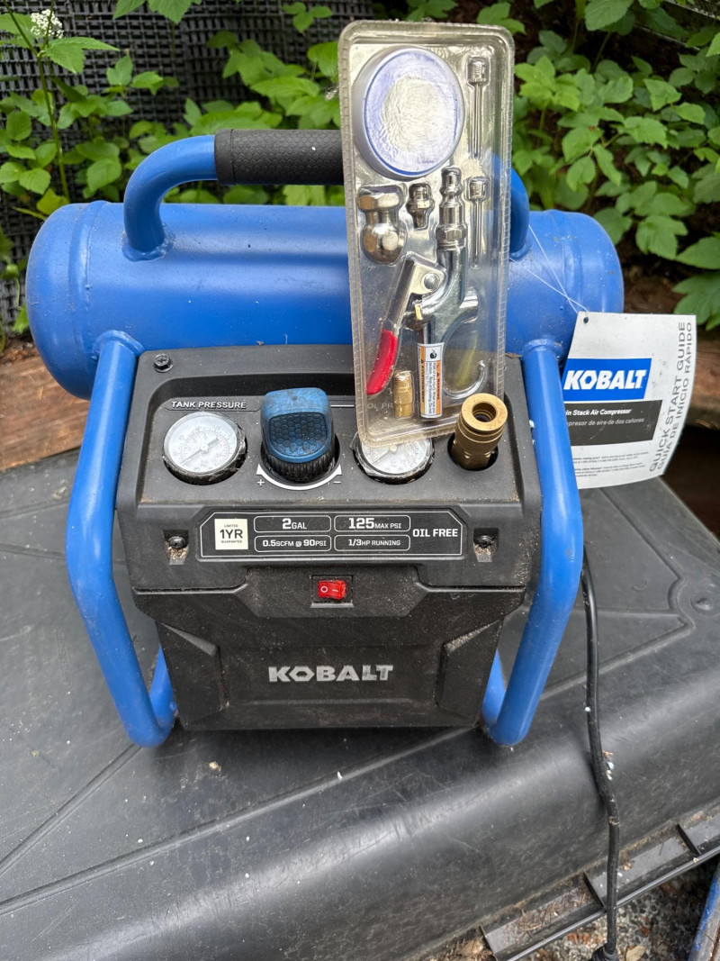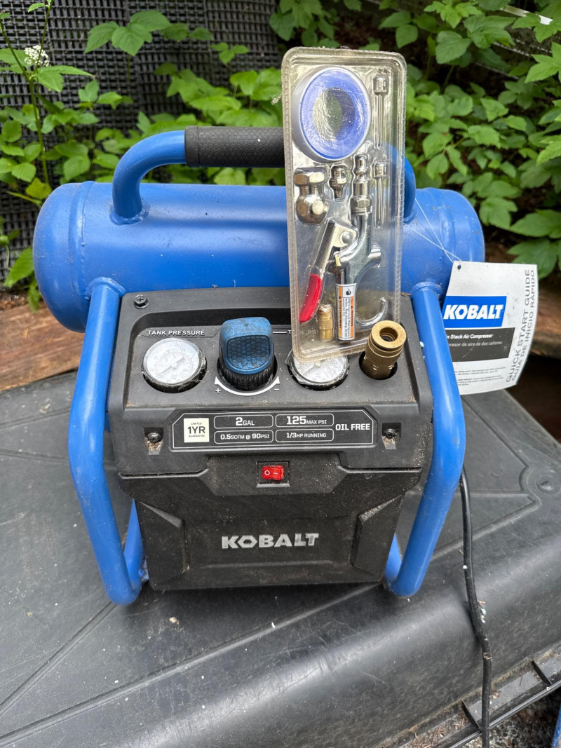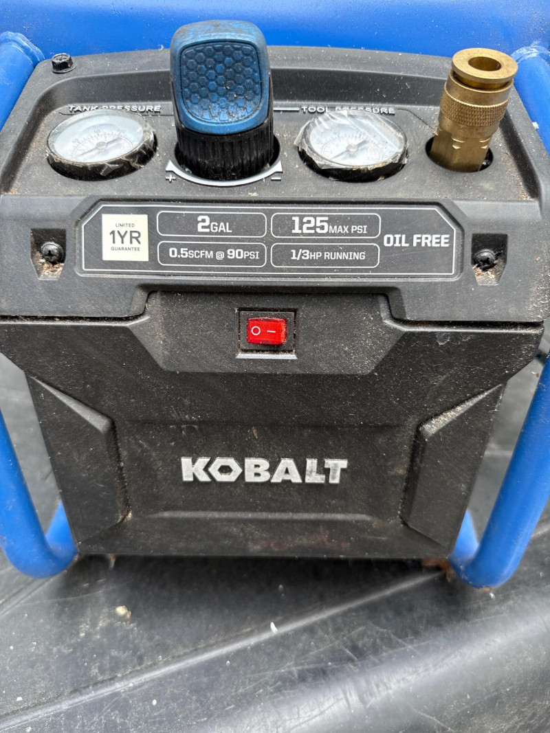 Kobalt air compressor powered up. Small accessory pack included. Model# 0120242A 2-gallon, 125 PSI, 1/3HP Easy and portable.