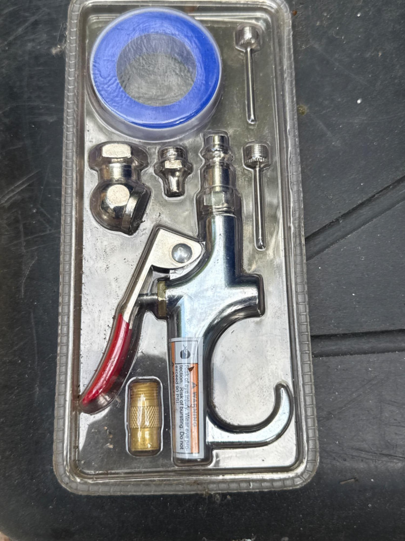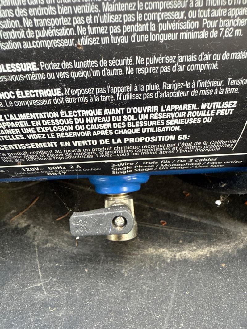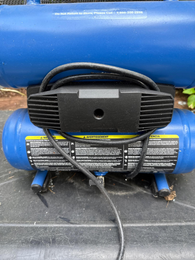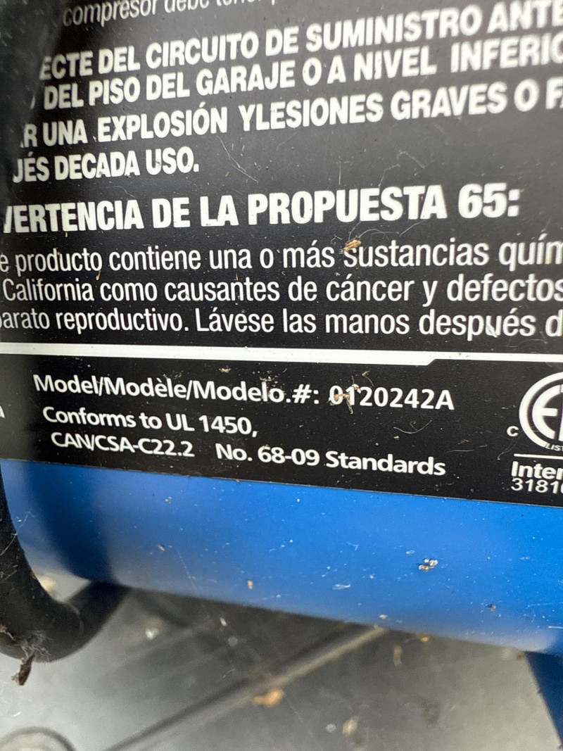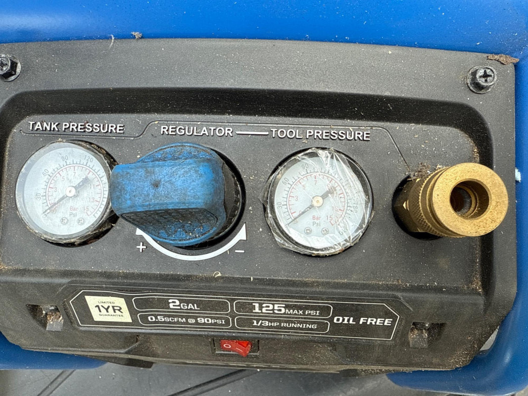 Kobalt air compressor powered up. Small accessory pack included. Model# 0120242A 2-gallon, 125 PSI, 1/3HP Easy and portable.