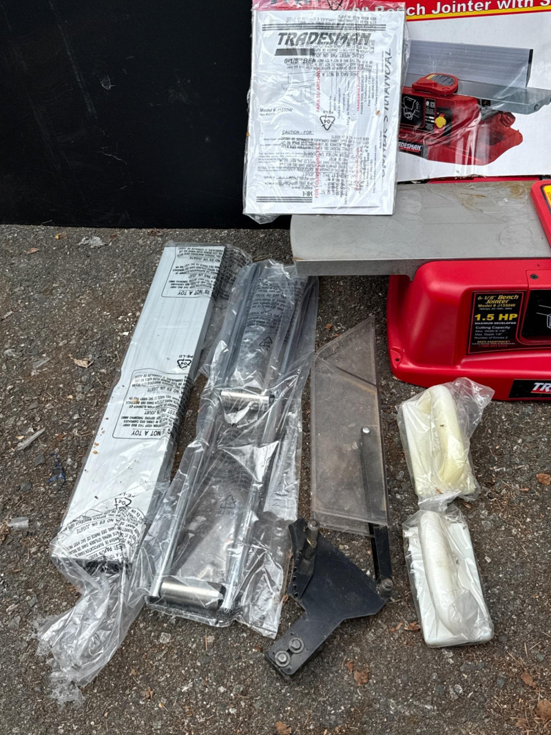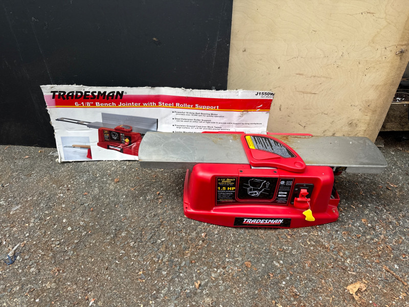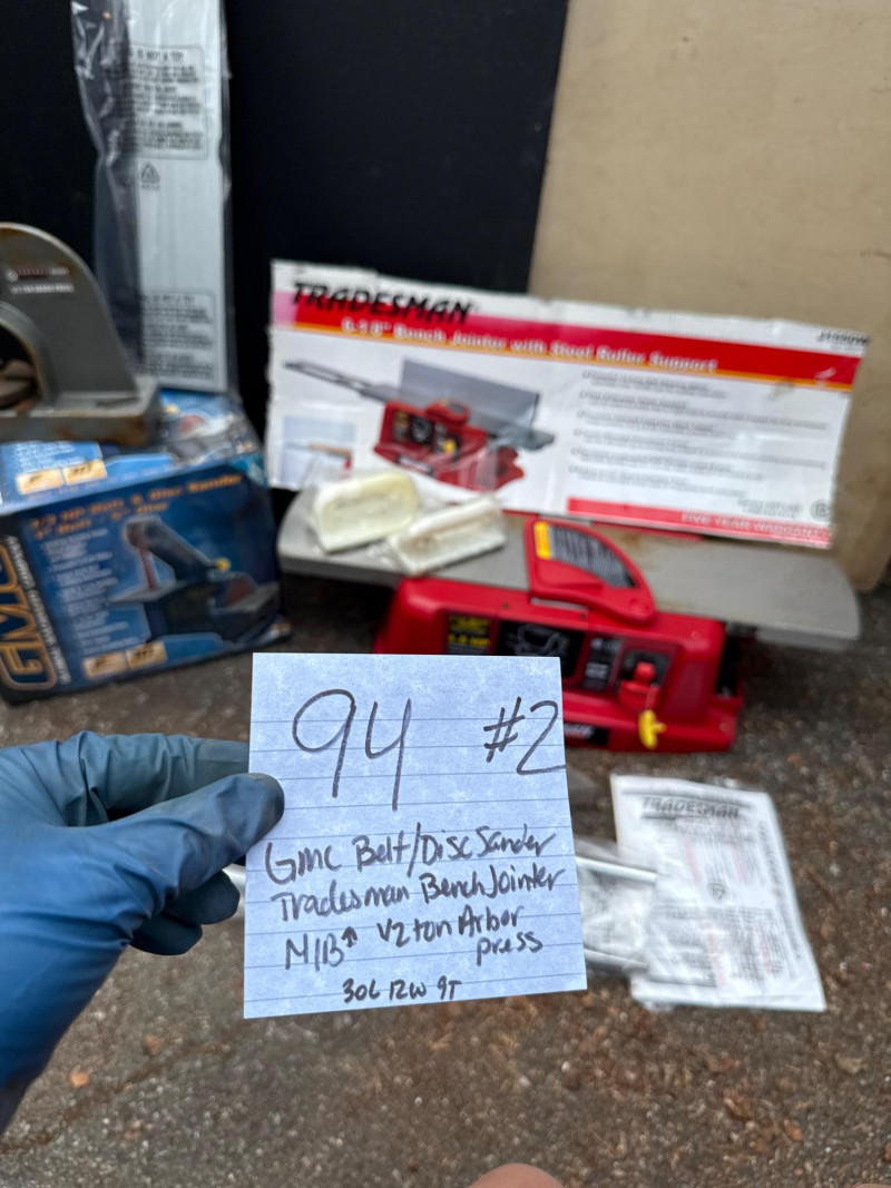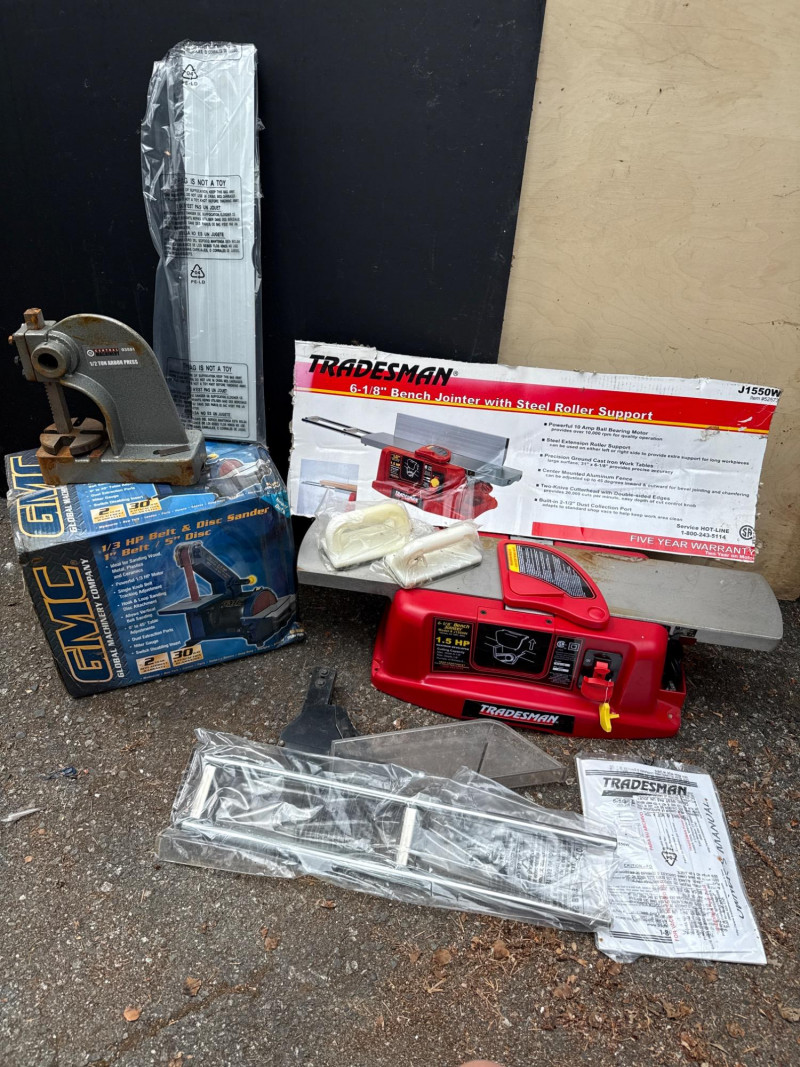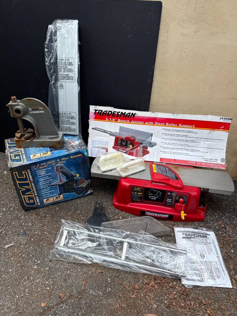 Tradesman 6 1/8in Bench Jointer is 30in long, 9in tall, 12in wide. Powered up. 1.5HP Includes roller bars and push guards. GMC 1/3HP belt and disc sander. NIB Vintage Arbor press. Some rust and currently missing handle.