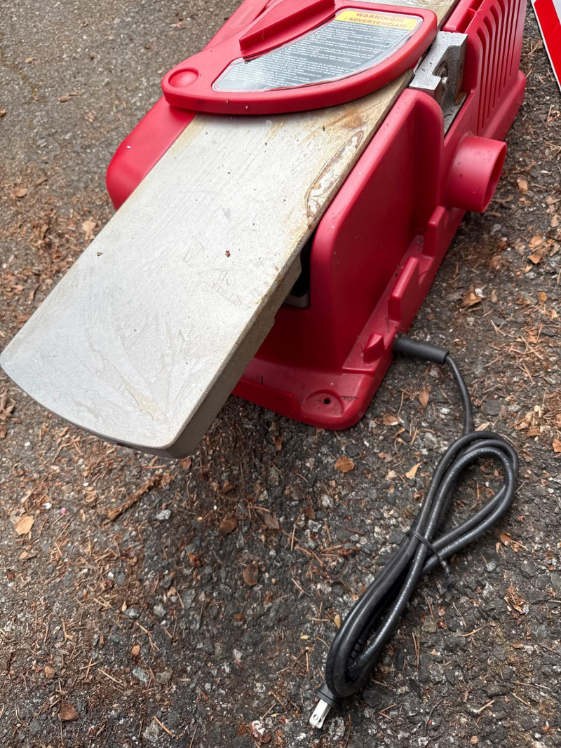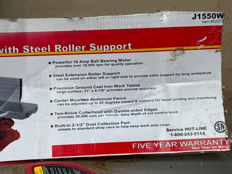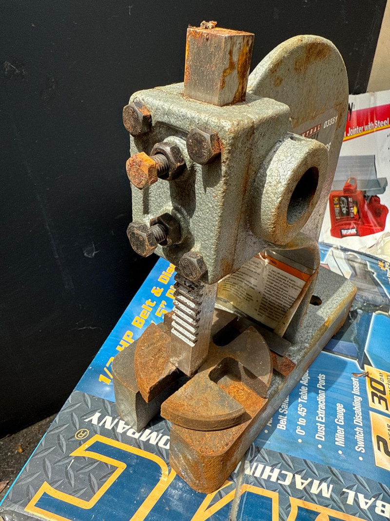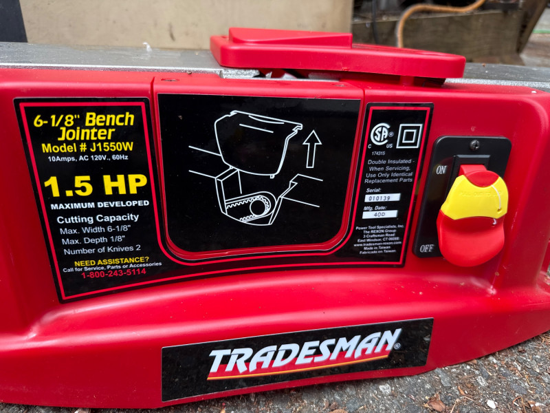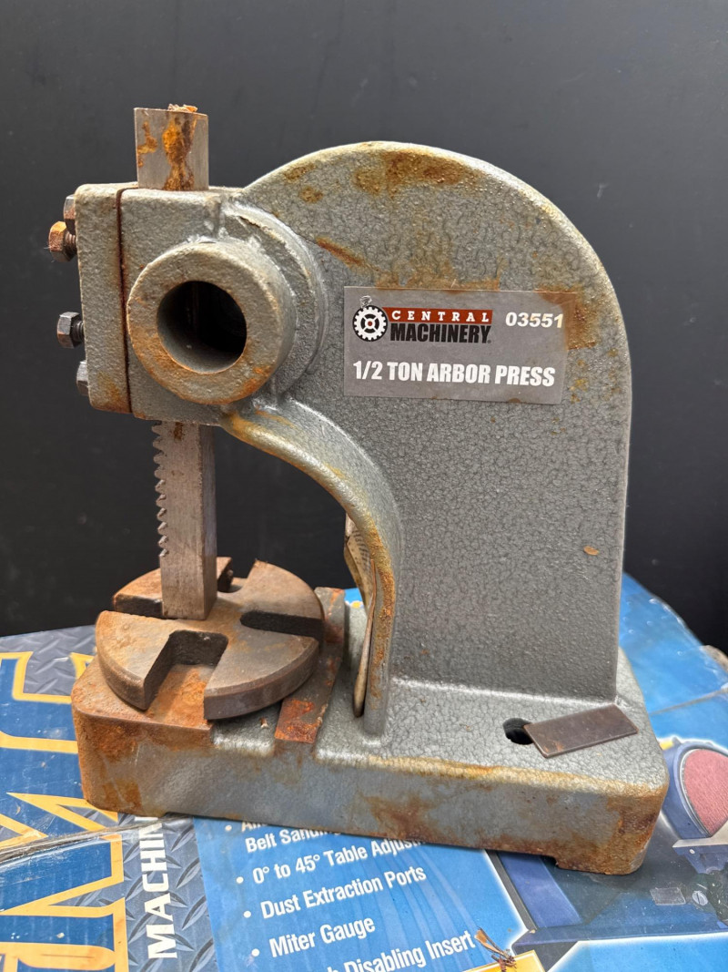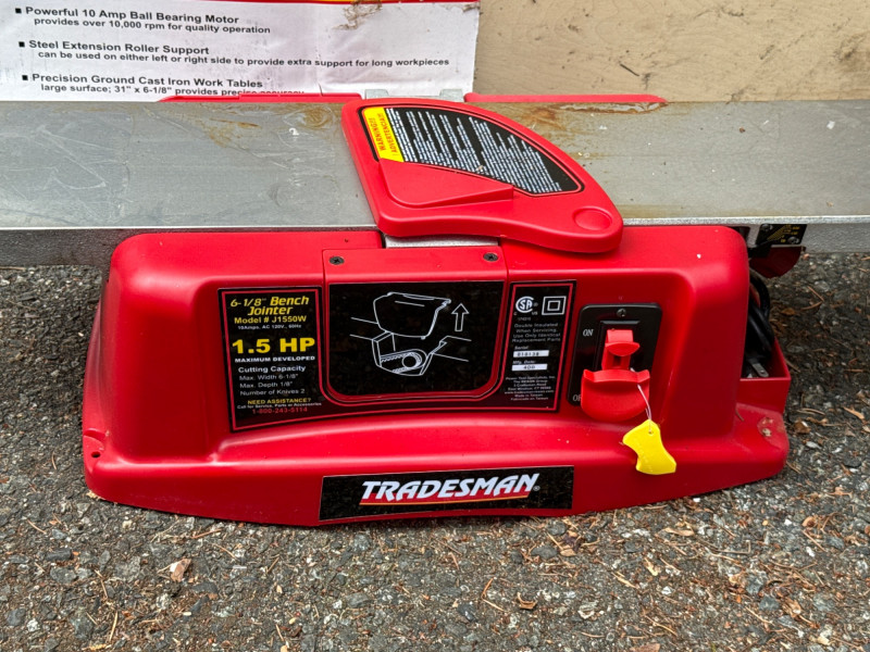 Tradesman 6 1/8in Bench Jointer is 30in long, 9in tall, 12in wide. Powered up. 1.5HP Includes roller bars and push guards. GMC 1/3HP belt and disc sander. NIB Vintage Arbor press. Some rust and currently missing handle.