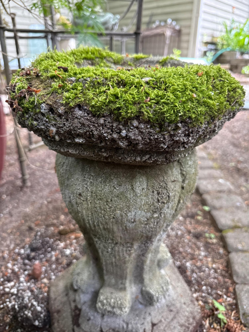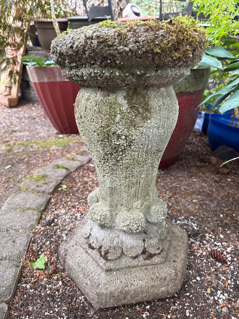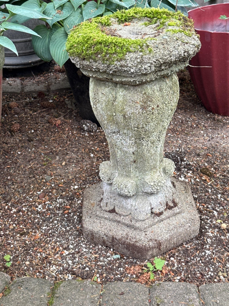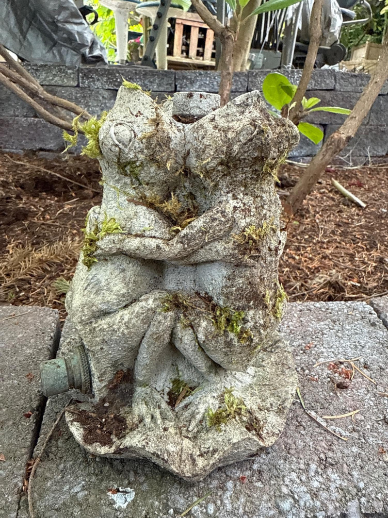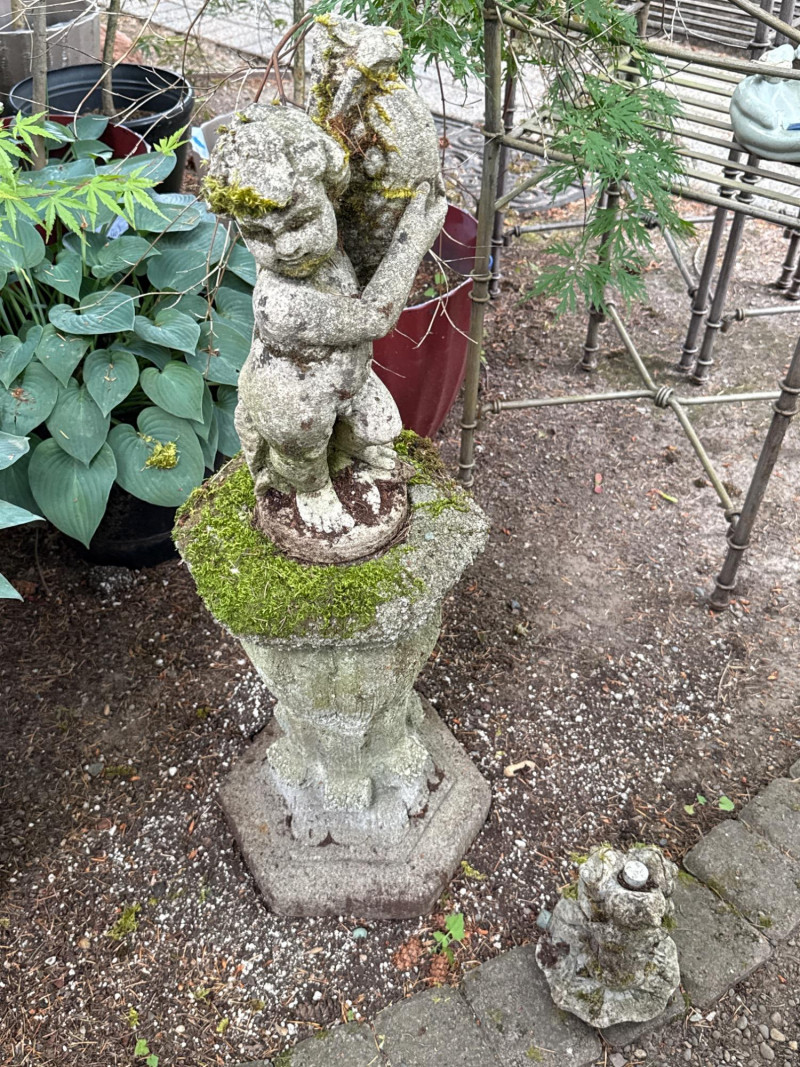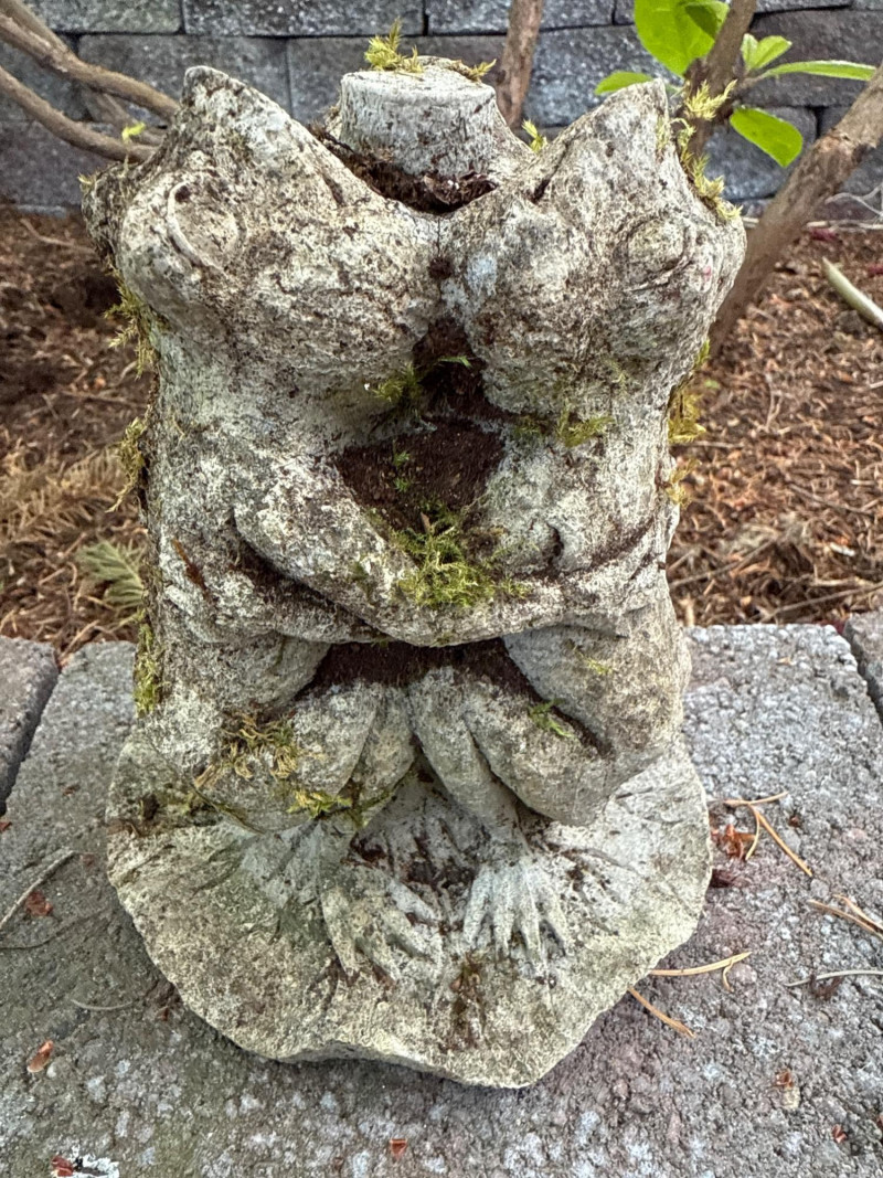 Heavy cement base for fountain. Some moss evident. Cherub and fish cement top is also prepped for fountain use. Smaller frog trio is also fountain capable.