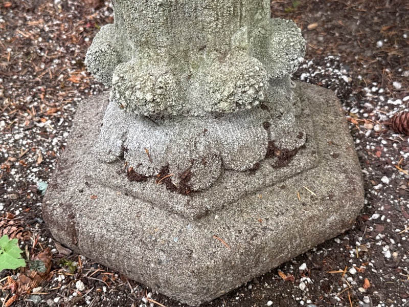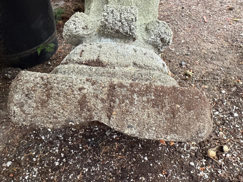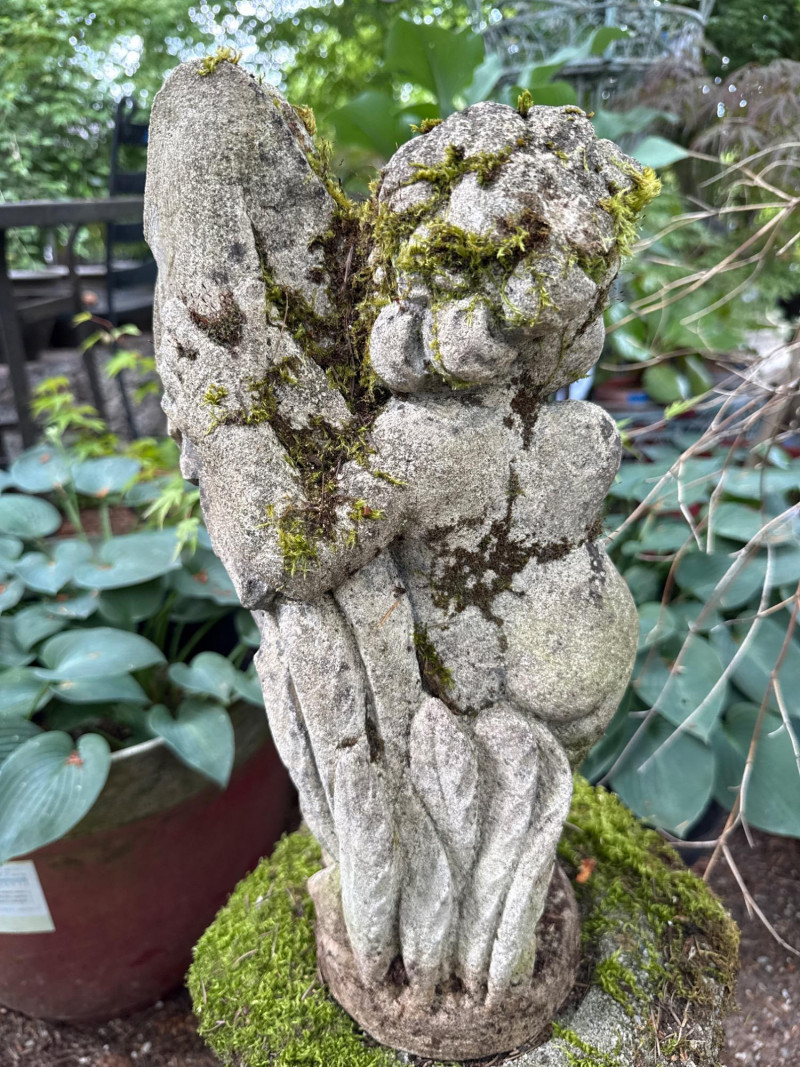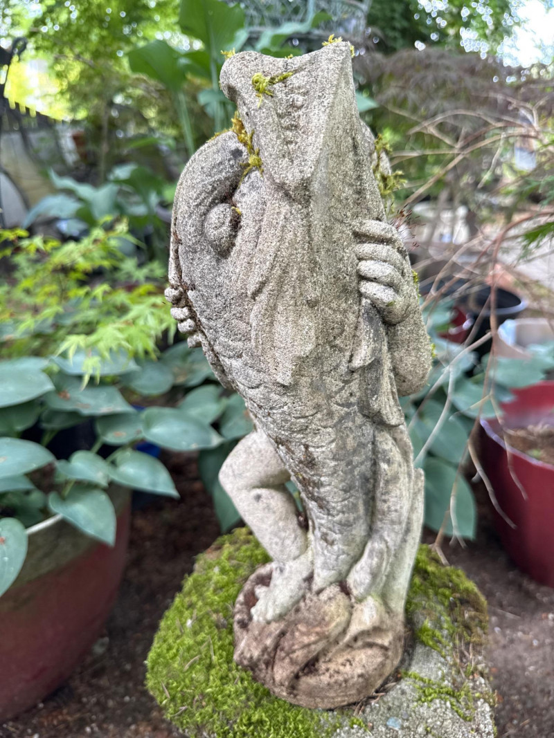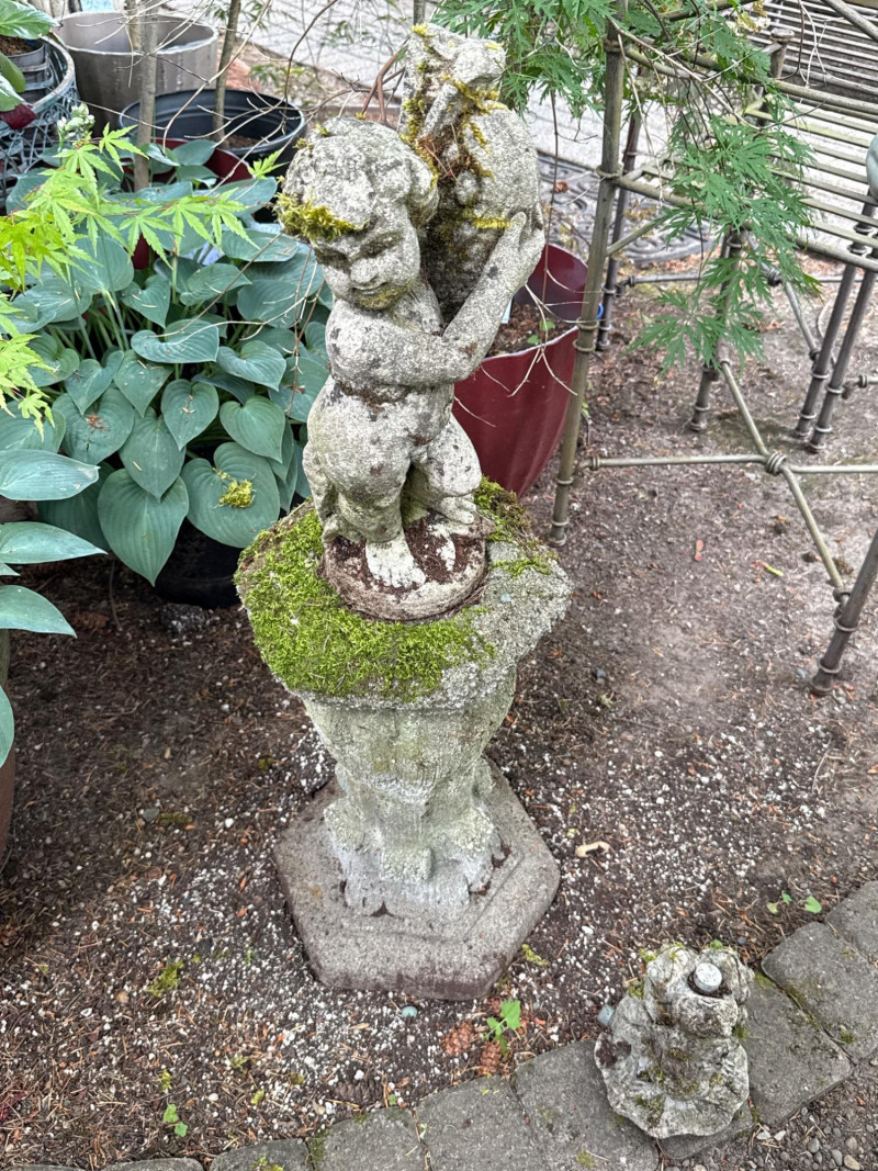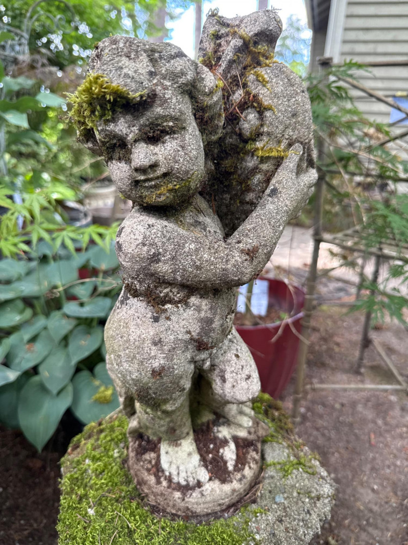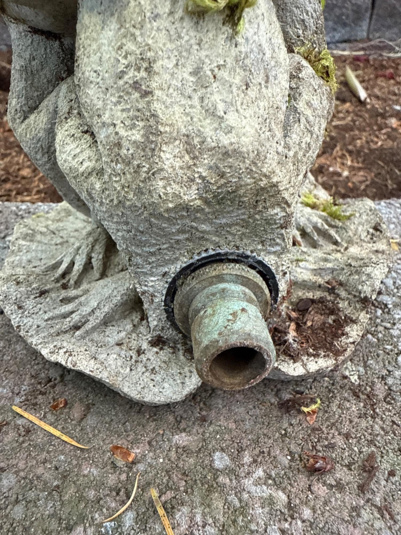 Heavy cement base for fountain. Some moss evident. Cherub and fish cement top is also prepped for fountain use. Smaller frog trio is also fountain capable.