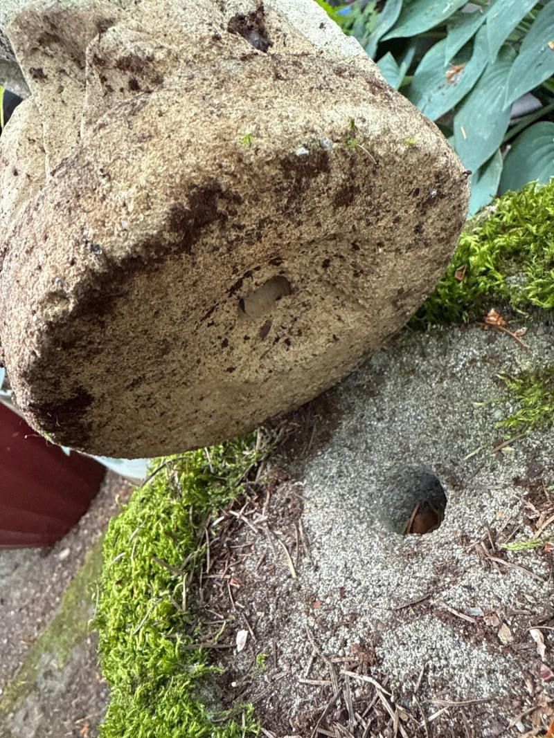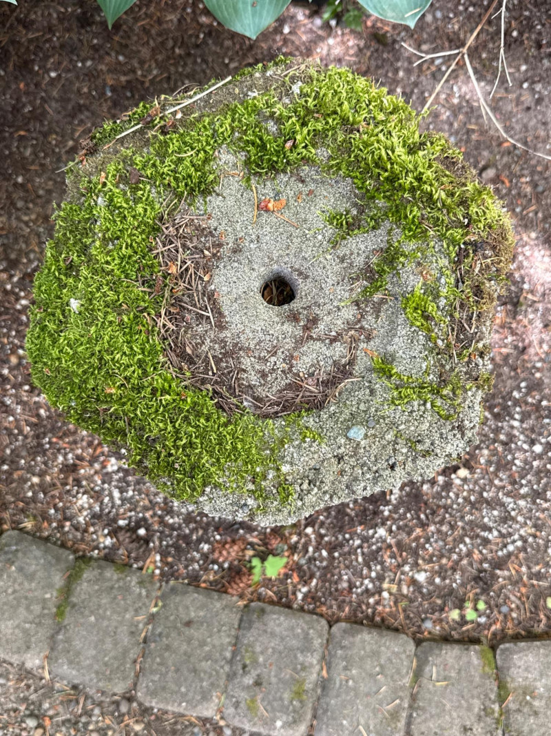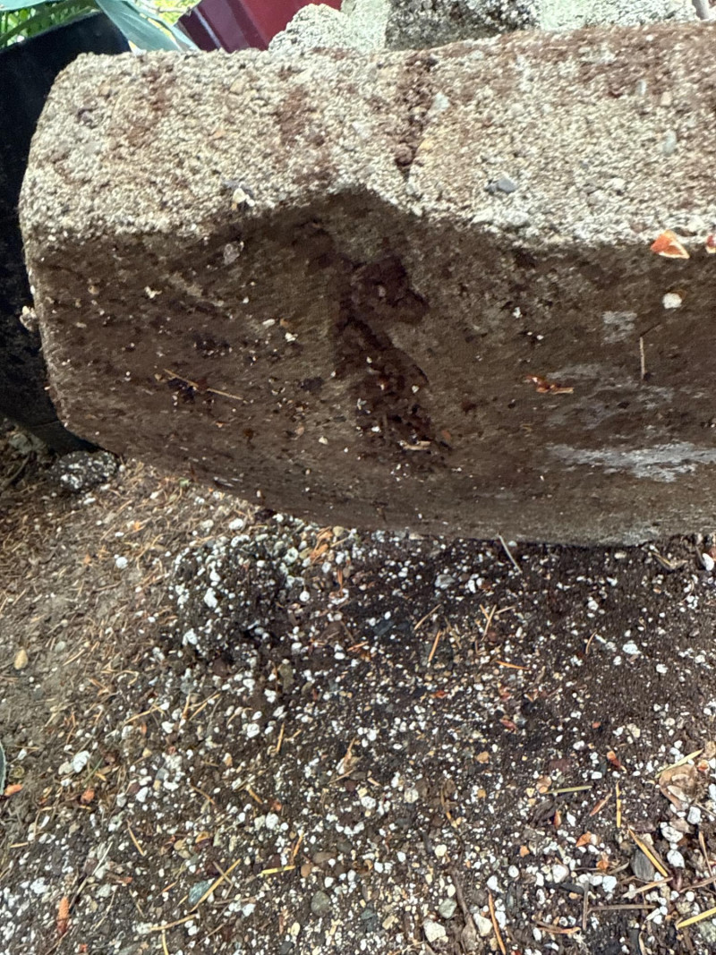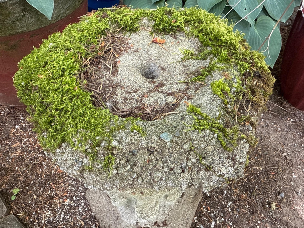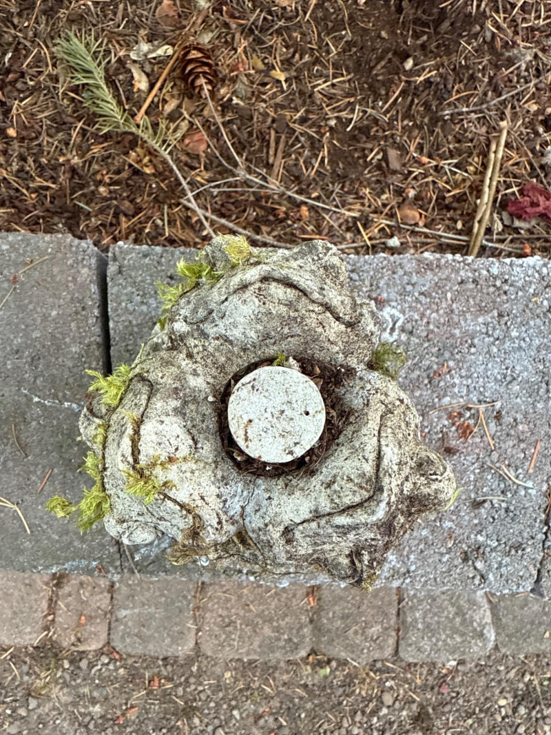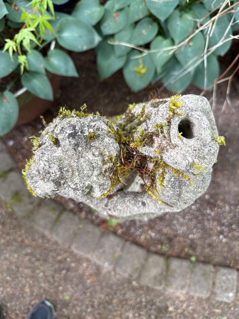 Heavy cement base for fountain. Some moss evident. Cherub and fish cement top is also prepped for fountain use. Smaller frog trio is also fountain capable.