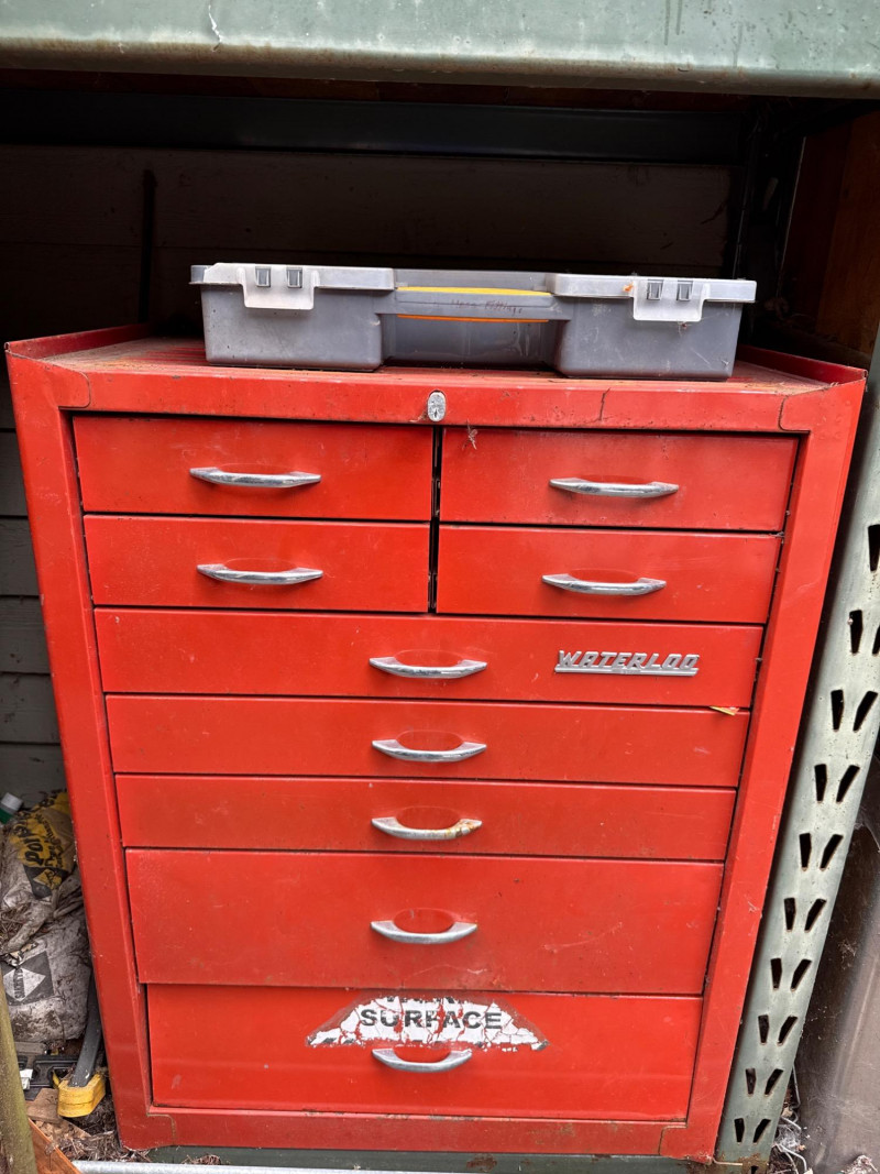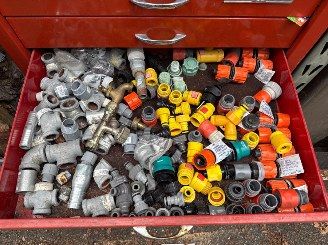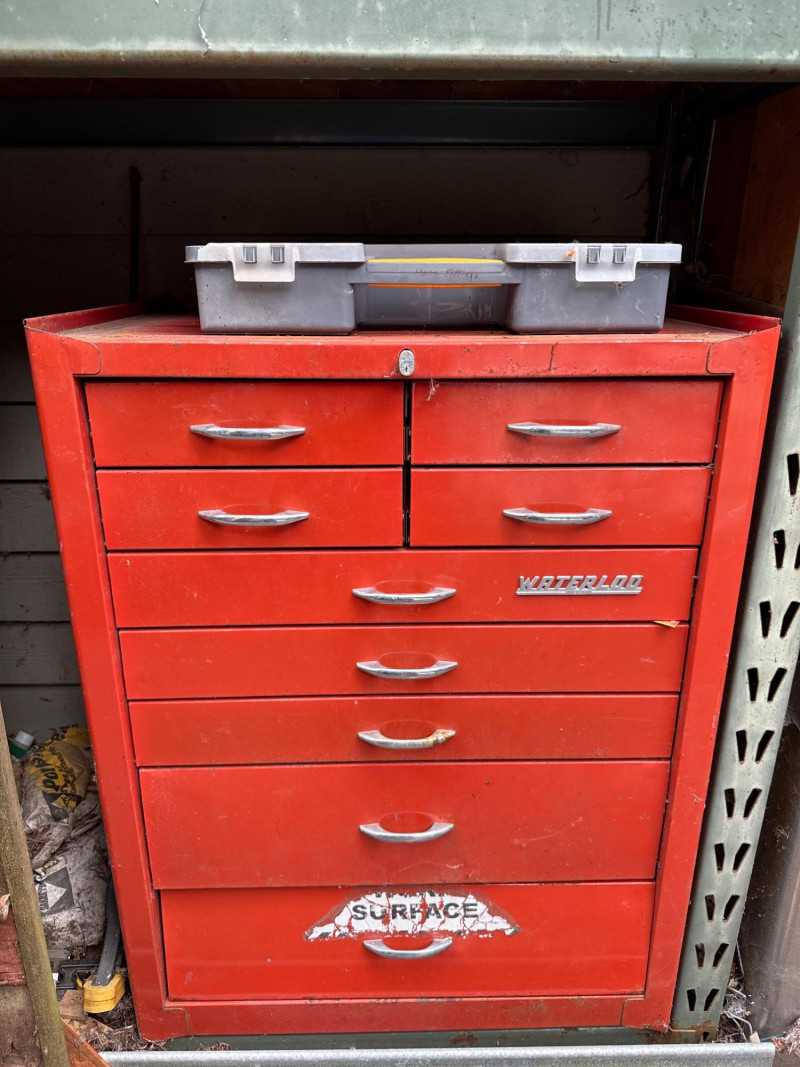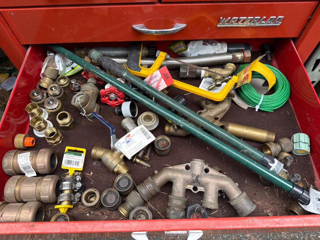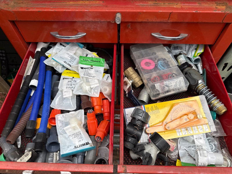 Waterloo tool chest loaded with gadgets and fittings, tools for irrigation systems. Keys not found yet. Nine drawers. Bottom one hasn't been put in properly and needs reset when empty Extra travel case with more fittings. Heavy, bring help to load.