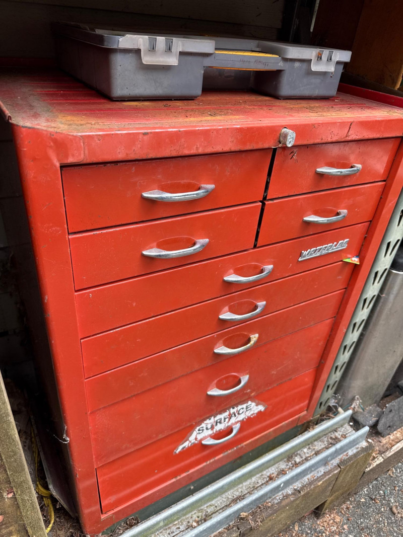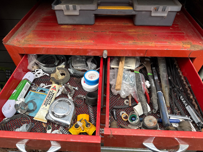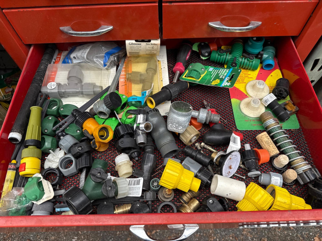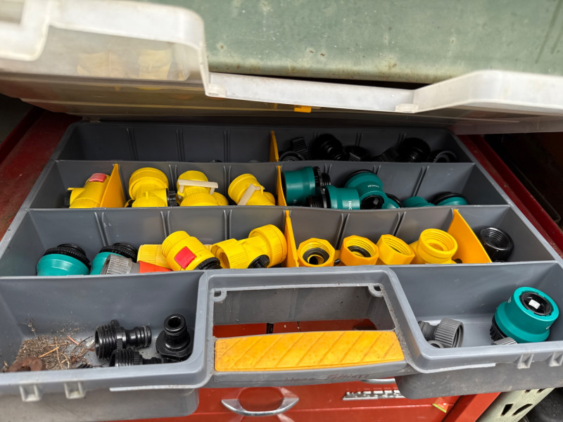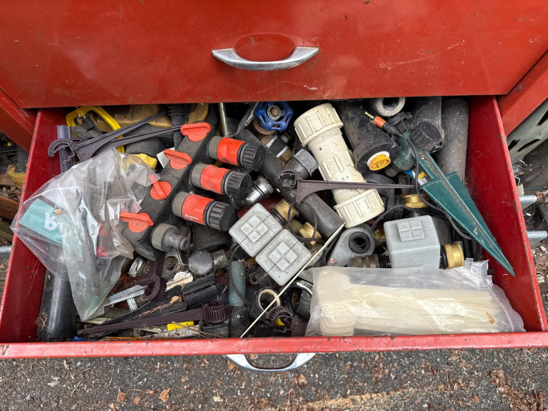 Waterloo tool chest loaded with gadgets and fittings, tools for irrigation systems. Keys not found yet. Nine drawers. Bottom one hasn't been put in properly and needs reset when empty Extra travel case with more fittings. Heavy, bring help to load.