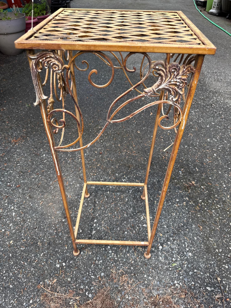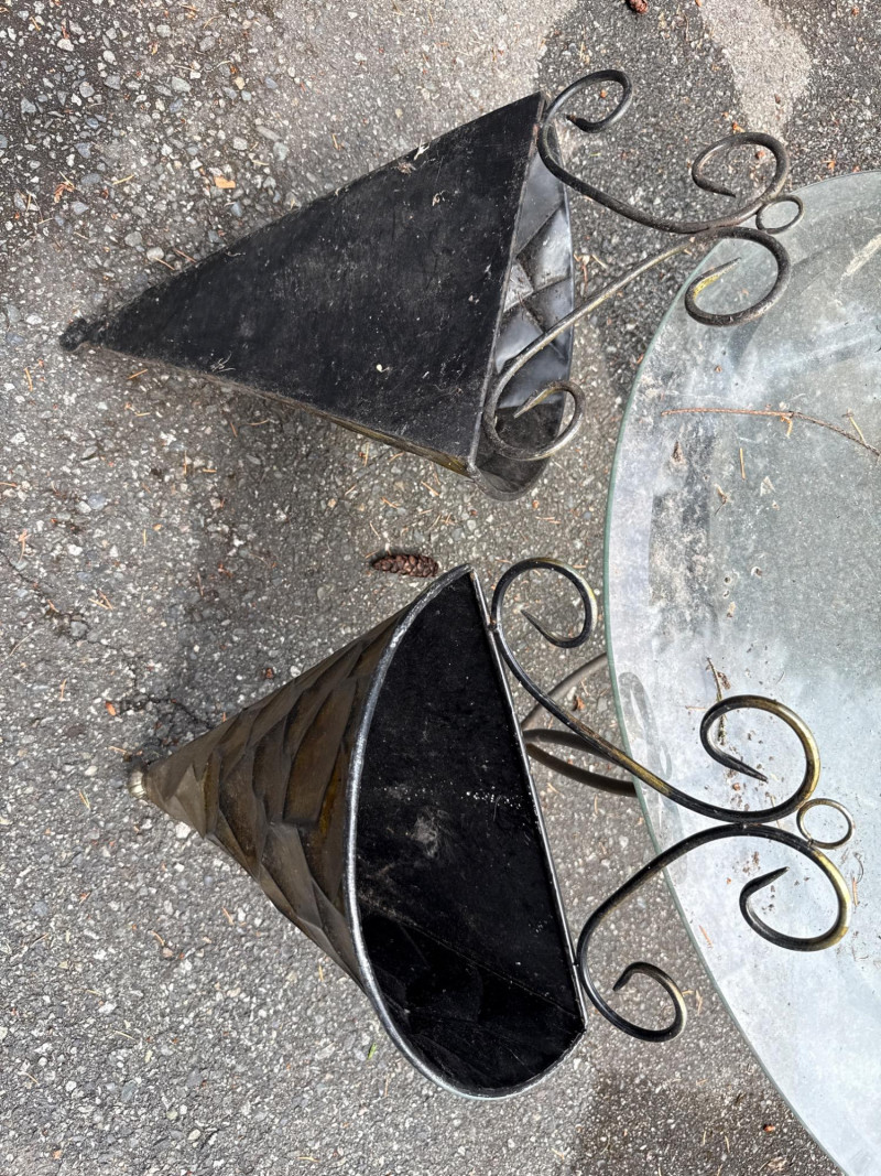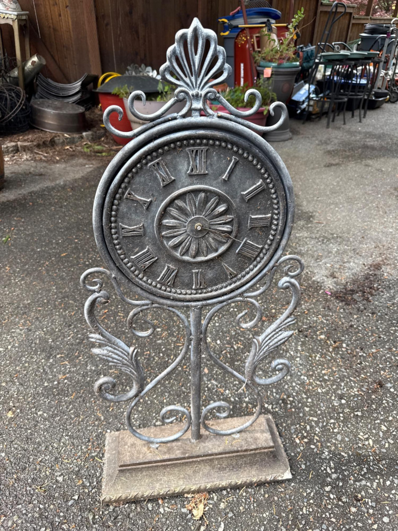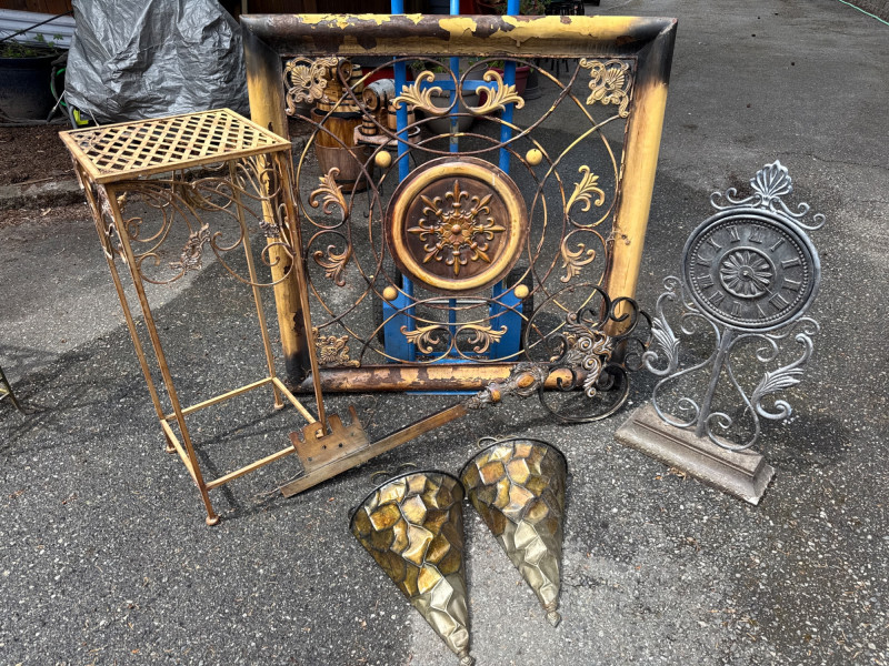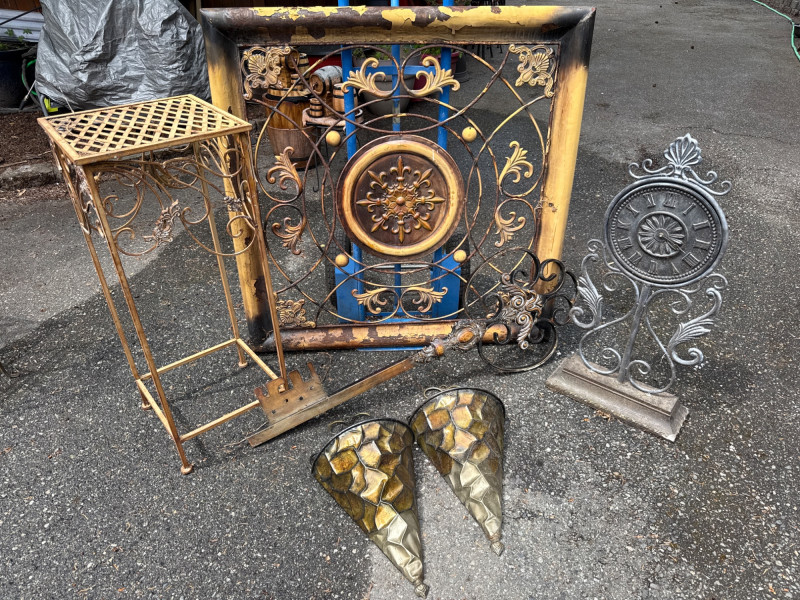 Six pieces of outdoor metal decor Square wall art is 45in wide. 45in long Plant Table is 15in wide, 37.5in tall. Heavy solid metal Two wall mounted baskets Metal wall mounted key Clock needs cleaning and new batteries. Some resin components.