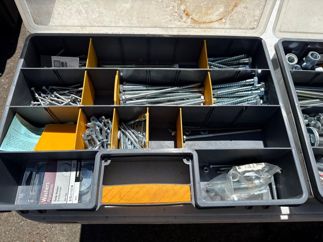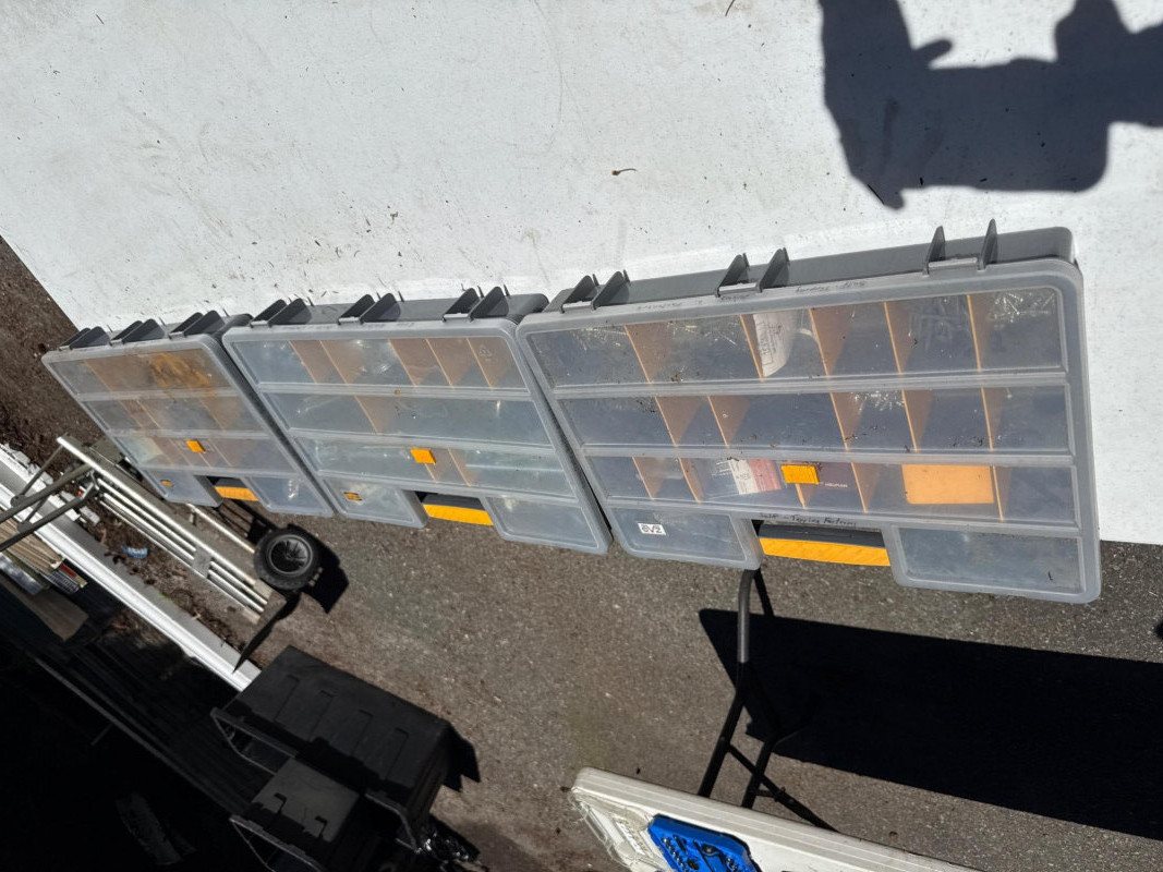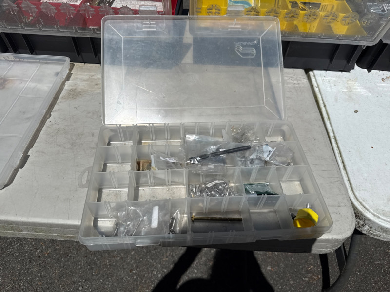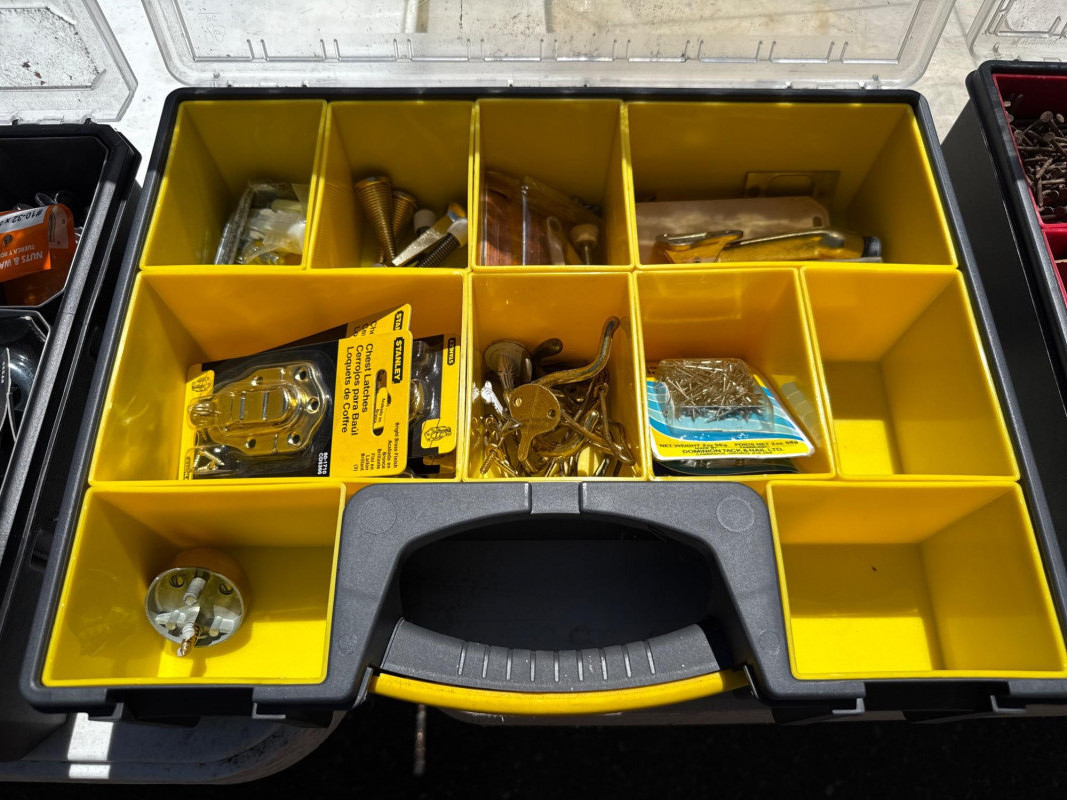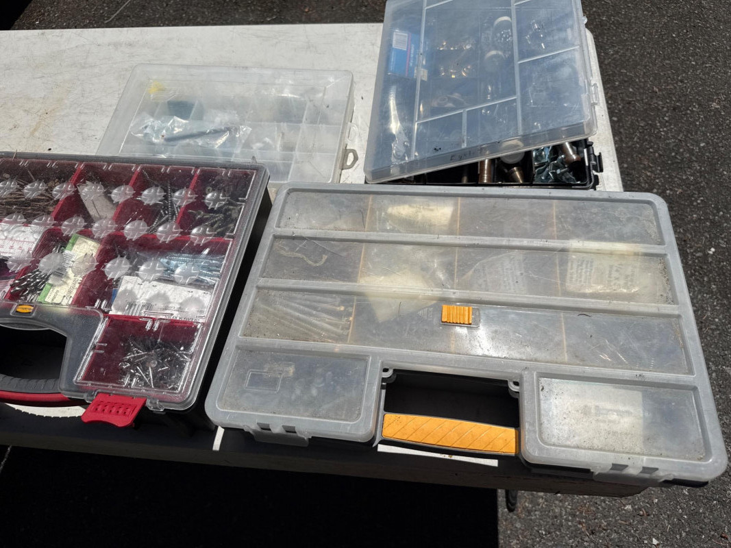 Several travel boxes with divided trays. Loaded with hardware, fasteners and gadgets. Matching boxes stack together. Large lot with lots of value.