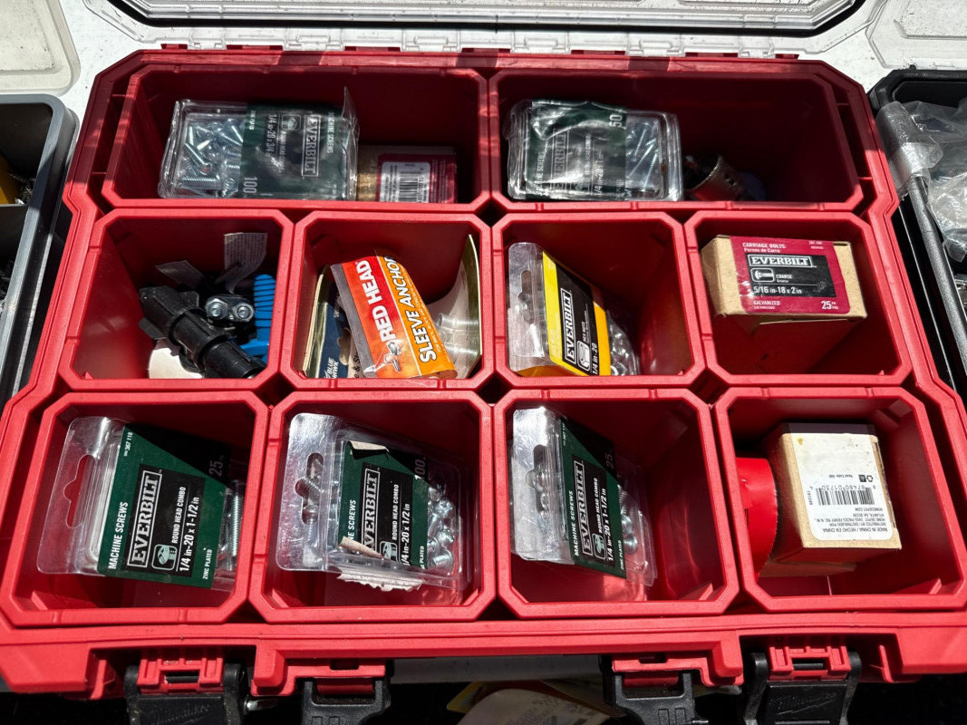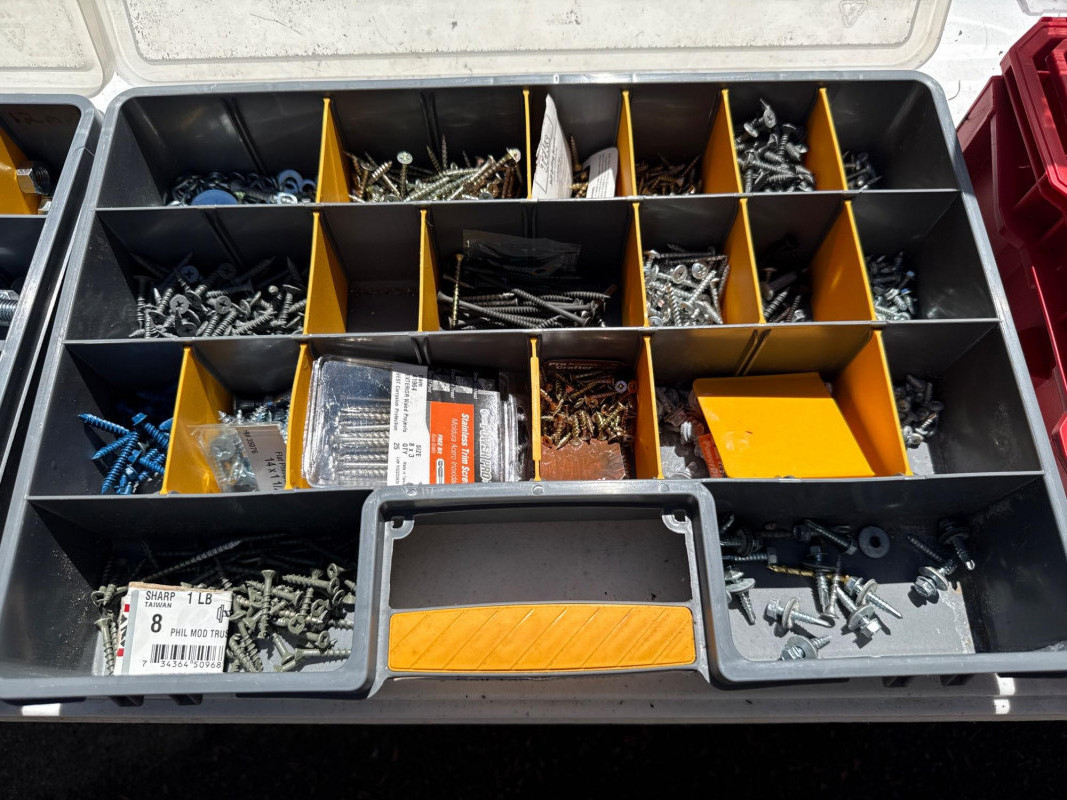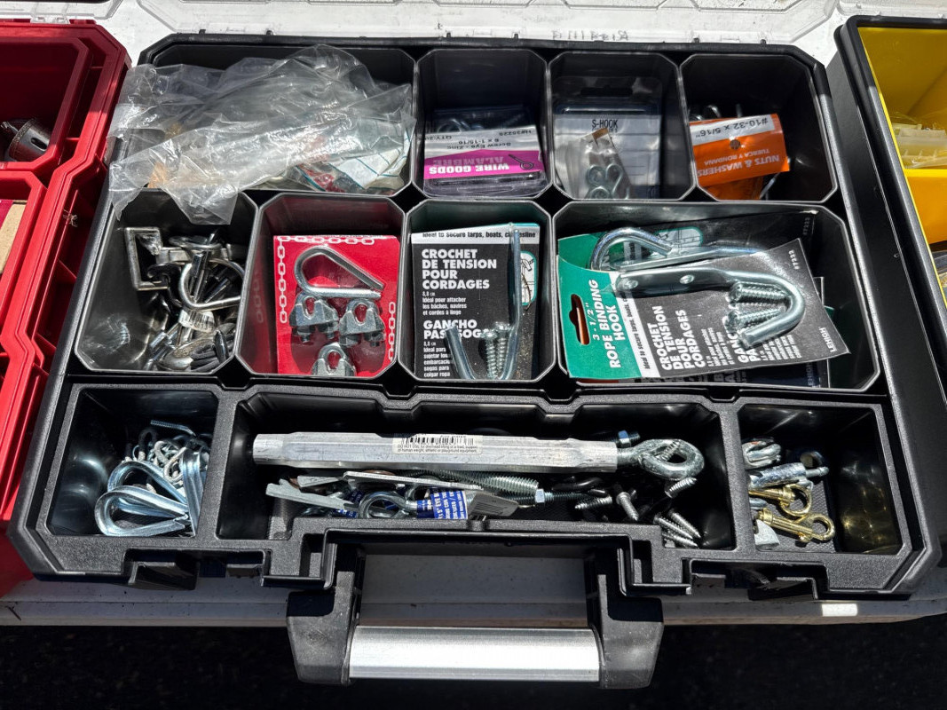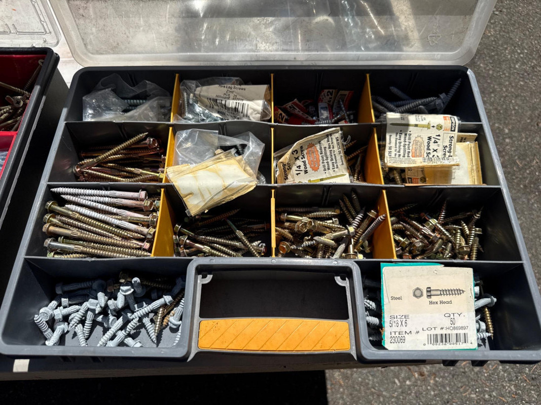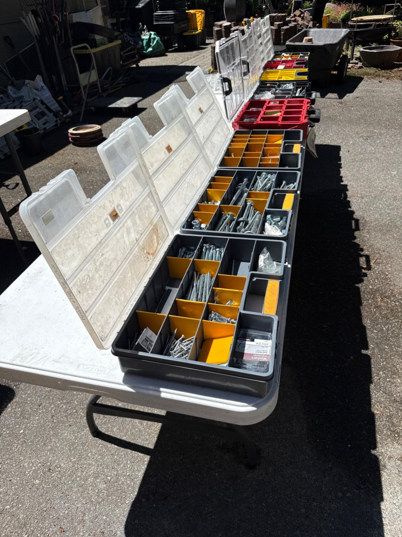 Several travel boxes with divided trays. Loaded with hardware, fasteners and gadgets. Matching boxes stack together. Large lot with lots of value.