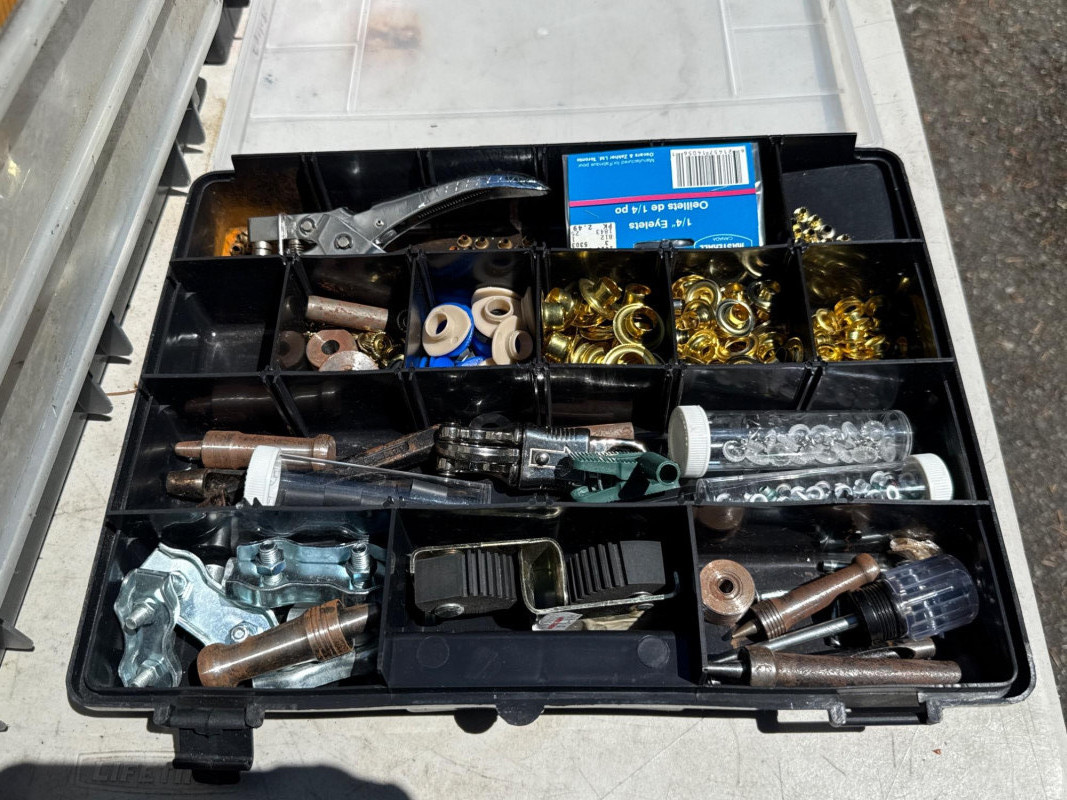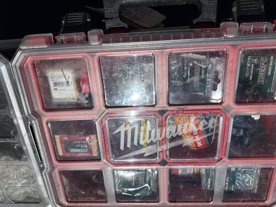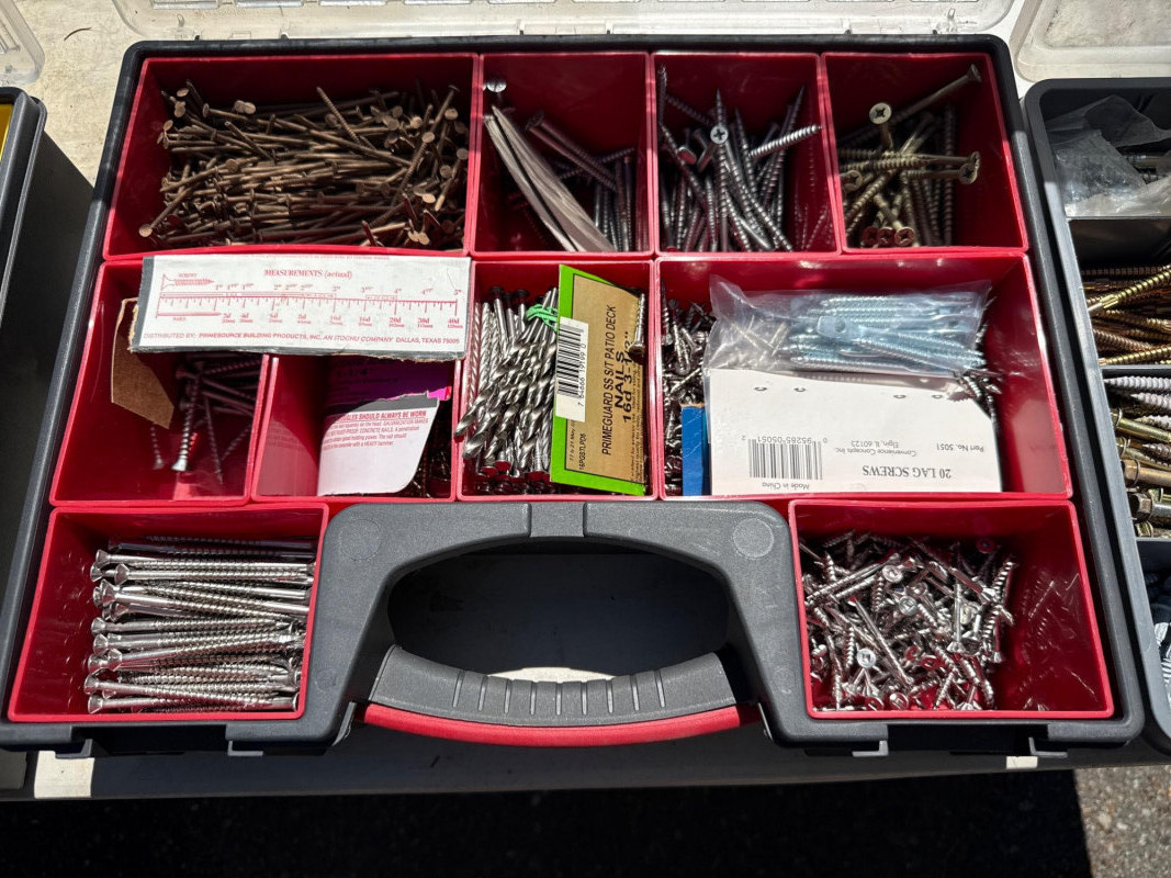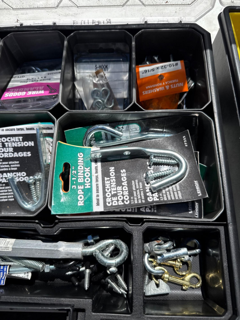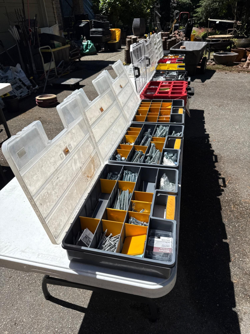 Several travel boxes with divided trays. Loaded with hardware, fasteners and gadgets. Matching boxes stack together. Large lot with lots of value.