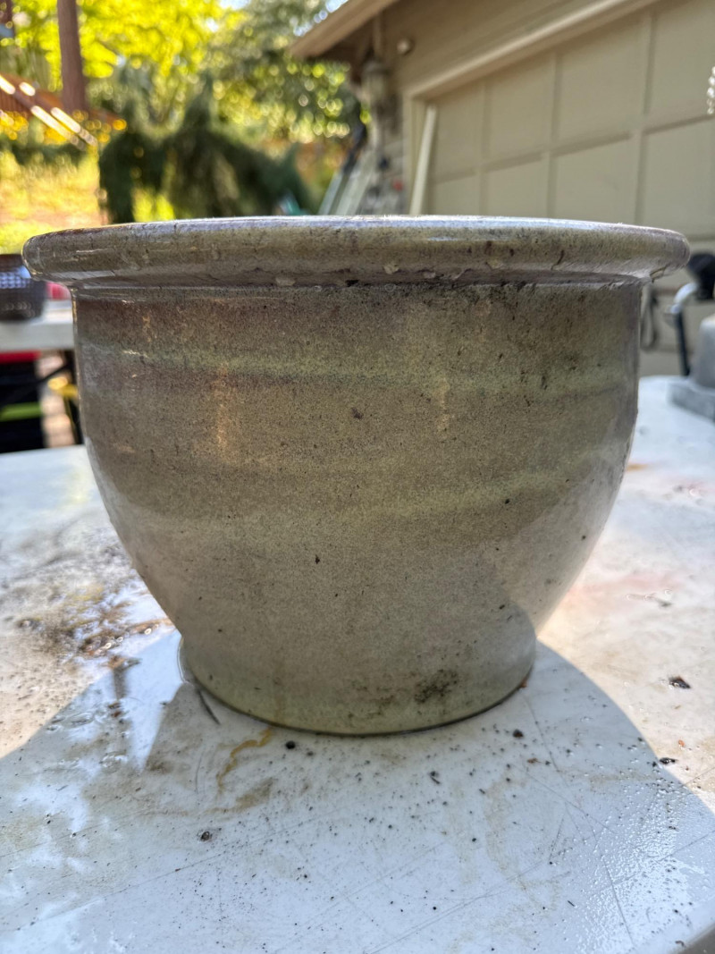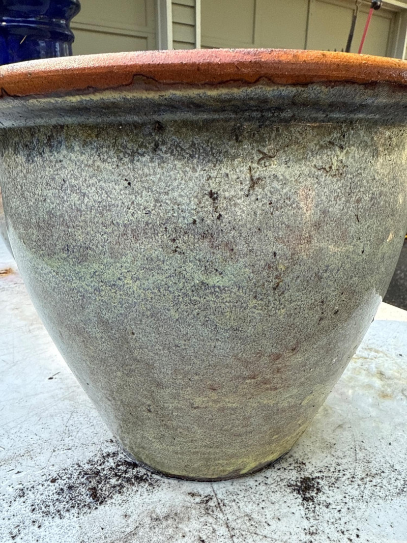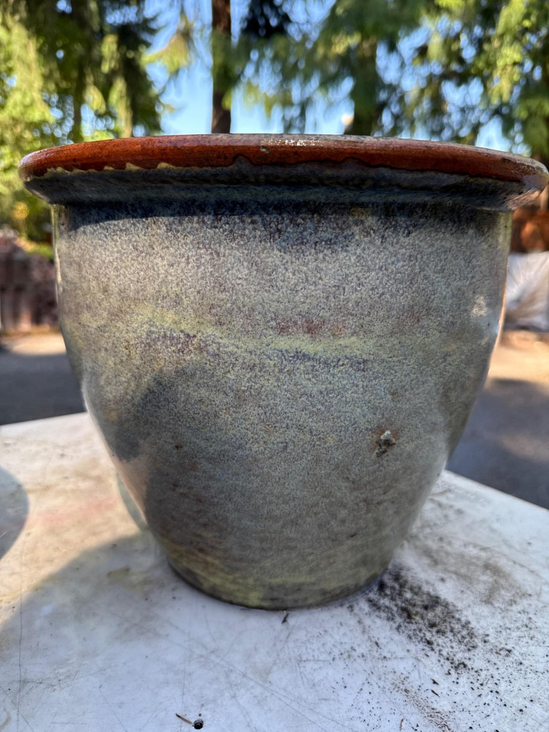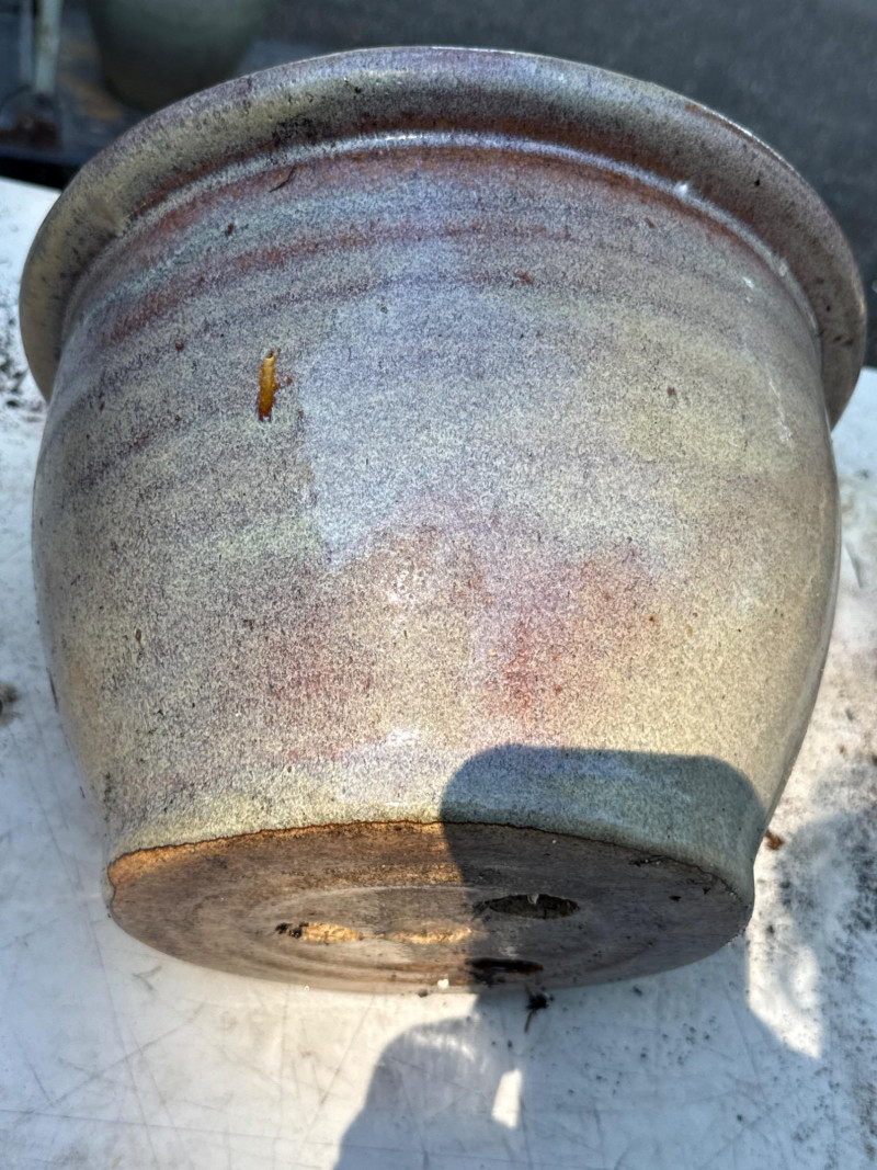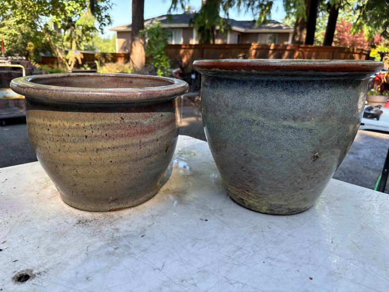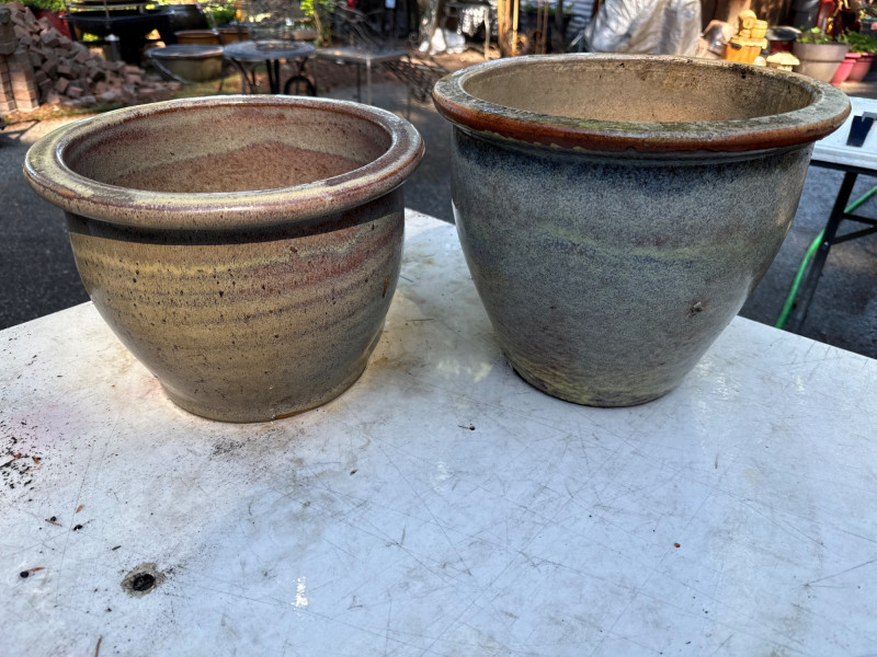 Large pot is 9in tall, 12in wide Smaller pot is 8.5in tall, 12in wide Neither have water trays. Both in great condition with muted quality glaze work.