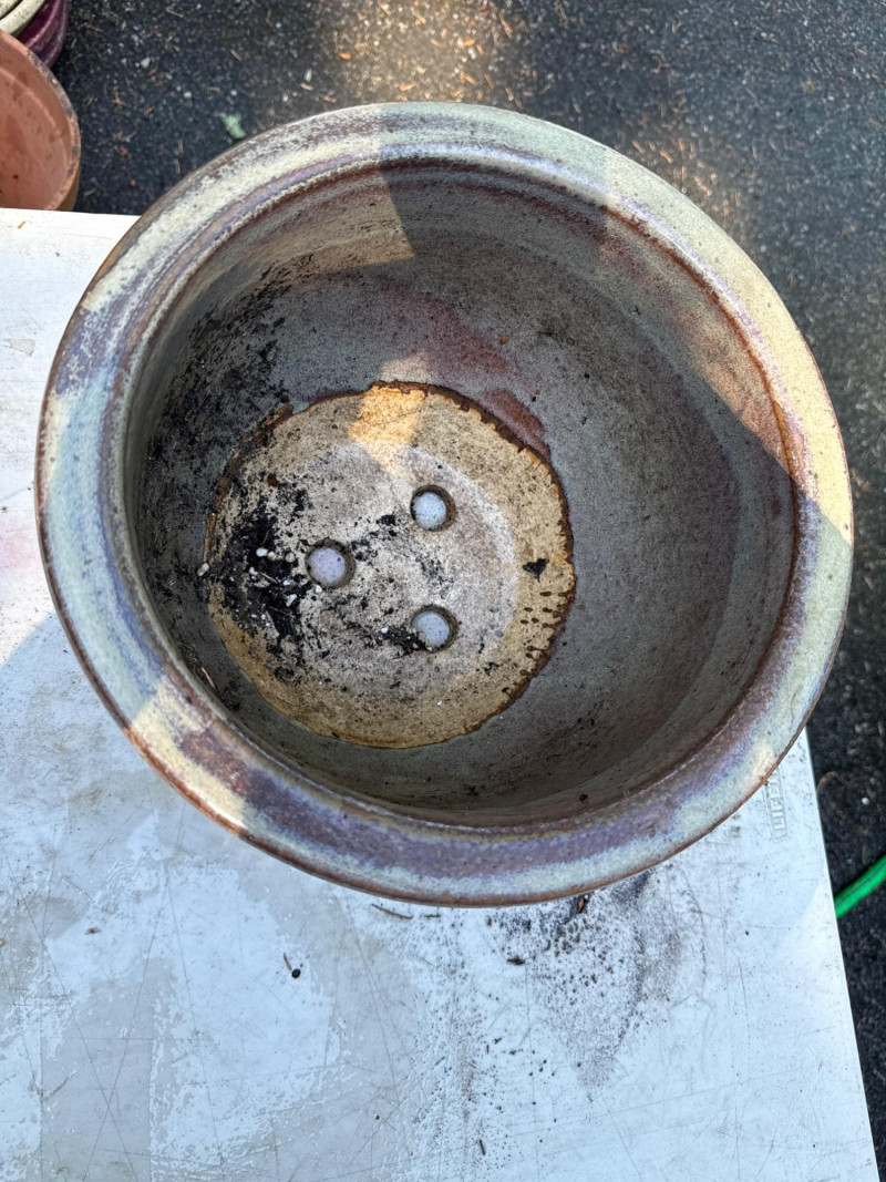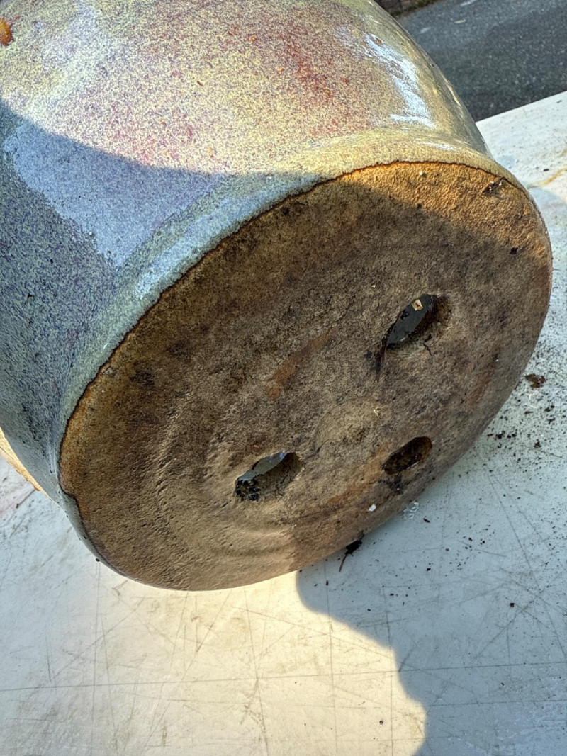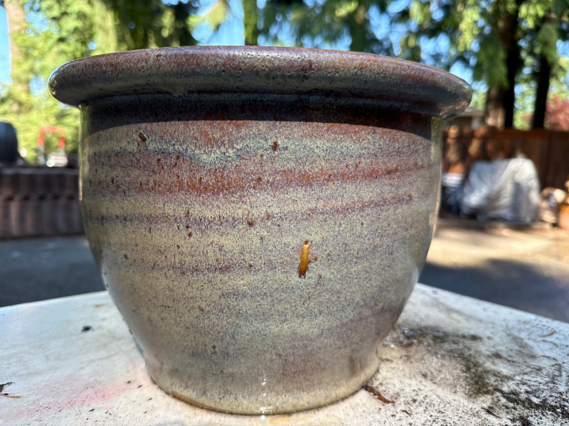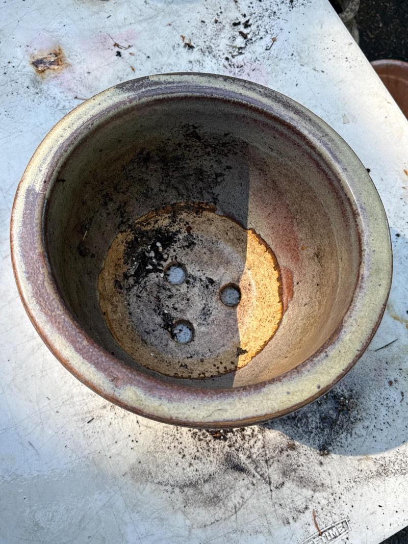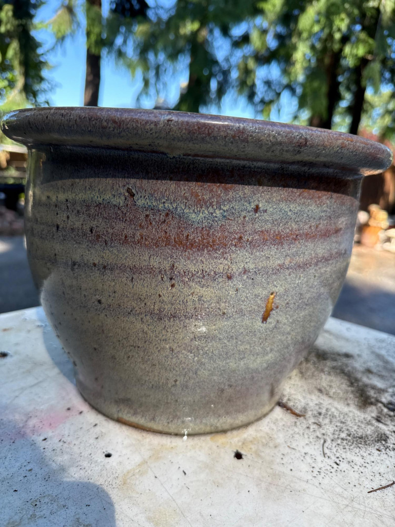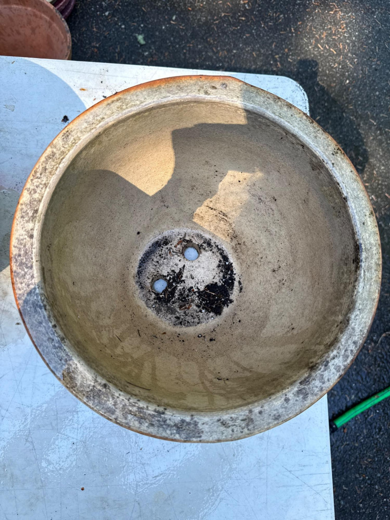 Large pot is 9in tall, 12in wide Smaller pot is 8.5in tall, 12in wide Neither have water trays. Both in great condition with muted quality glaze work.