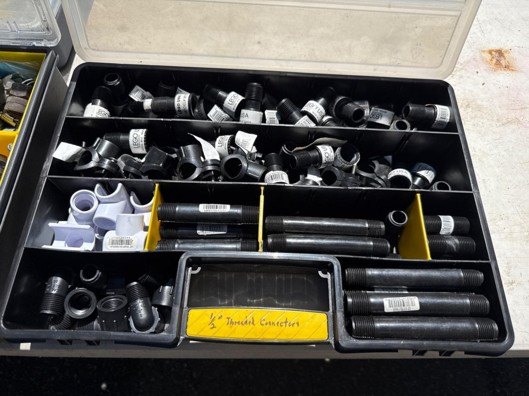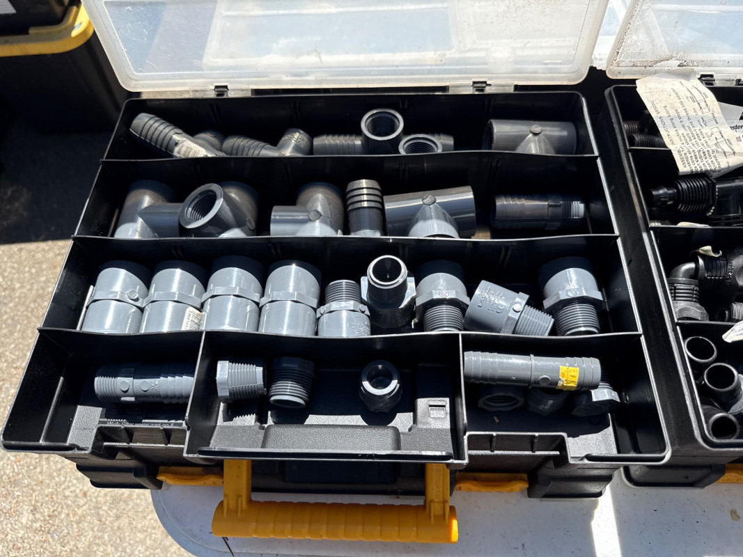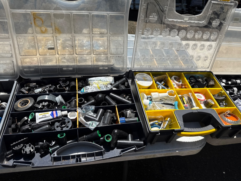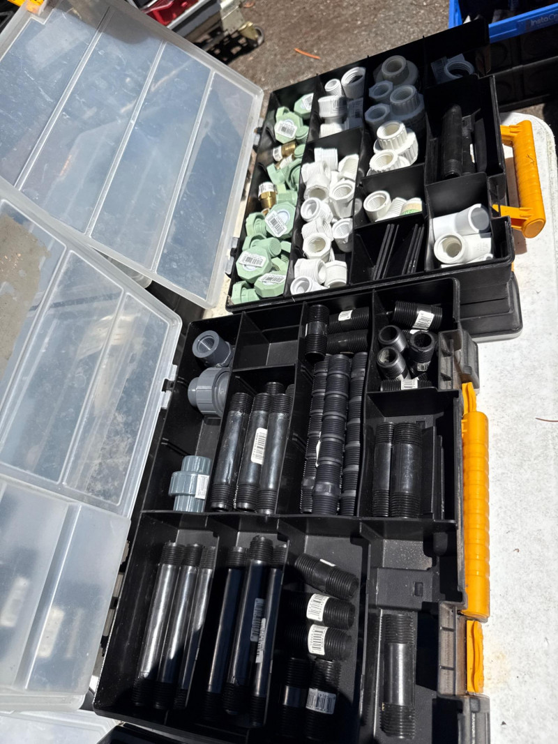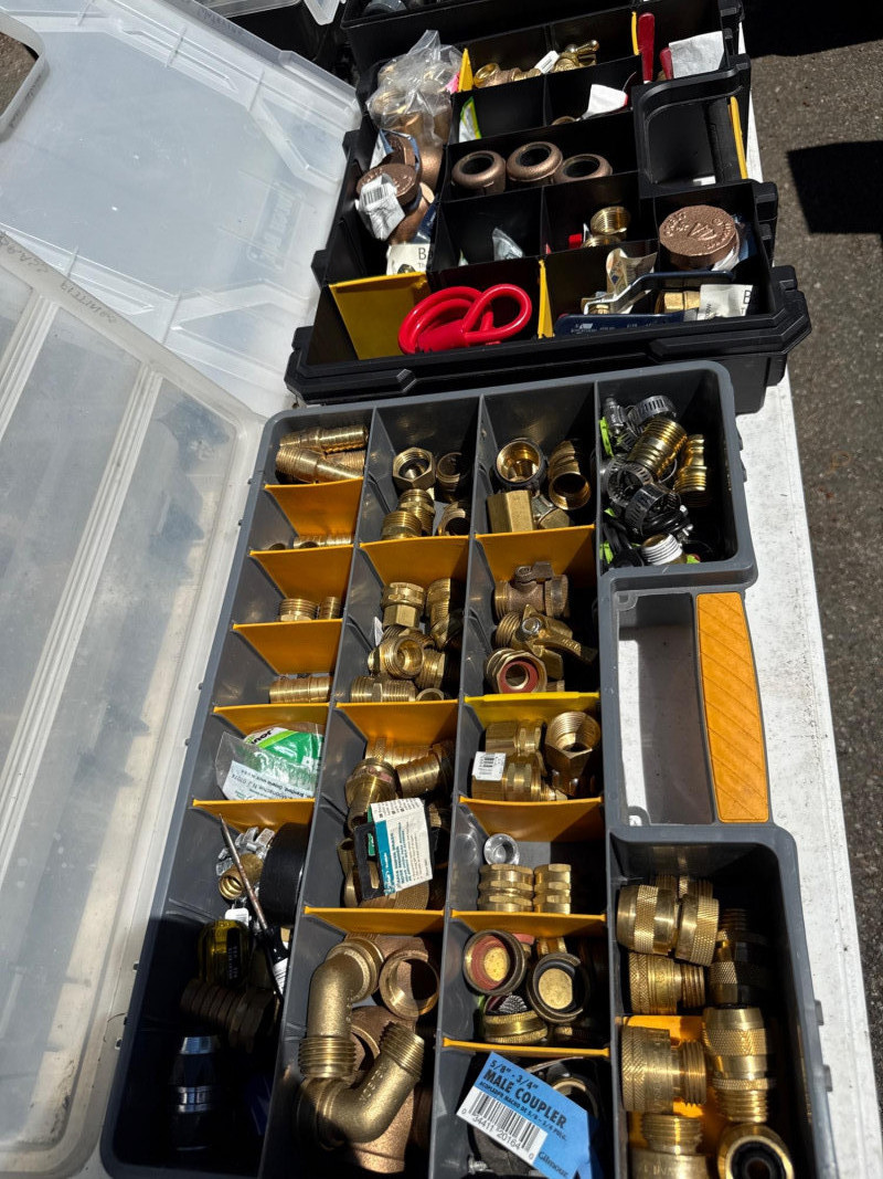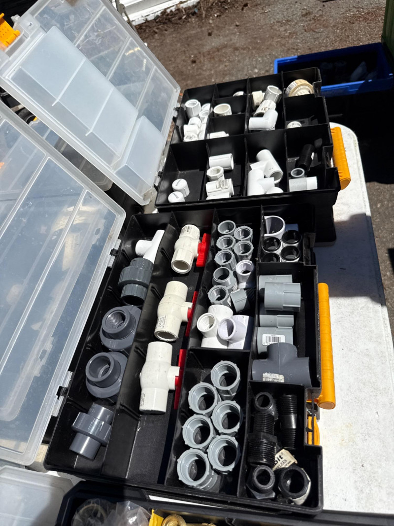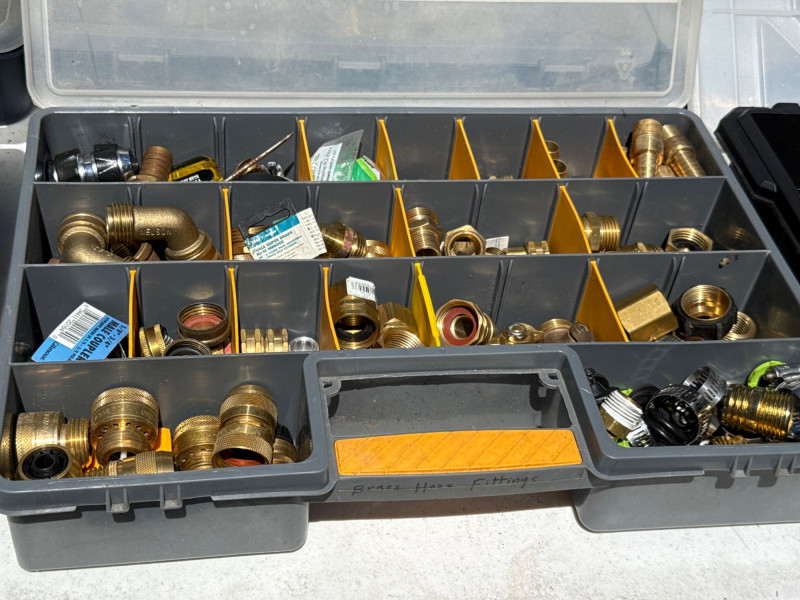 13 portable divided boxes. Loaded with hardware, fittings, fasteners and connections. Like boxes nest together for stability. Some are double sided. Plastic, PVC, Copper and metal materials. Lots of value here.