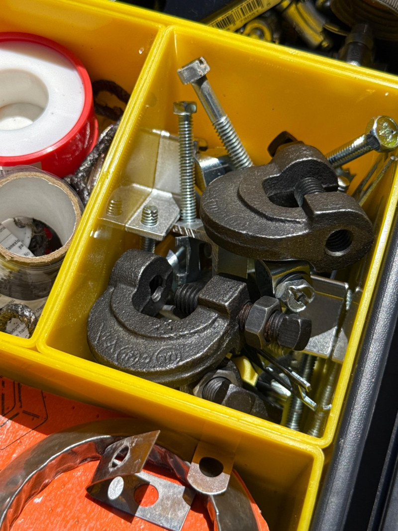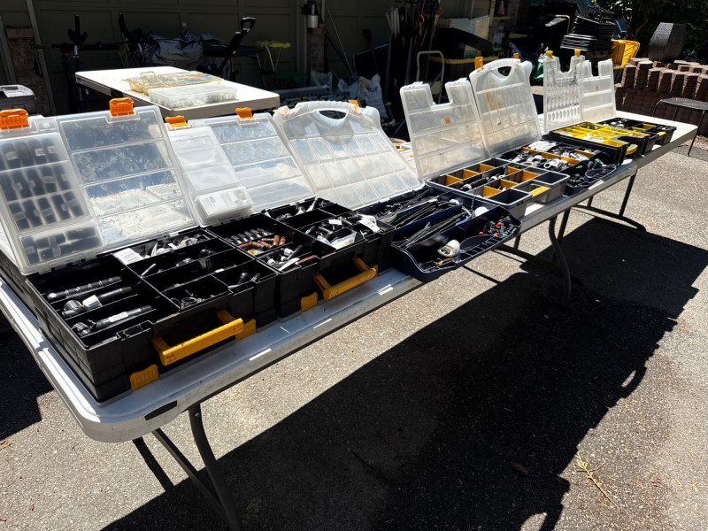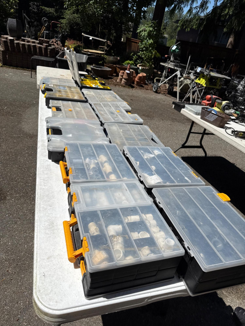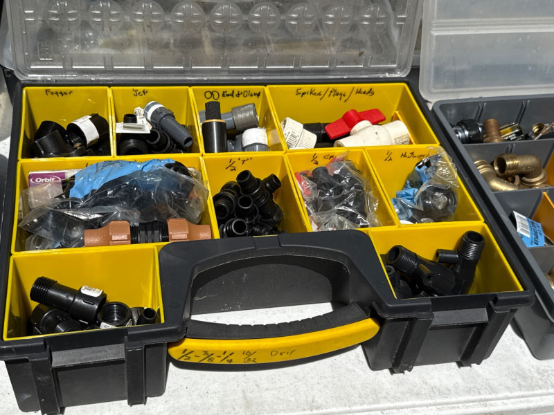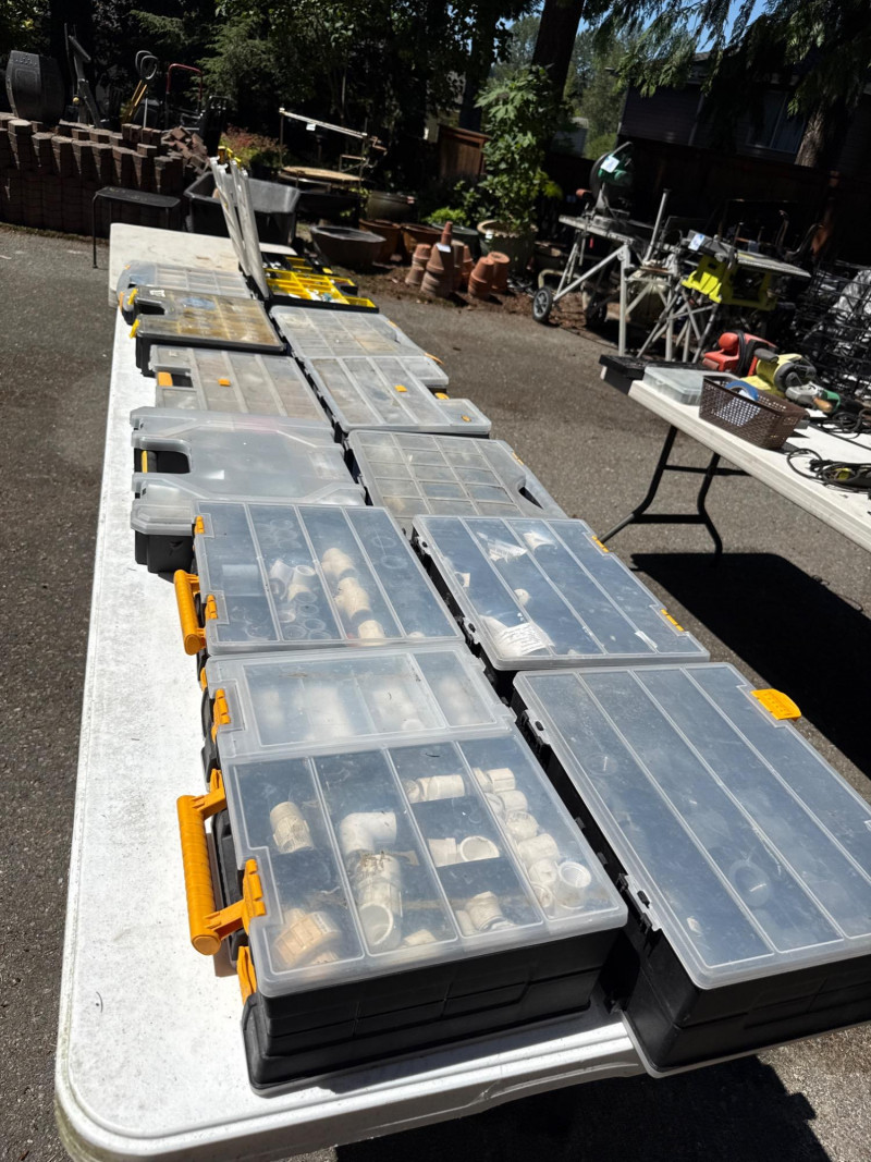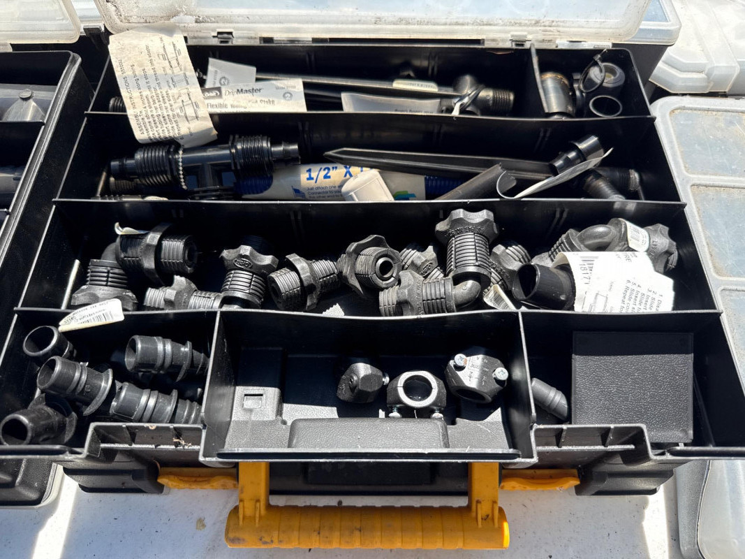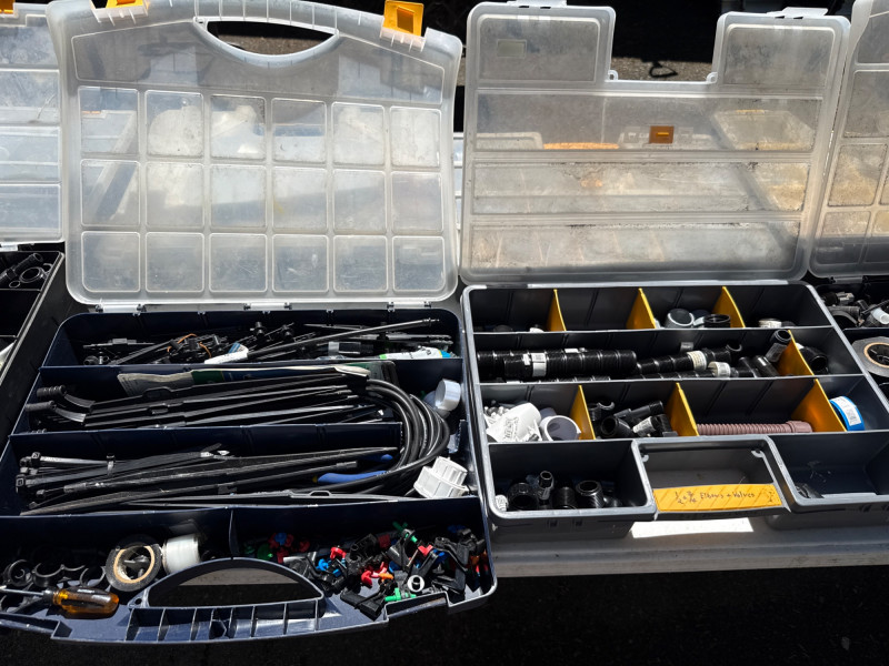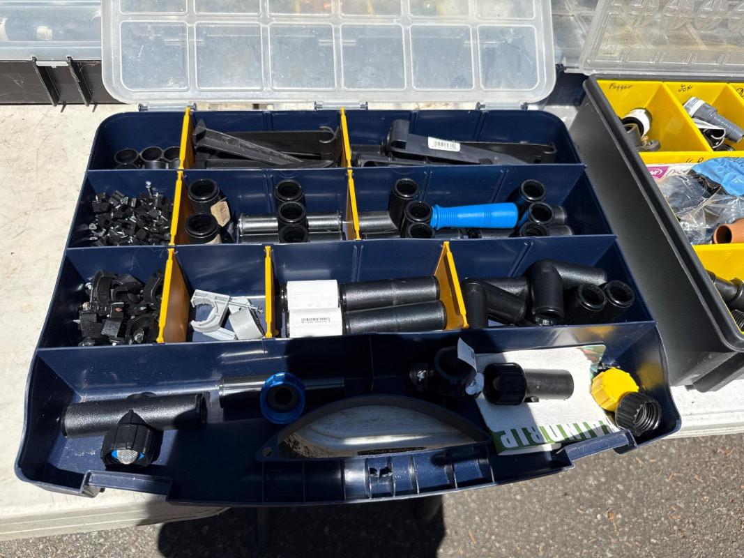 13 portable divided boxes. Loaded with hardware, fittings, fasteners and connections. Like boxes nest together for stability. Some are double sided. Plastic, PVC, Copper and metal materials. Lots of value here.