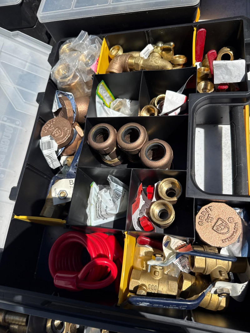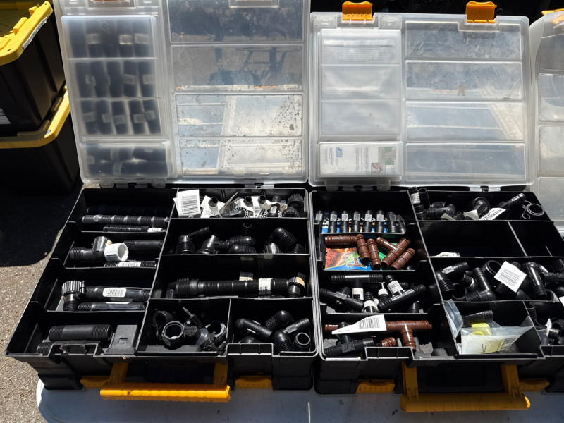 Lot # 128 - Stack of Divided Boxes with Plumbing, Fittings and Hardware