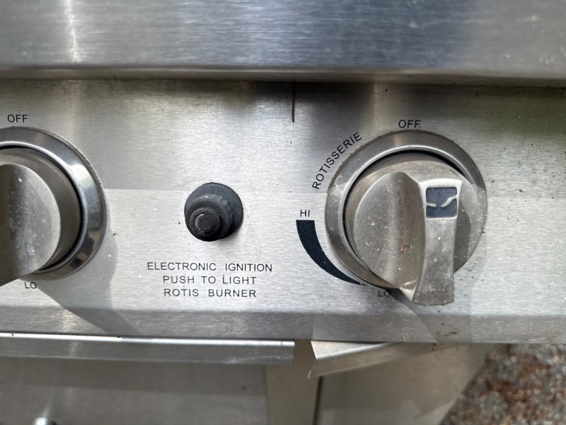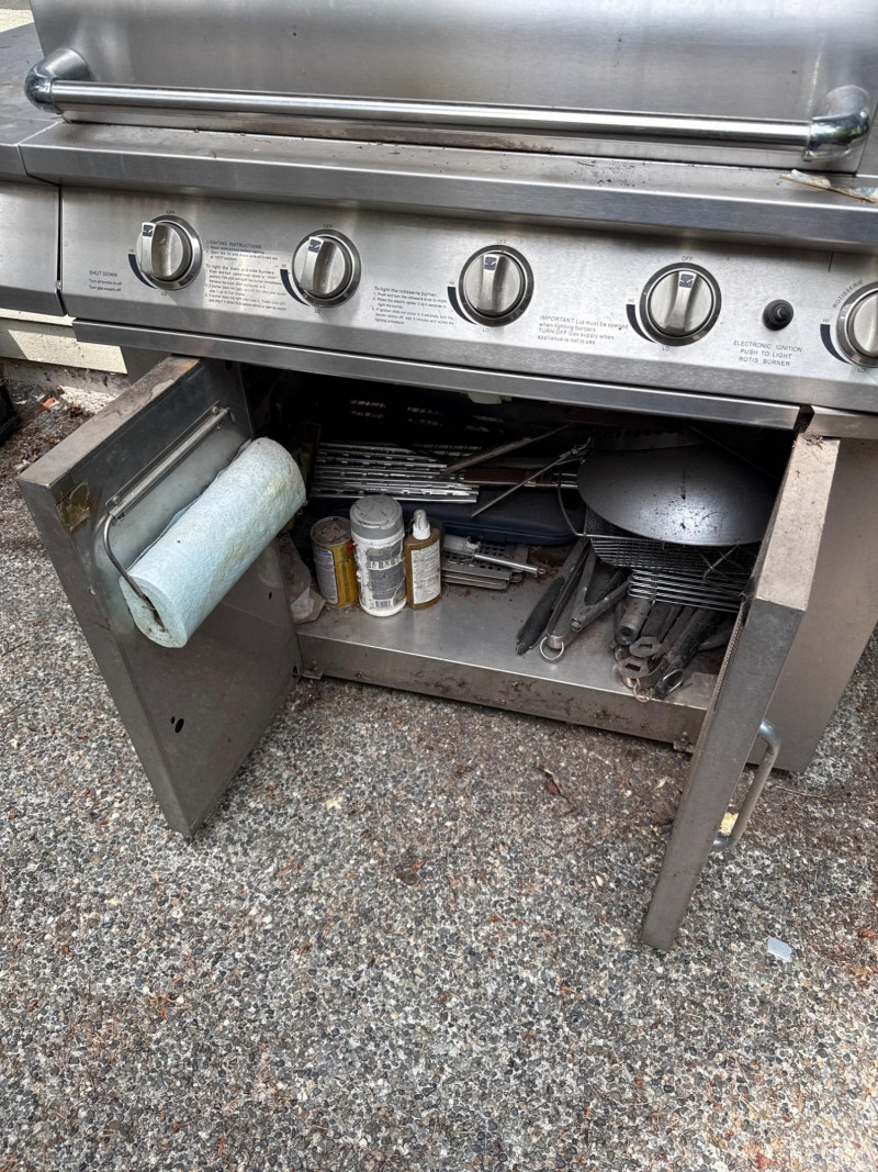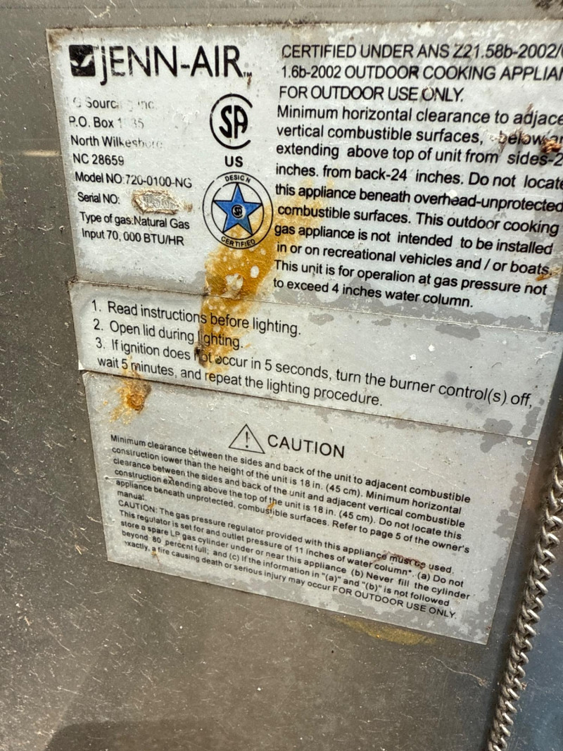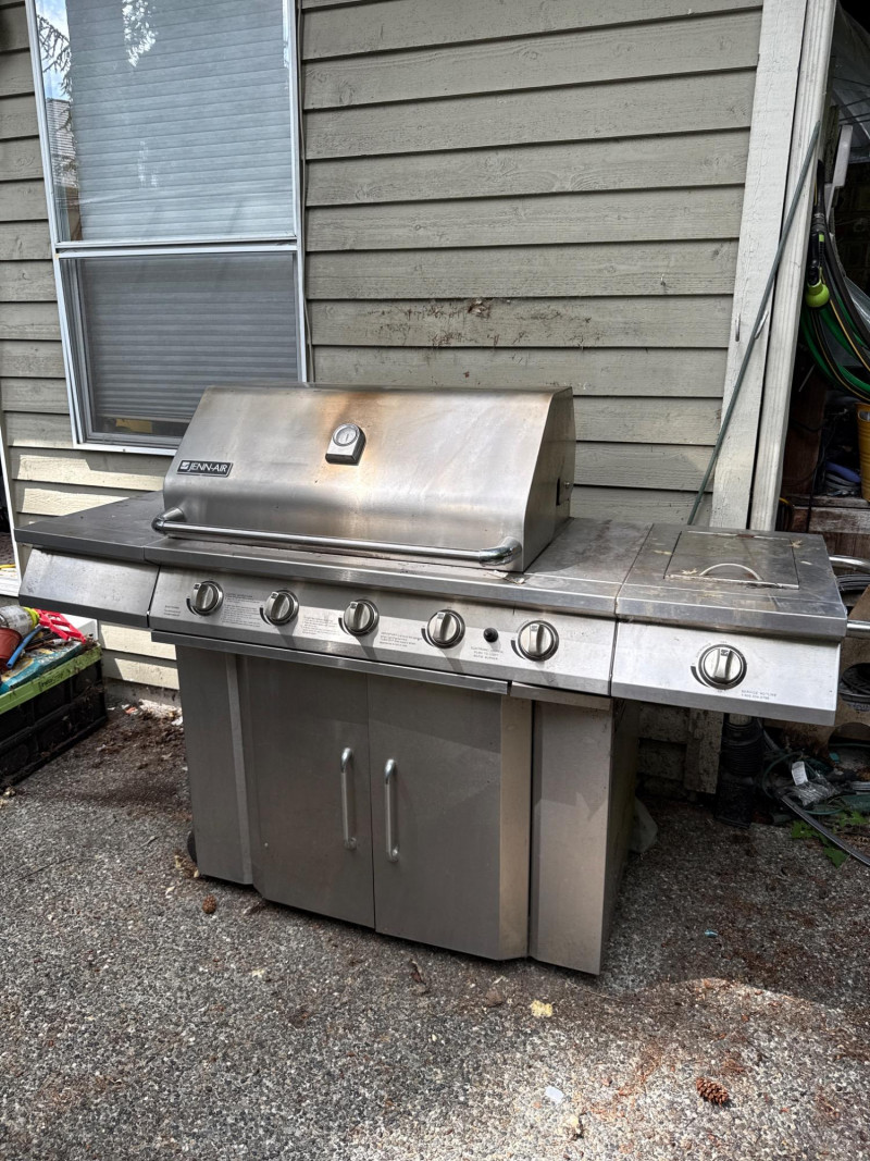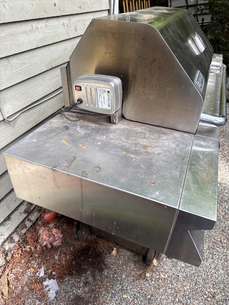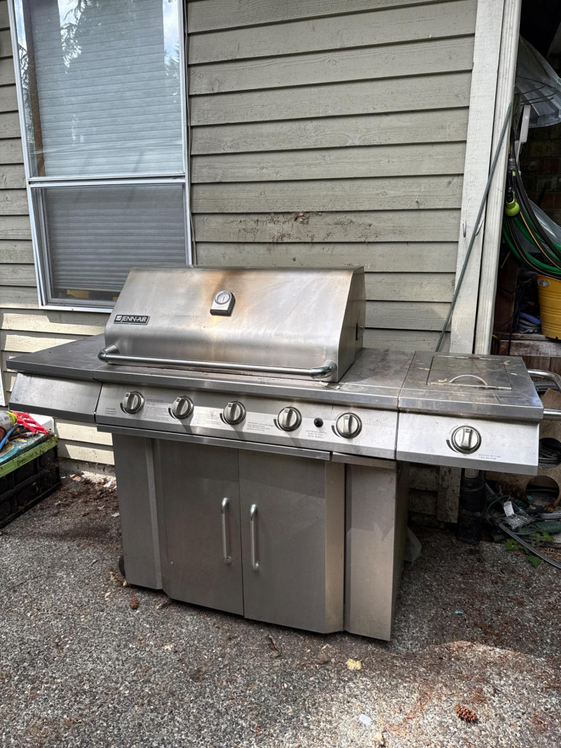 Large Jenn Air natural gas grill and BBQ. Has an external burner, external fan control, multiple tools below. Two covers, one canvas and one plastic insulated(ill-fitting) Currently hooked to house fuel source. Needs a thorough cleaning and did power up. 3 of the 4 ballasts flamed up. The other had fuel but didn't spark. Needs cleaned. HEAVY, MUST BRING HELP TO LOAD.