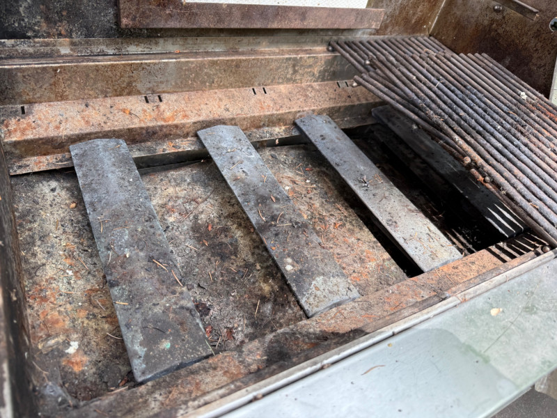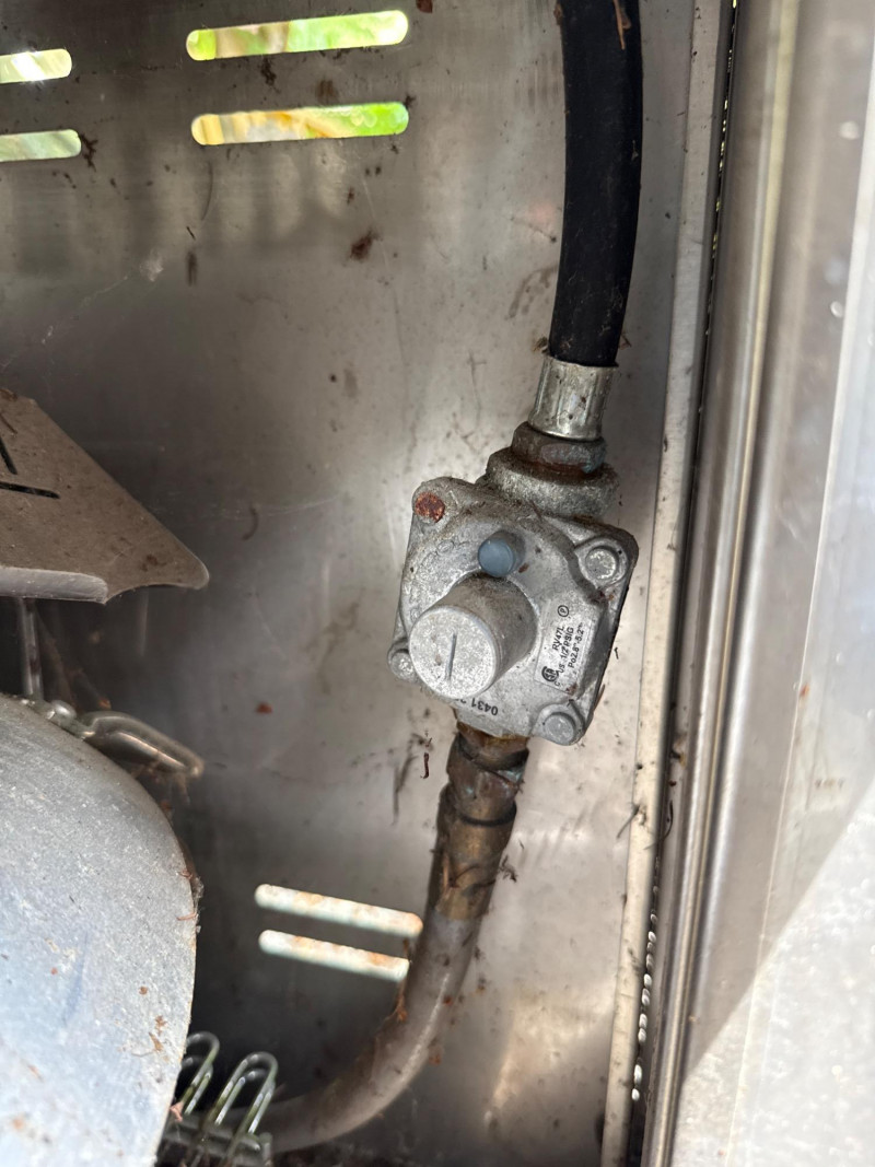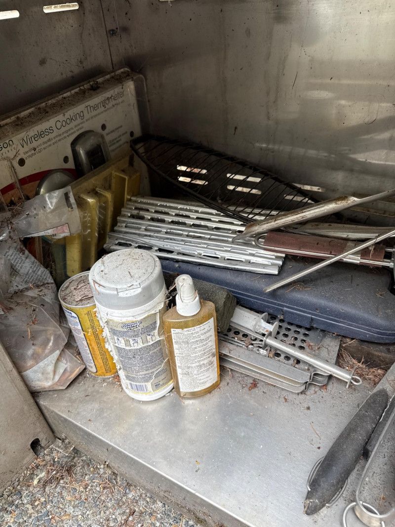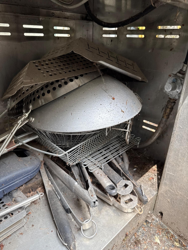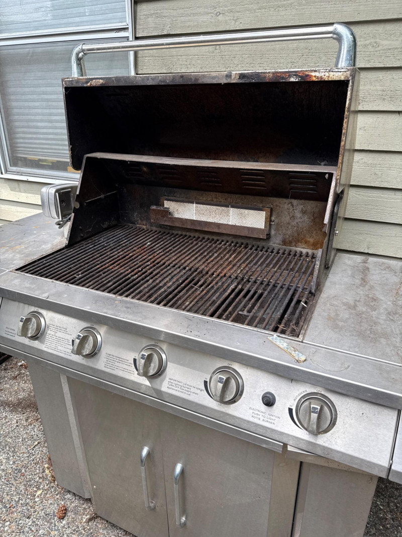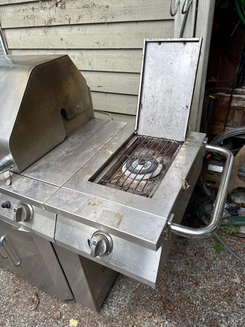Large Jenn Air natural gas grill and BBQ. Has an external burner, external fan control, multiple tools below. Two covers, one canvas and one plastic insulated(ill-fitting) Currently hooked to house fuel source. Needs a thorough cleaning and did power up. 3 of the 4 ballasts flamed up. The other had fuel but didn't spark. Needs cleaned. HEAVY, MUST BRING HELP TO LOAD.