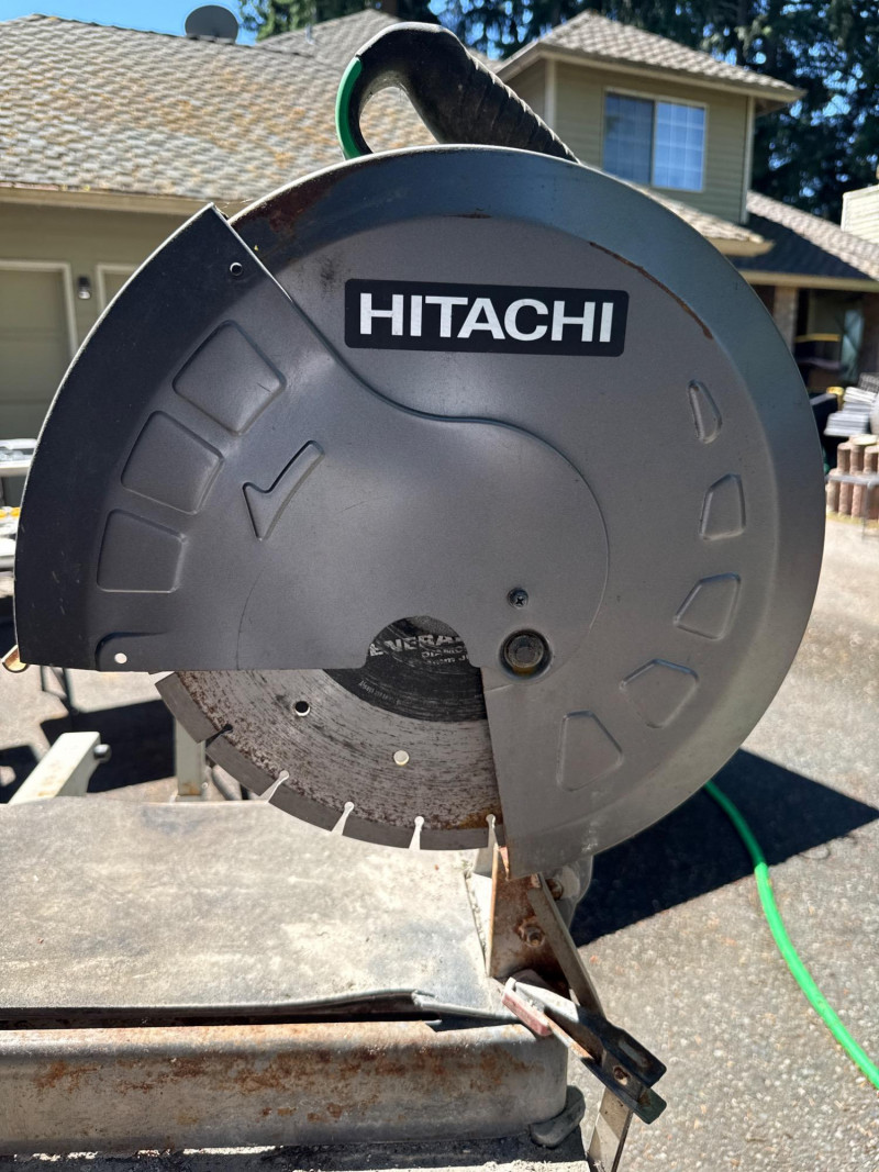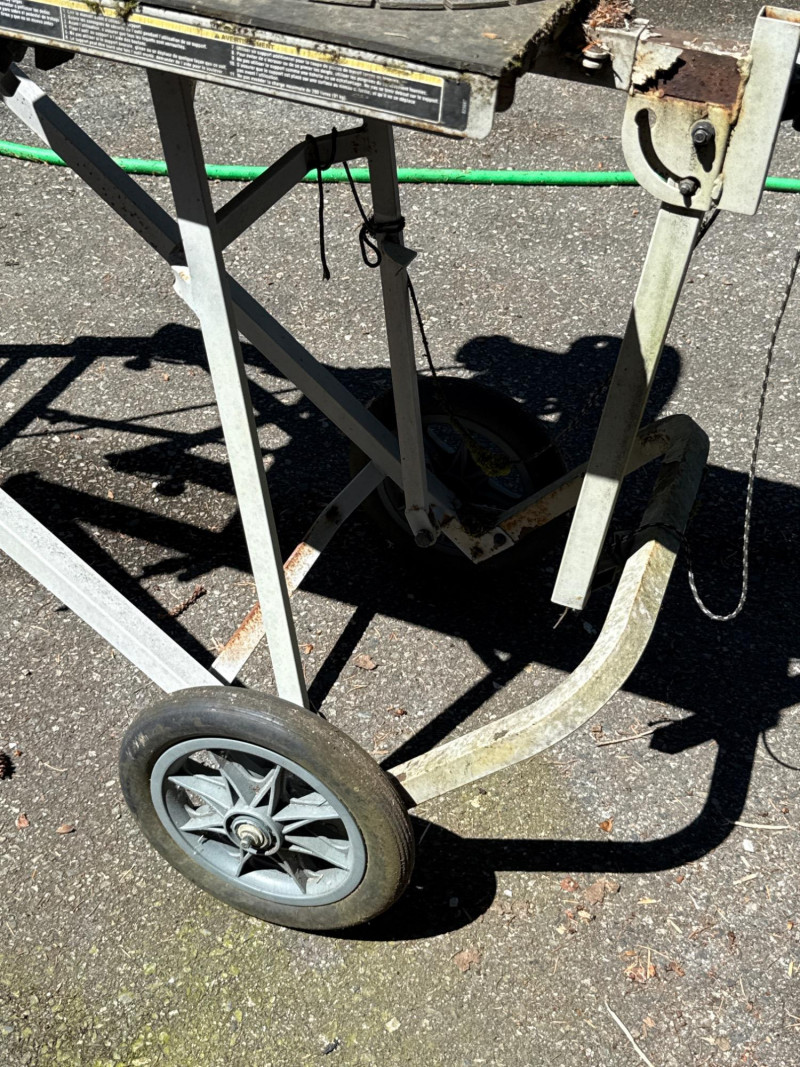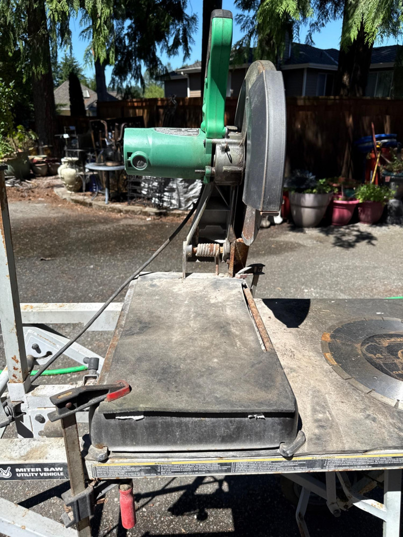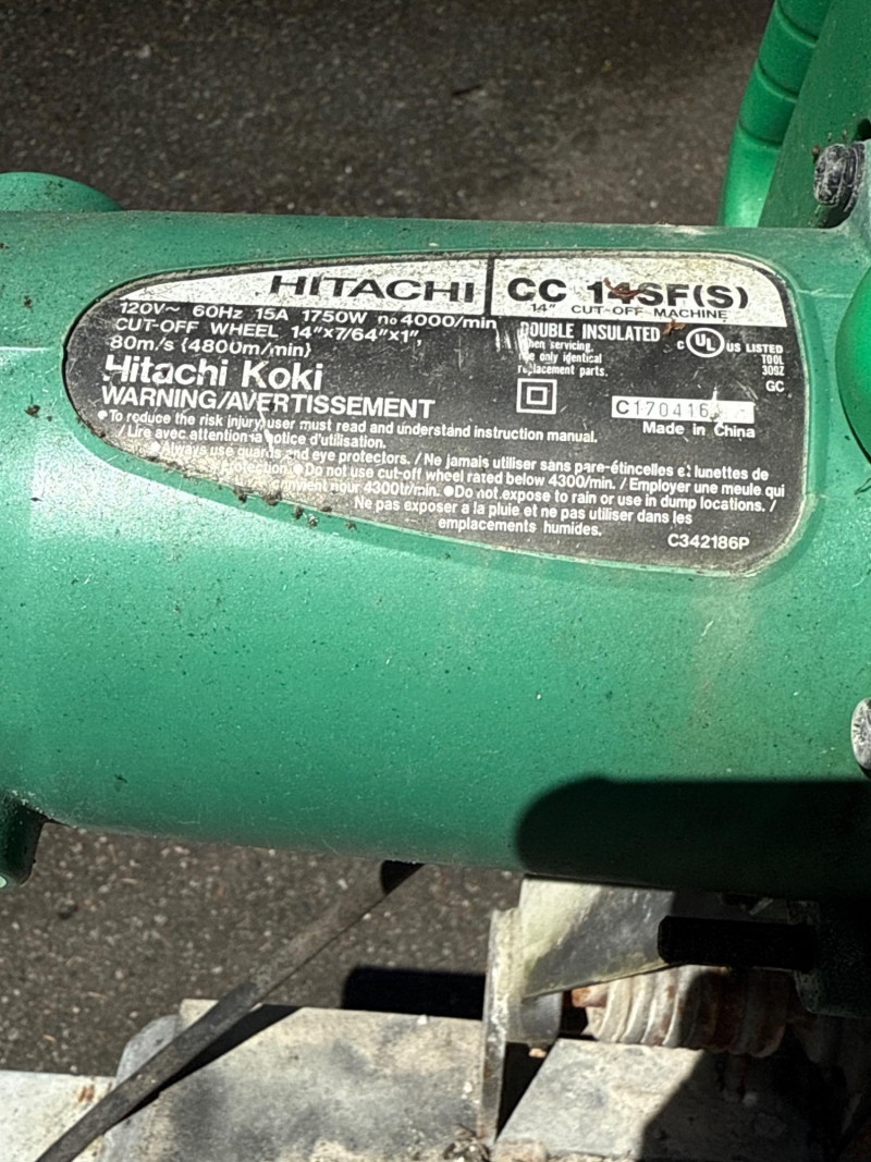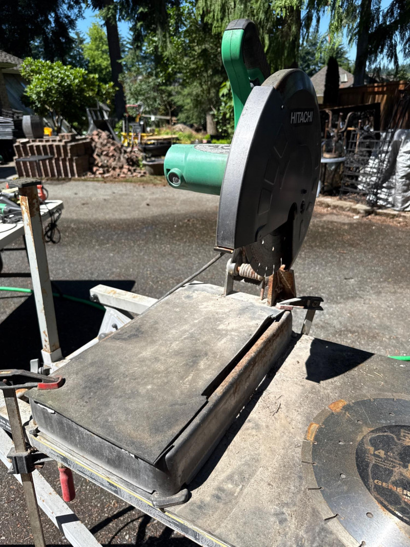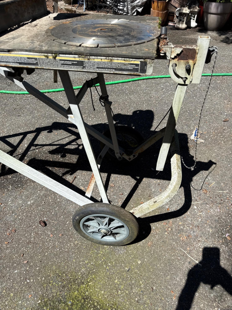 Hitachi 14in cut-off saw on portable, Ridgid rolling stand. Can collapse for transport. Two Extra blades included. One is diamond cut