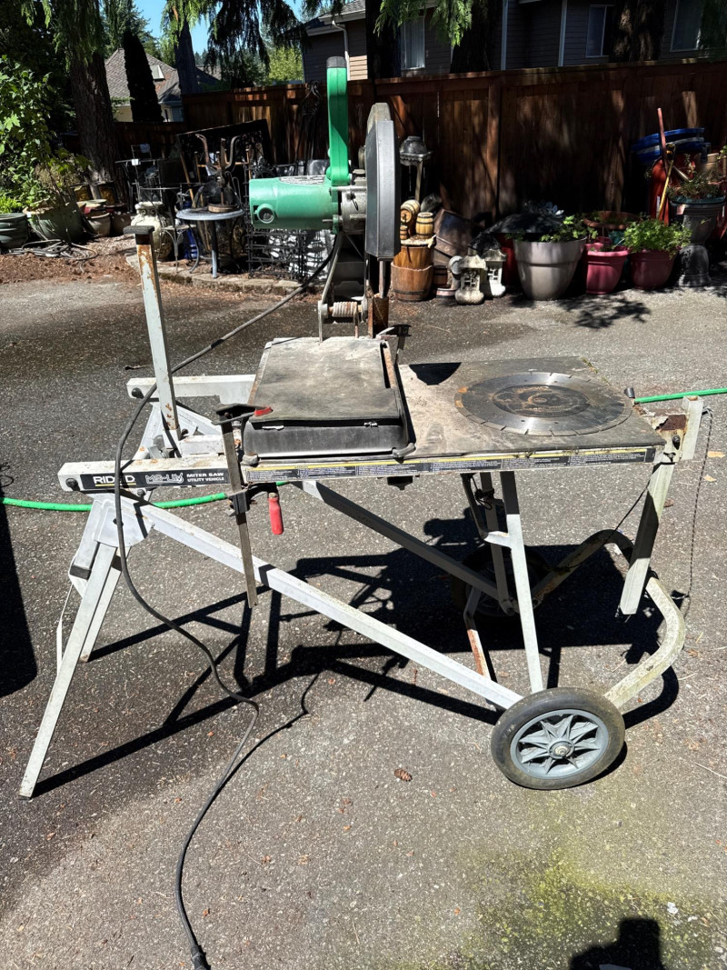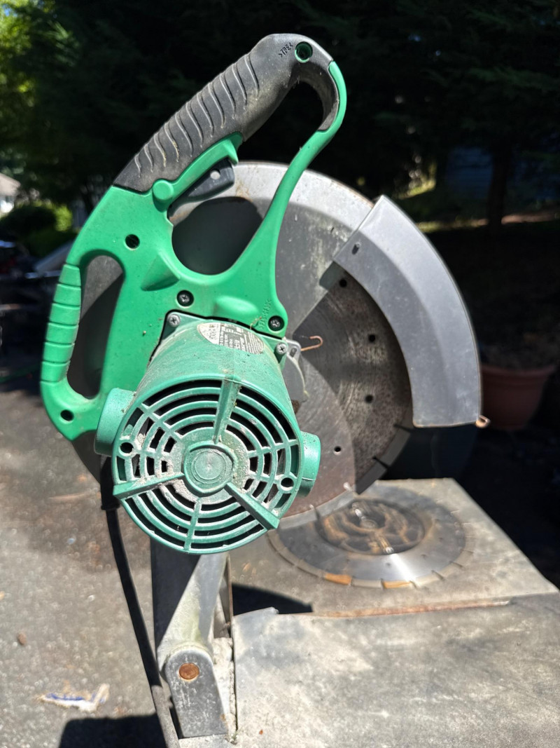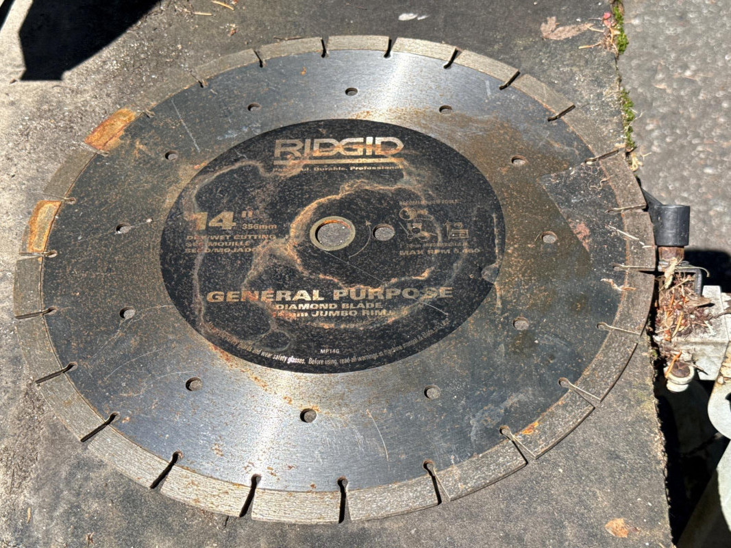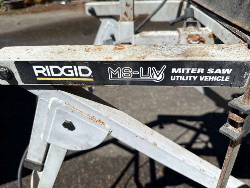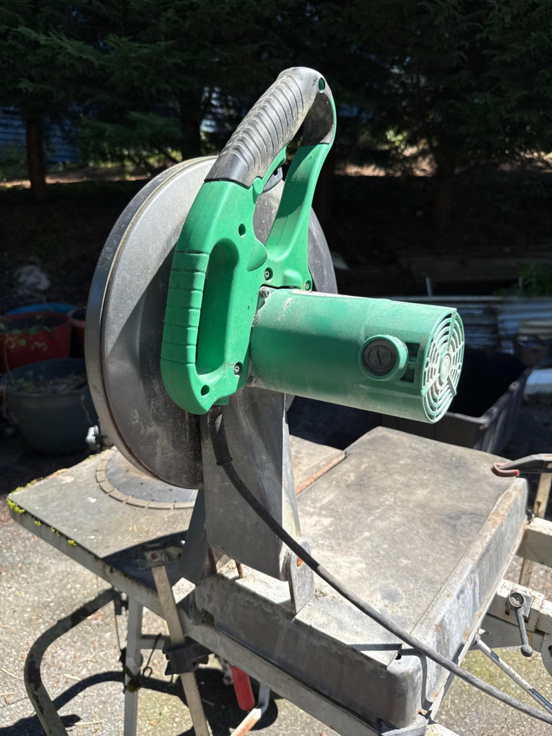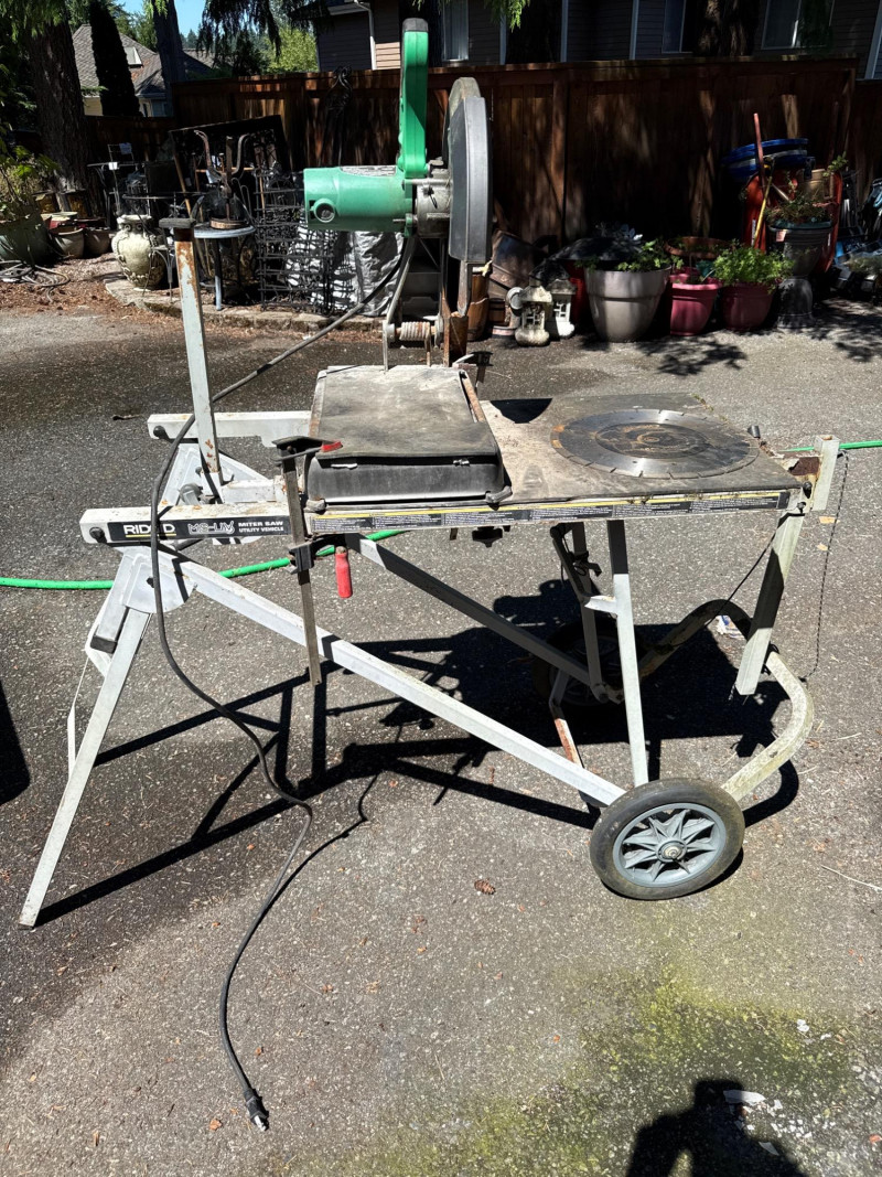 Hitachi 14in cut-off saw on portable, Ridgid rolling stand. Can collapse for transport. Two Extra blades included. One is diamond cut