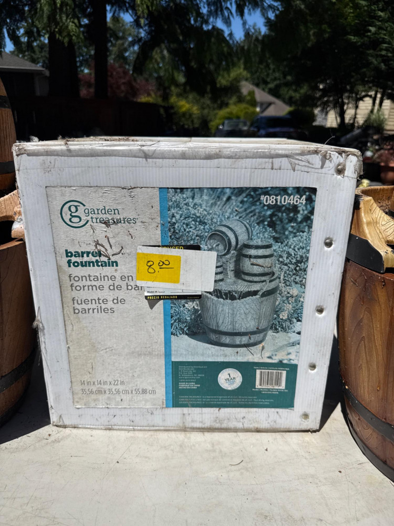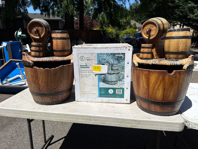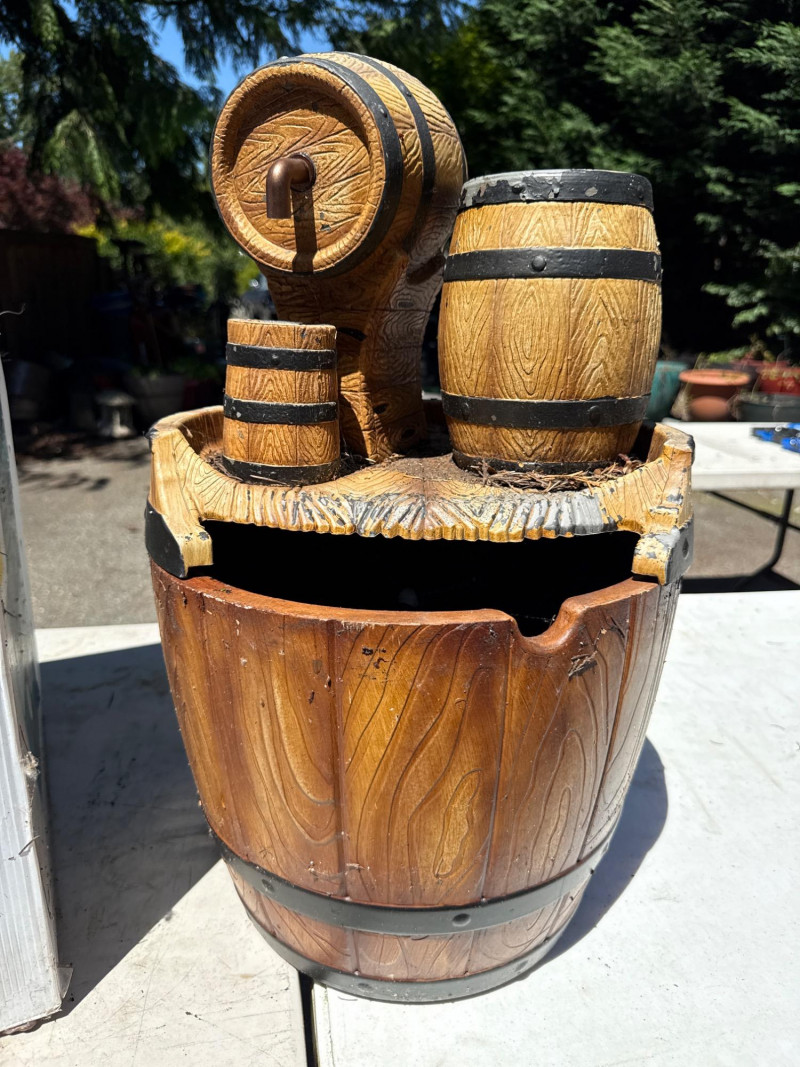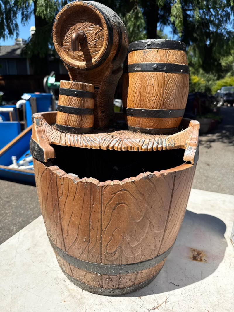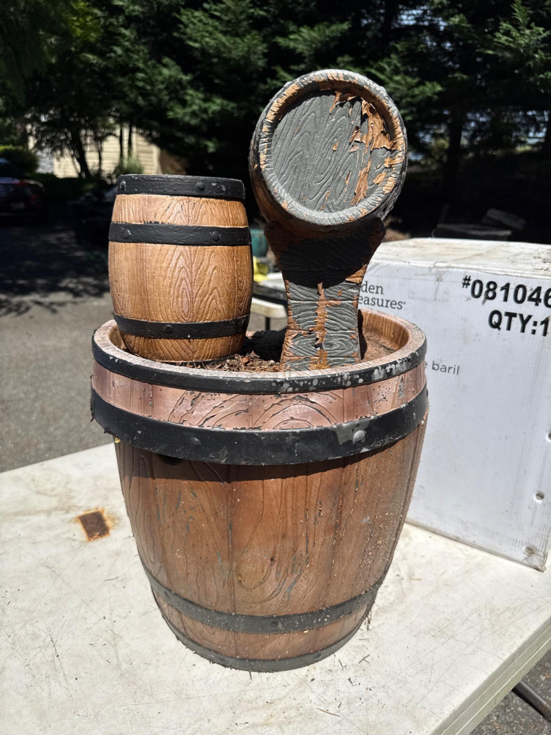 Three identical barrel fountains. One is new in box. Plastic and lightweight. Two need some refresh with paint. No defects found. Pump is not available for two used ones, unless inside lid.