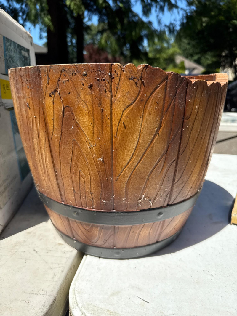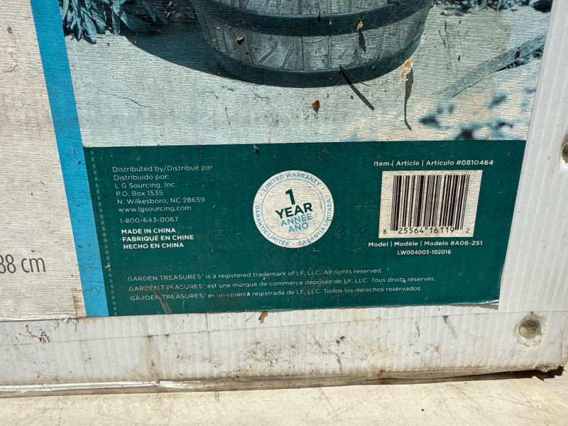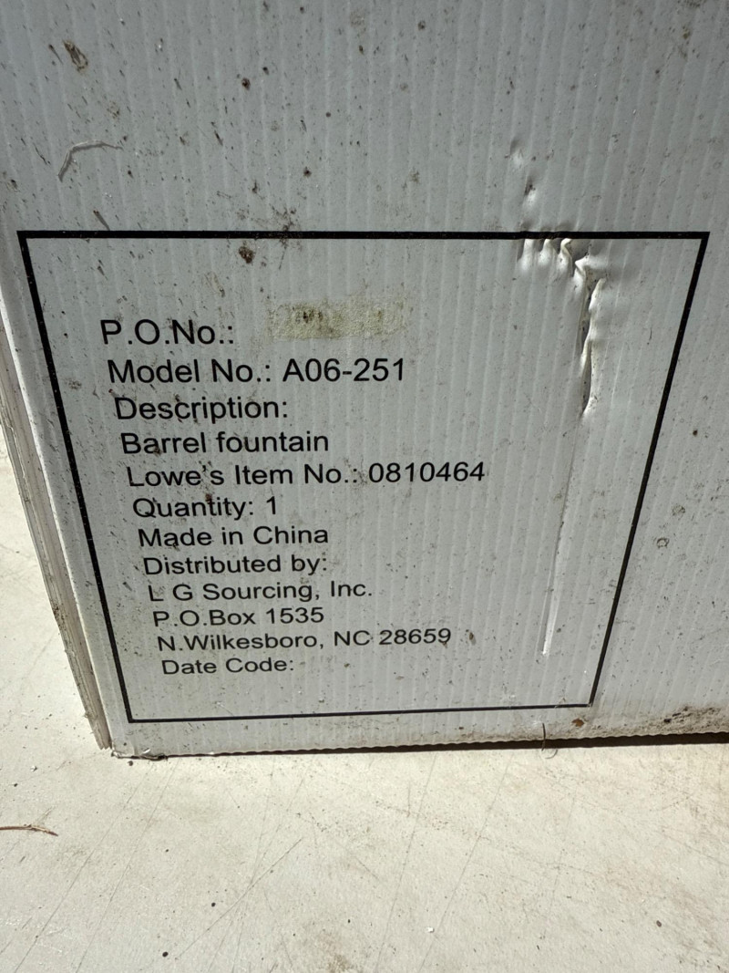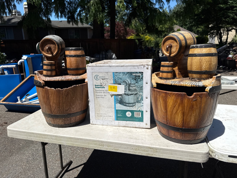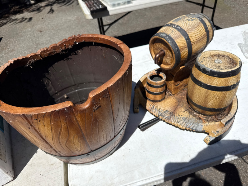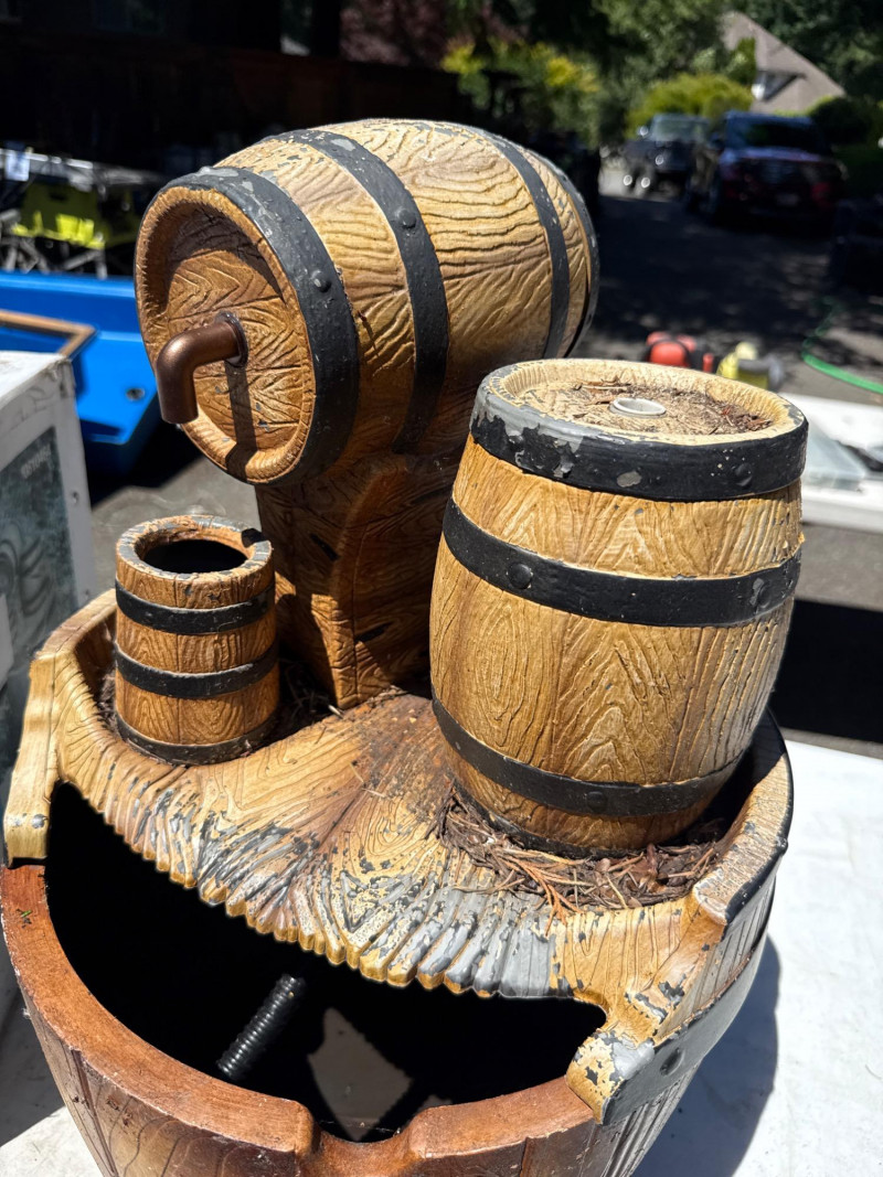 Three identical barrel fountains. One is new in box. Plastic and lightweight. Two need some refresh with paint. No defects found. Pump is not available for two used ones, unless inside lid.