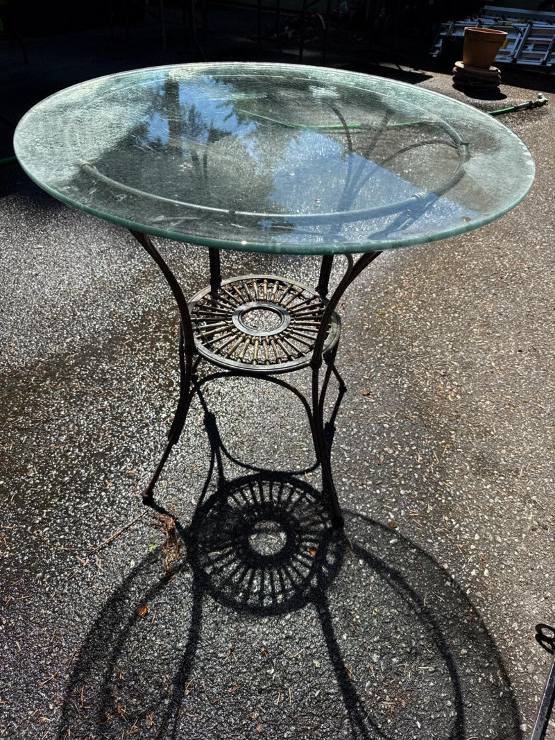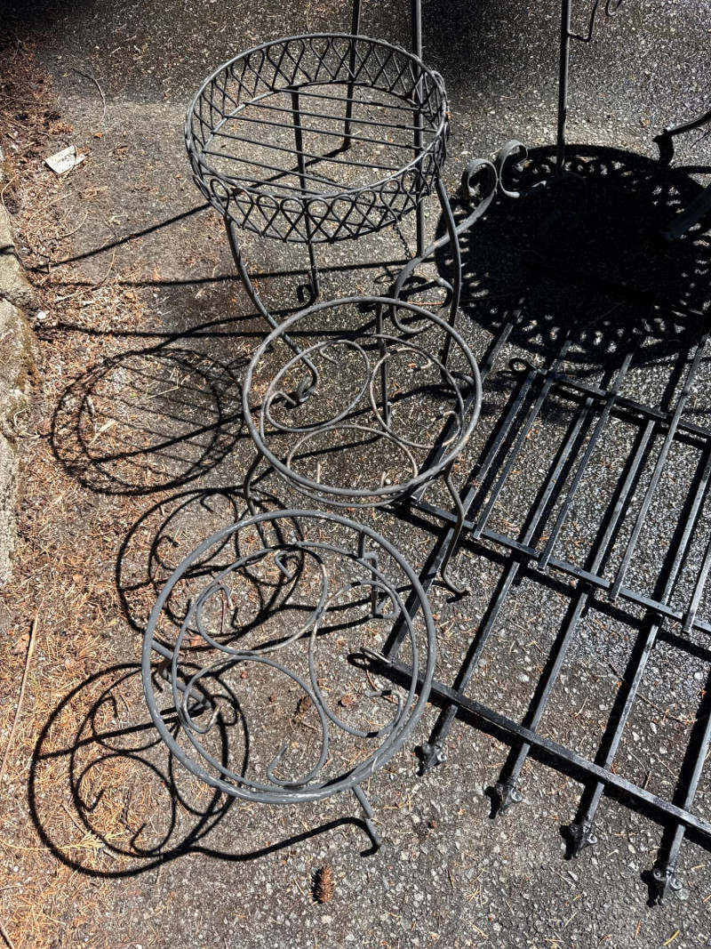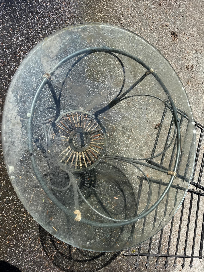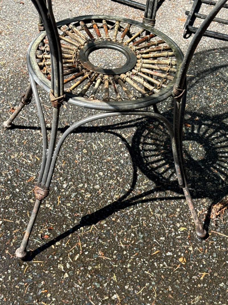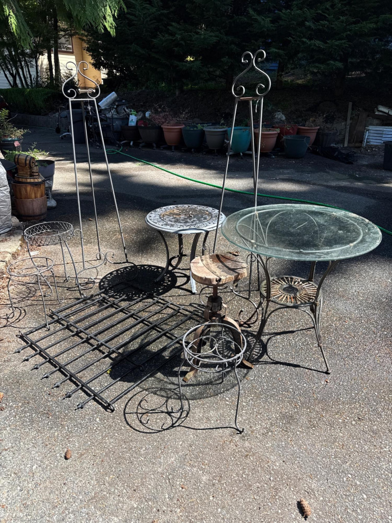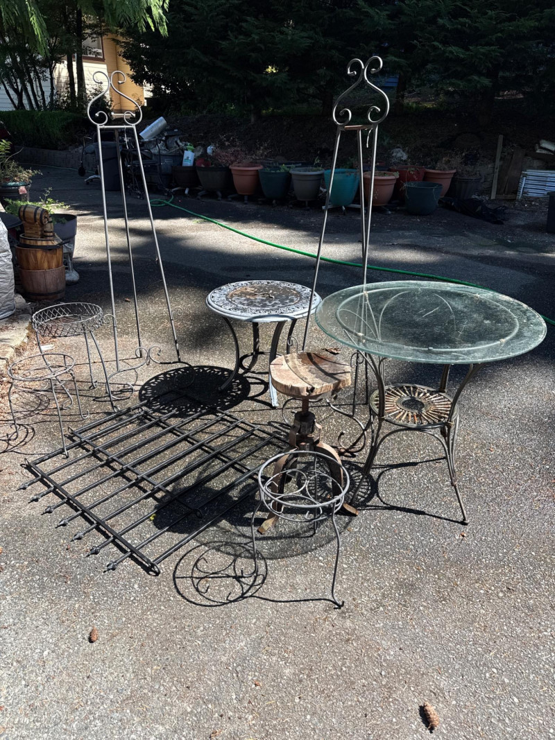 Variety of outdoor decor options. 8 items Glass, metal and bamboo table is 30in wide, 29.5in tall. Glass is in good condition. Heavy Fence sections are 28in tall, 38in long. Two pieces Tall tripod stands. Metal with some rust. Small round metal table with lid. Interior bowl will be added if found. Small vintage metal and wood stool. Swivels for height Assorted metal plant stands