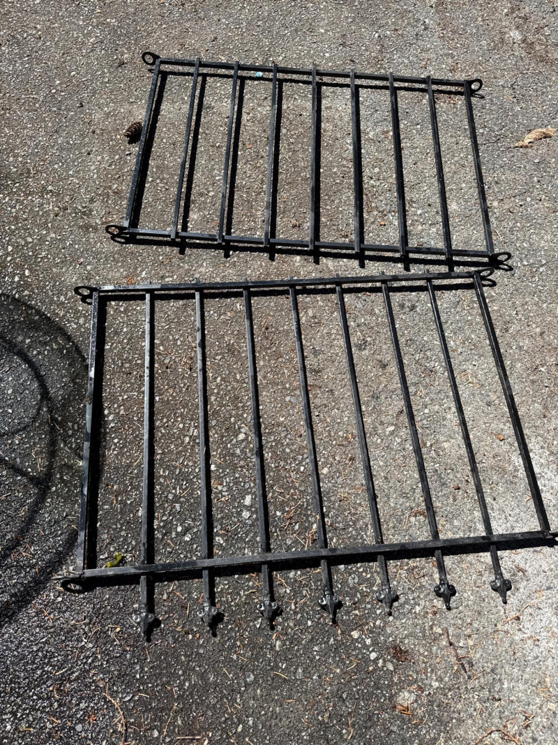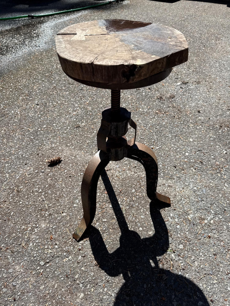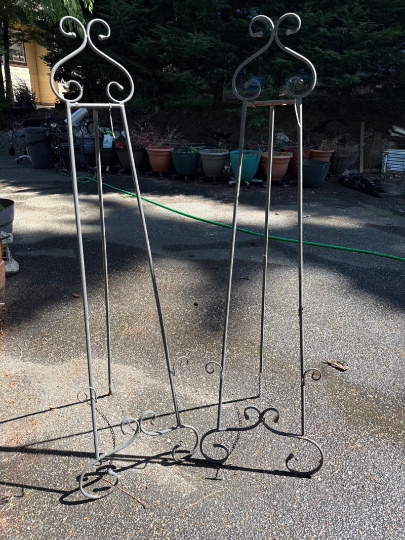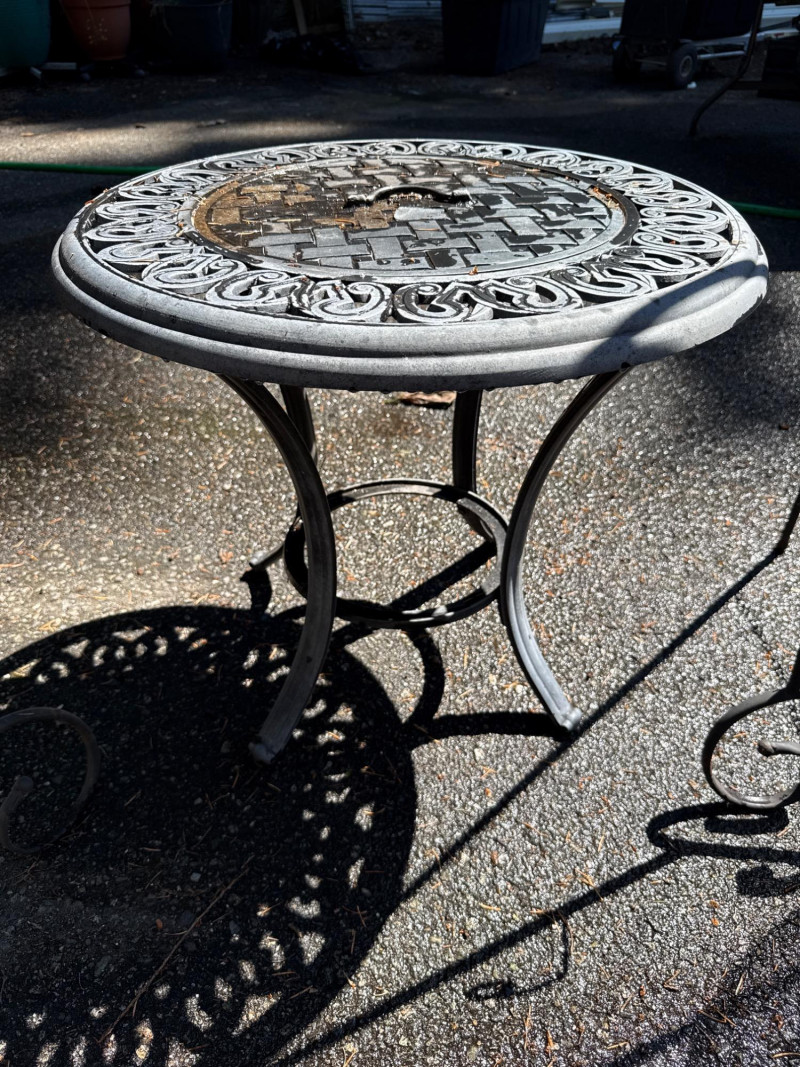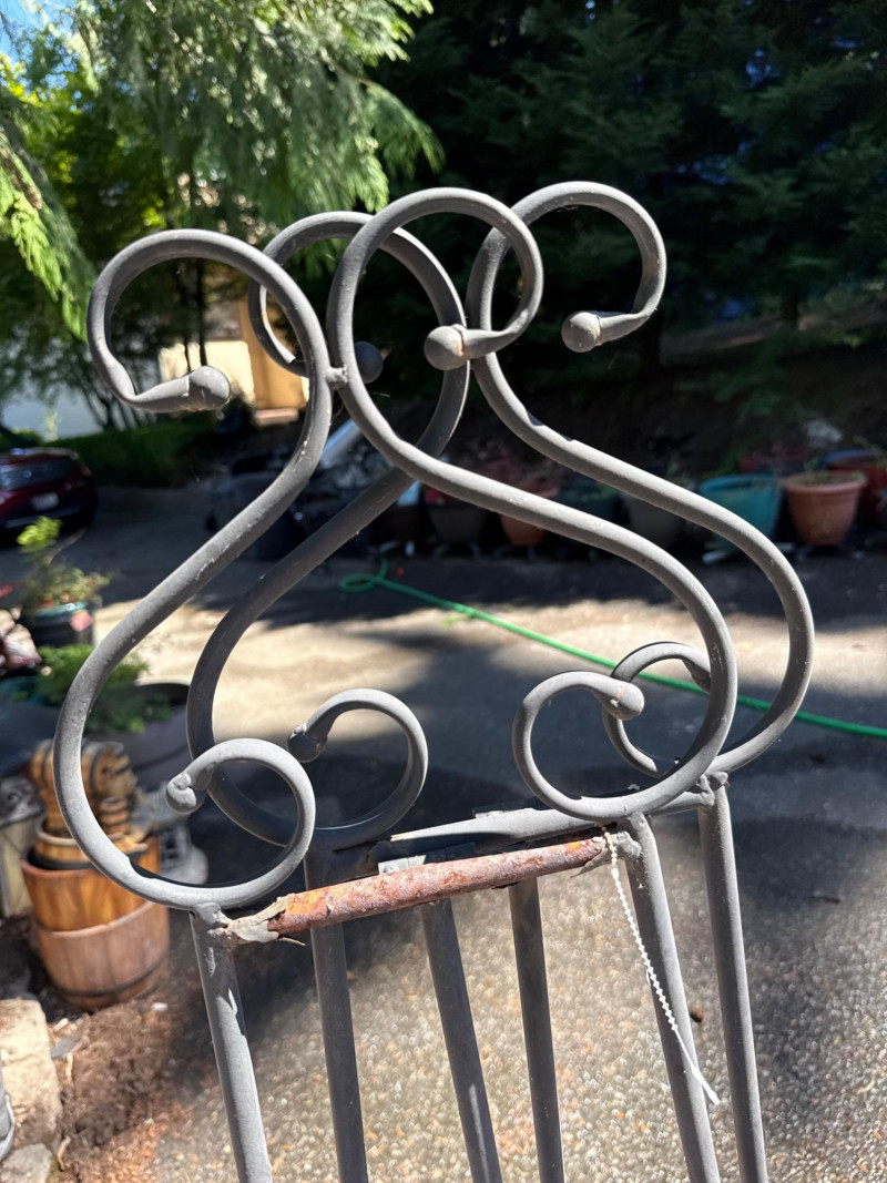 Variety of outdoor decor options. 8 items Glass, metal and bamboo table is 30in wide, 29.5in tall. Glass is in good condition. Heavy Fence sections are 28in tall, 38in long. Two pieces Tall tripod stands. Metal with some rust. Small round metal table with lid. Interior bowl will be added if found. Small vintage metal and wood stool. Swivels for height Assorted metal plant stands