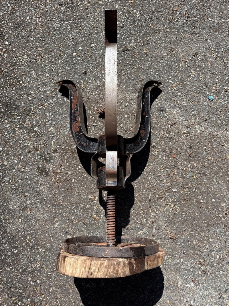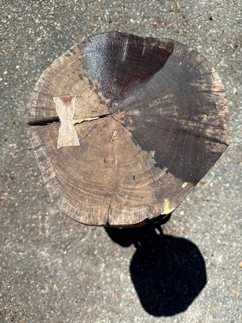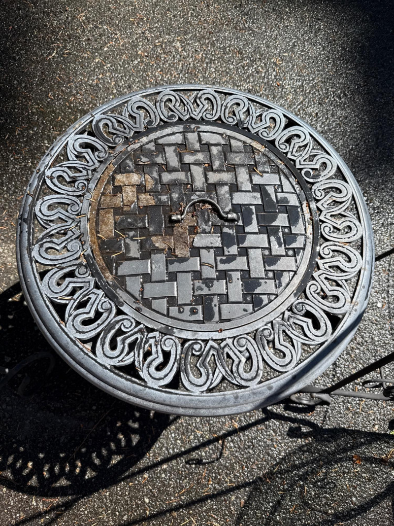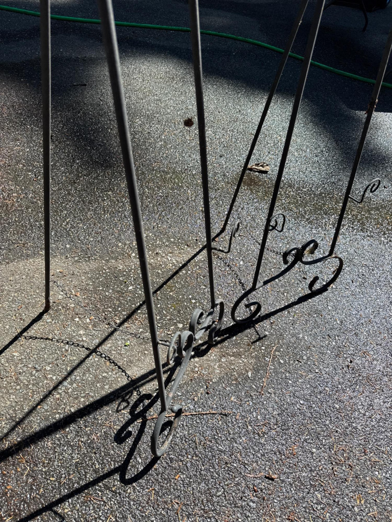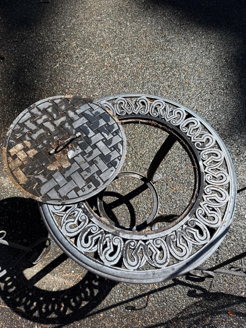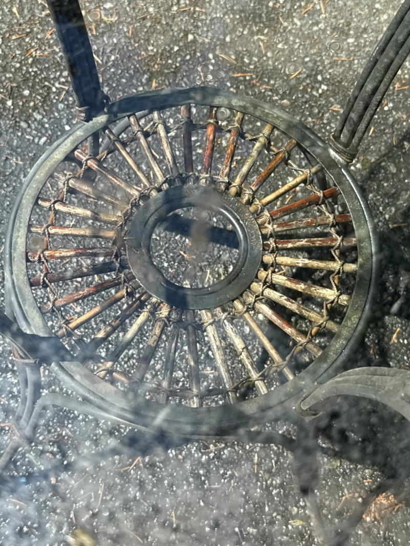 Variety of outdoor decor options. 8 items Glass, metal and bamboo table is 30in wide, 29.5in tall. Glass is in good condition. Heavy Fence sections are 28in tall, 38in long. Two pieces Tall tripod stands. Metal with some rust. Small round metal table with lid. Interior bowl will be added if found. Small vintage metal and wood stool. Swivels for height Assorted metal plant stands