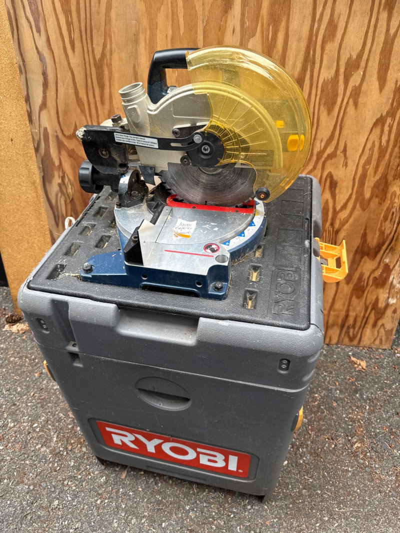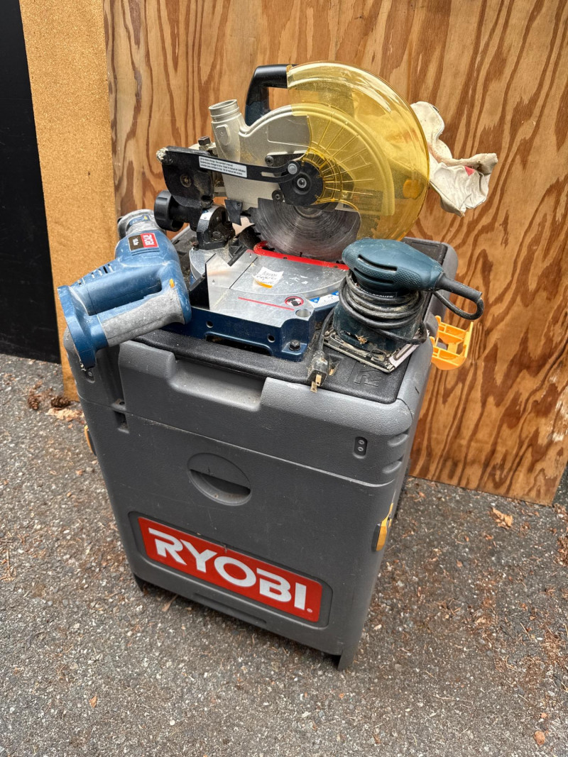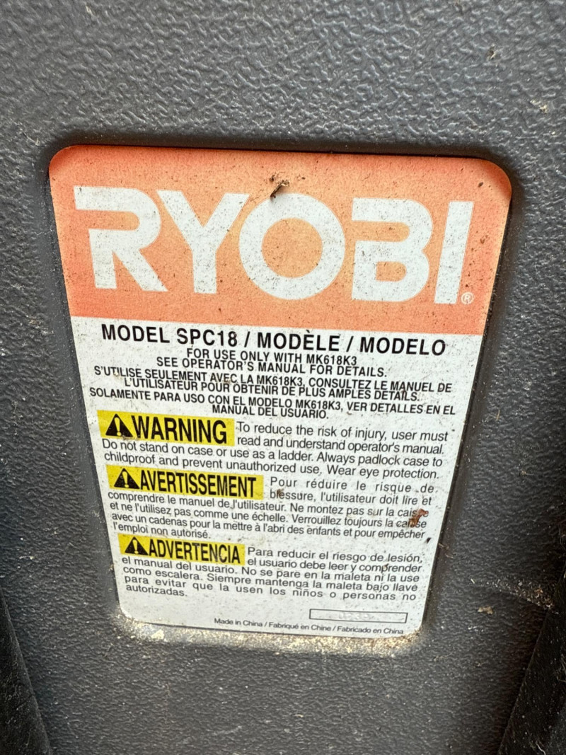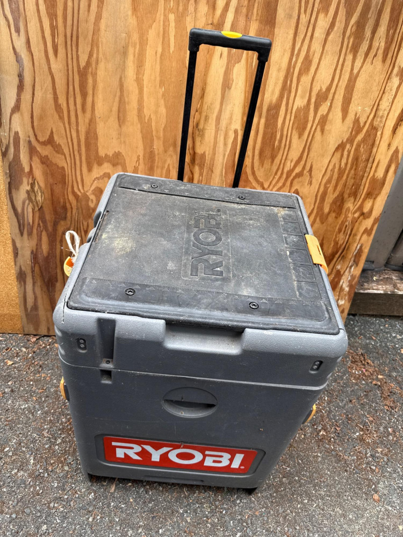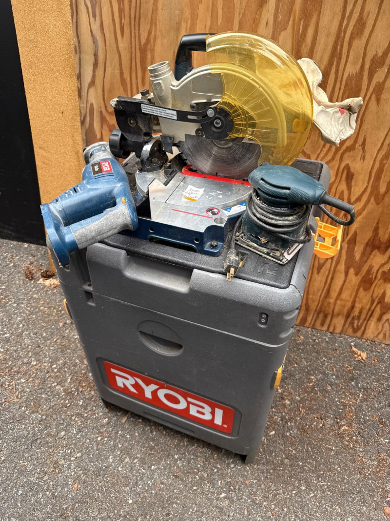 Rolling Ryobi tool shop. Tools require battery power. Model SPC18 Rolling box with drawers, ruler and adjustable handle. Model P500 5.5in circular saw. Model RJC181 reciprocating saw Model MS181 8 1/4in Miter Saw Additional tools include, flashlight, palm sander, detail tool, vacuum bag Tools require a battery and charger. If found will be added.